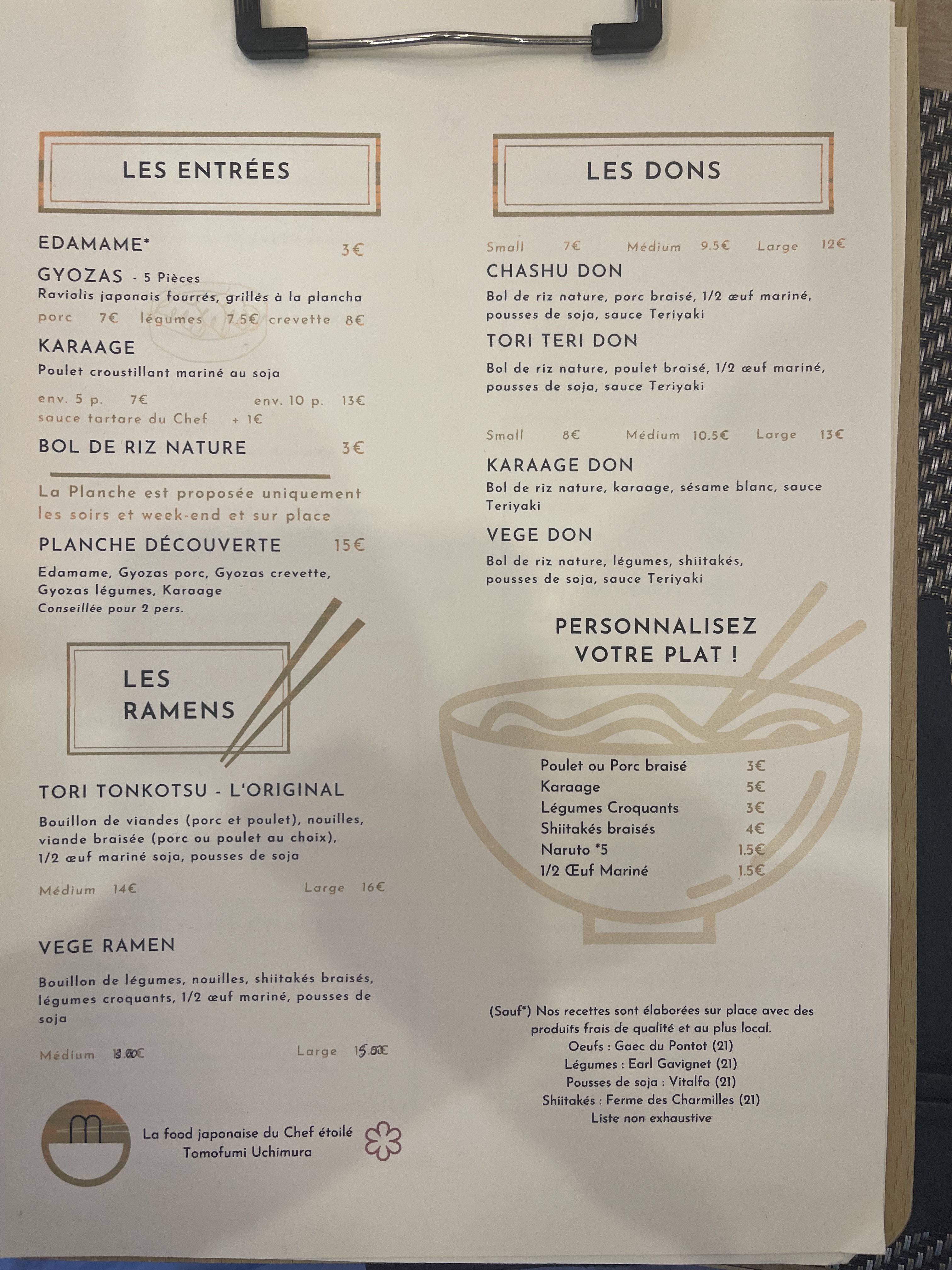 Bonsoir Monsieur Nous vous remercions pour votre commentaire. Le bouillon doit être versé très très chaud pour diluer les pâtes, c’est le désavantage du « à emporter » pour les ramens. Pour ce qui est du prix il est justifié par le fait de se fournir le plus possible par des produits bio et locaux (-50kms de Dijon). En espérant avoir répondu à vos attentes. Bonne soirée L’équipe de Ramen By Origine