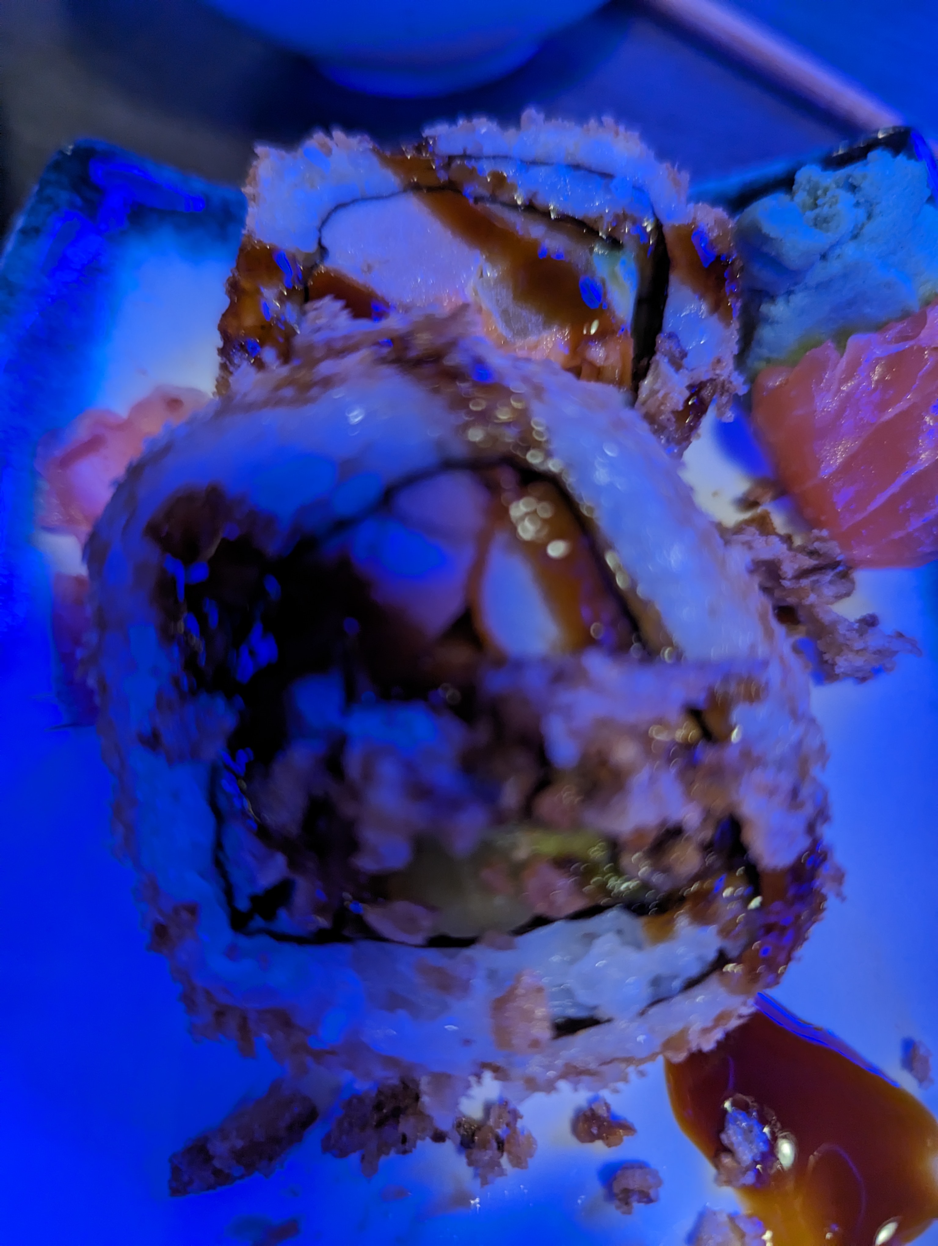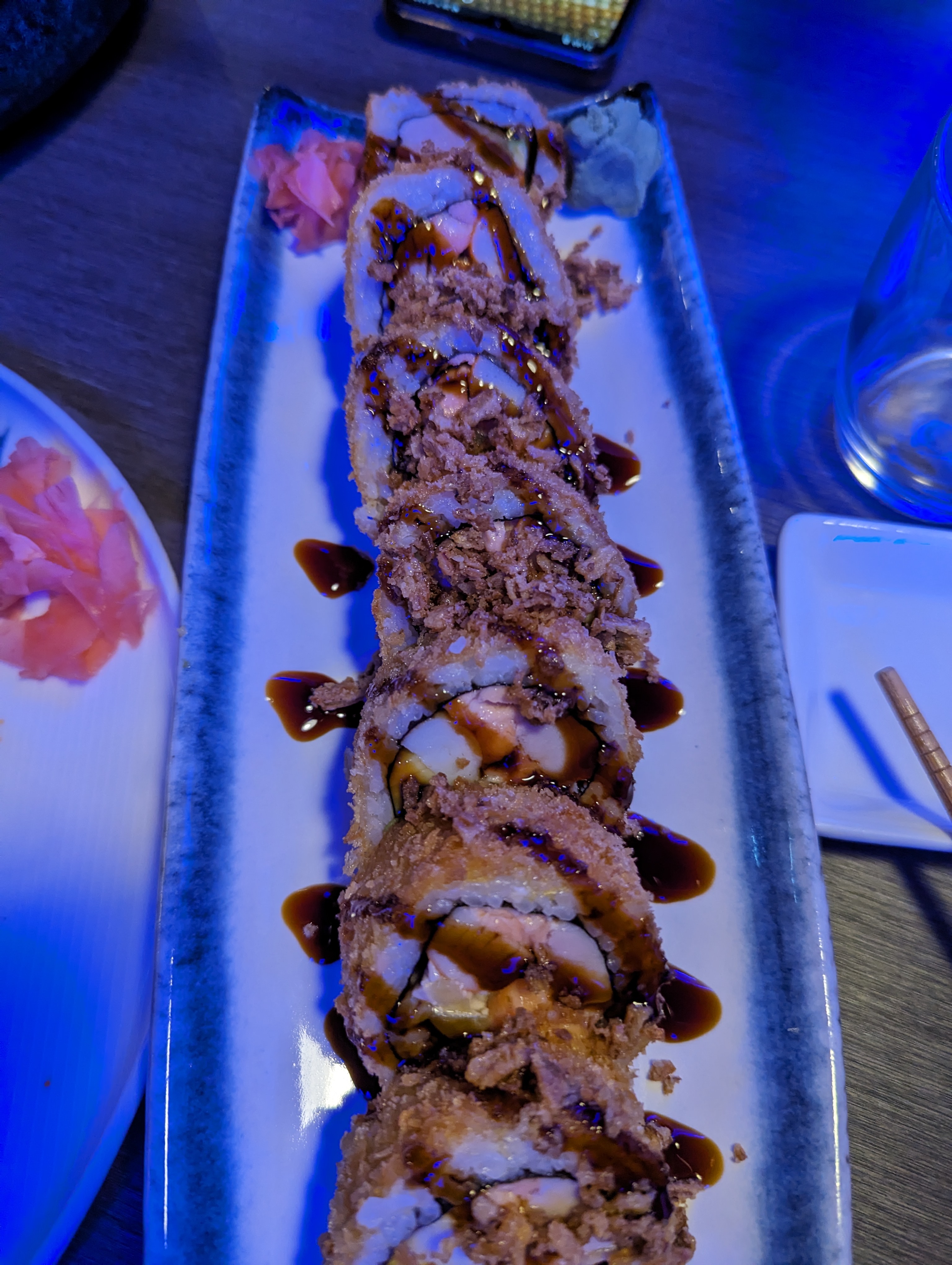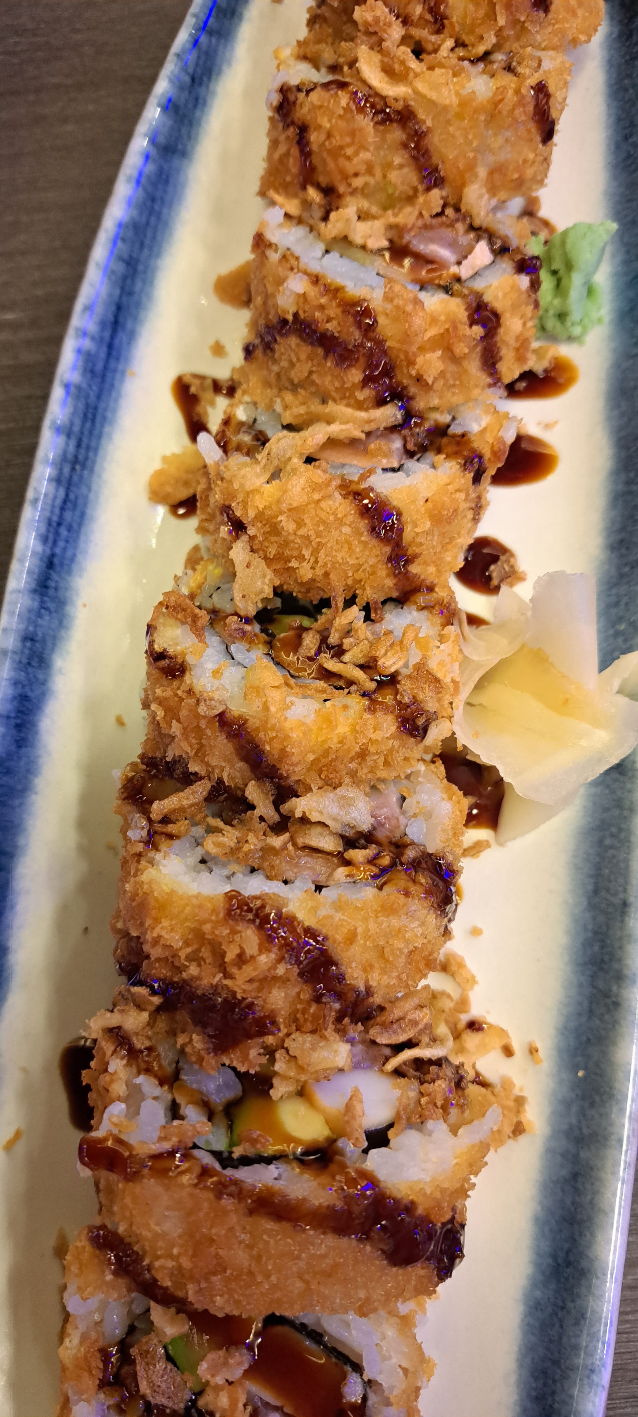« ROLL AU TEMPURA SAUMON » Extra-ordinaire…! Rarement mangé un aussi bon Suchi! Vraiment ce restaurant est impeccable: tout est bon même les plus petits plats comme le petit Saumon Roll au Cream Cheese: une merveille! Bravo Chef!
