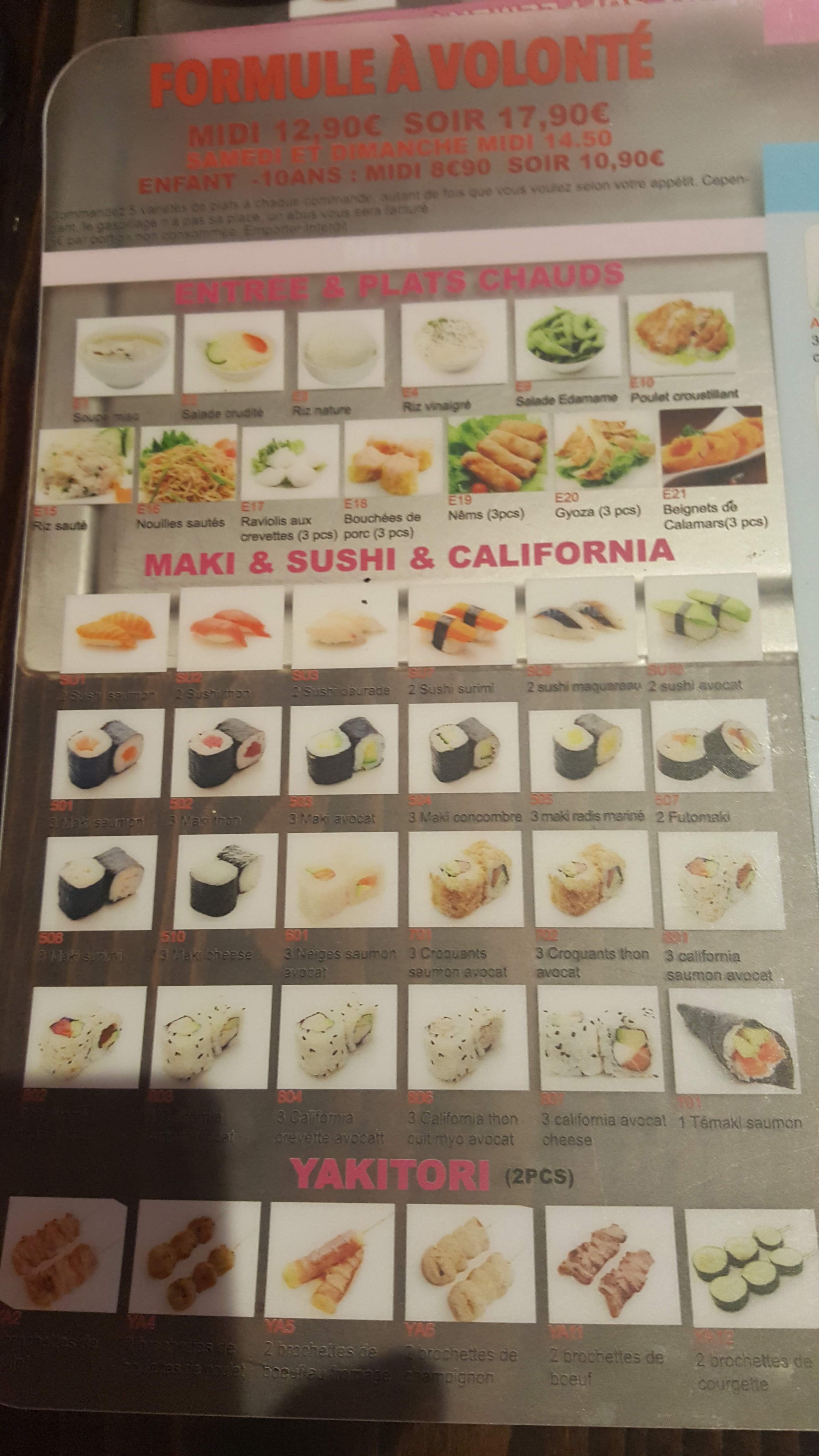 Nous venons avec plaisir dans ce restaurant où nous sommes bien accueillis. Nous nous régalons à chaque fois . Nous avons pris deux menus à volonté à 17,90€ le soir. Le menu à volonté le midi en semaine est à 12,90 €. Nous pouvons prendre jusqu’à 5 entrées/Plats maximum à chaque commande, le but étant d’éviter le gaspillage. C’est toujours très bon, aussi bien les sushis, sashimis, california, yakitoris, temakis, gyozas, makis...le service est rapide (sauf en plein rush, comme dans la plupart des restaurants). J’aime beaucoup la nouvelle décoration et la nouvelle carte. Si vous souhaitez y manger je vous conseille de réserver avant.