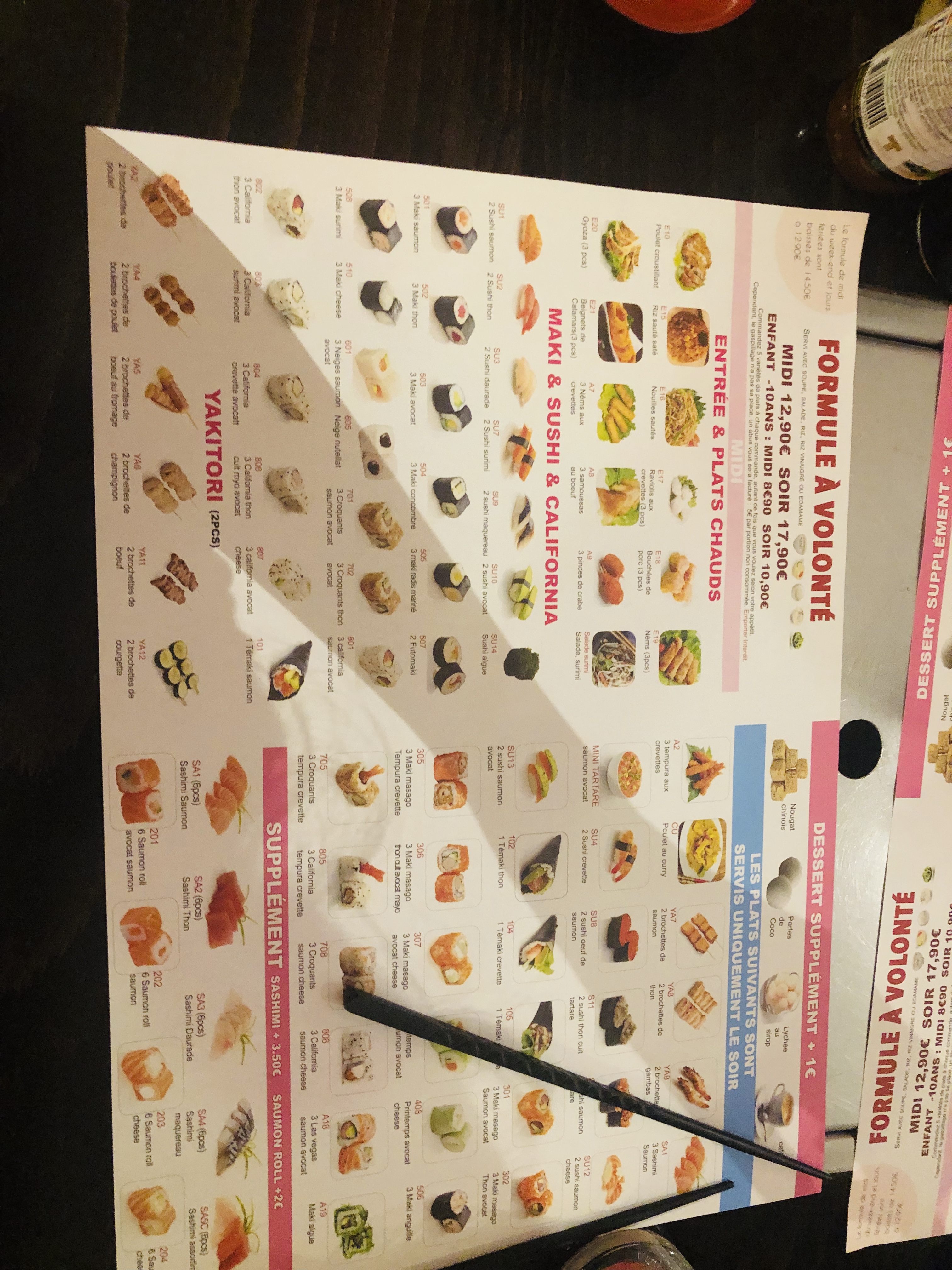 ATTENTION À L'ARNAQUE ET À L'AMBIANCE POURRIE Après avoir commandé les 5 premières portions de la formule à volonté, j'ai demandé lors du second passage, une portion que j'avais déjà prise : SA1 (Sashimi Saumon) La serveuse me dit que c'est en supplément (3 euros les 3 sushimis saumon). What!!!!!! What!!!!!! What!!!!!! Calmement (mais un peu surpris car nous venons régulièrement et que c'est la première que j'entends ça) je lui rappelle que j'ai pris une formule à volonté et lui demande une explication. Après avoir affirmé sans explication! que c'était comme ça, mon amie me dit de laisser tomber (du coup, elle a pris le SA1 dans sa commande 😁). Et la serveuse part. 5 minutes plus tard, elle revient avec le chef cuisinier (le patron), il nous fait des gestes désagréables (met en boule notre commande, tire sur le bras de sa serveuse violement et nous regarde avec un regard assassin en parlant dans sa langue) et nous montre la porte. La serveuse nous dit que c'est fini, en rajoutant qu'ils ne nous serviront plus et nous dit de partir pour libérer de la place! ...... C'est la première fois que je me fais virer d'un restaurent. De plus, pour une question qui me paraît assez logique quand l'on prend une Formule à volonté. ATTENTION À L'ARNAQUE ET À L'AMBIANCE POURRIE PS: Je vous mets la carte en annexe