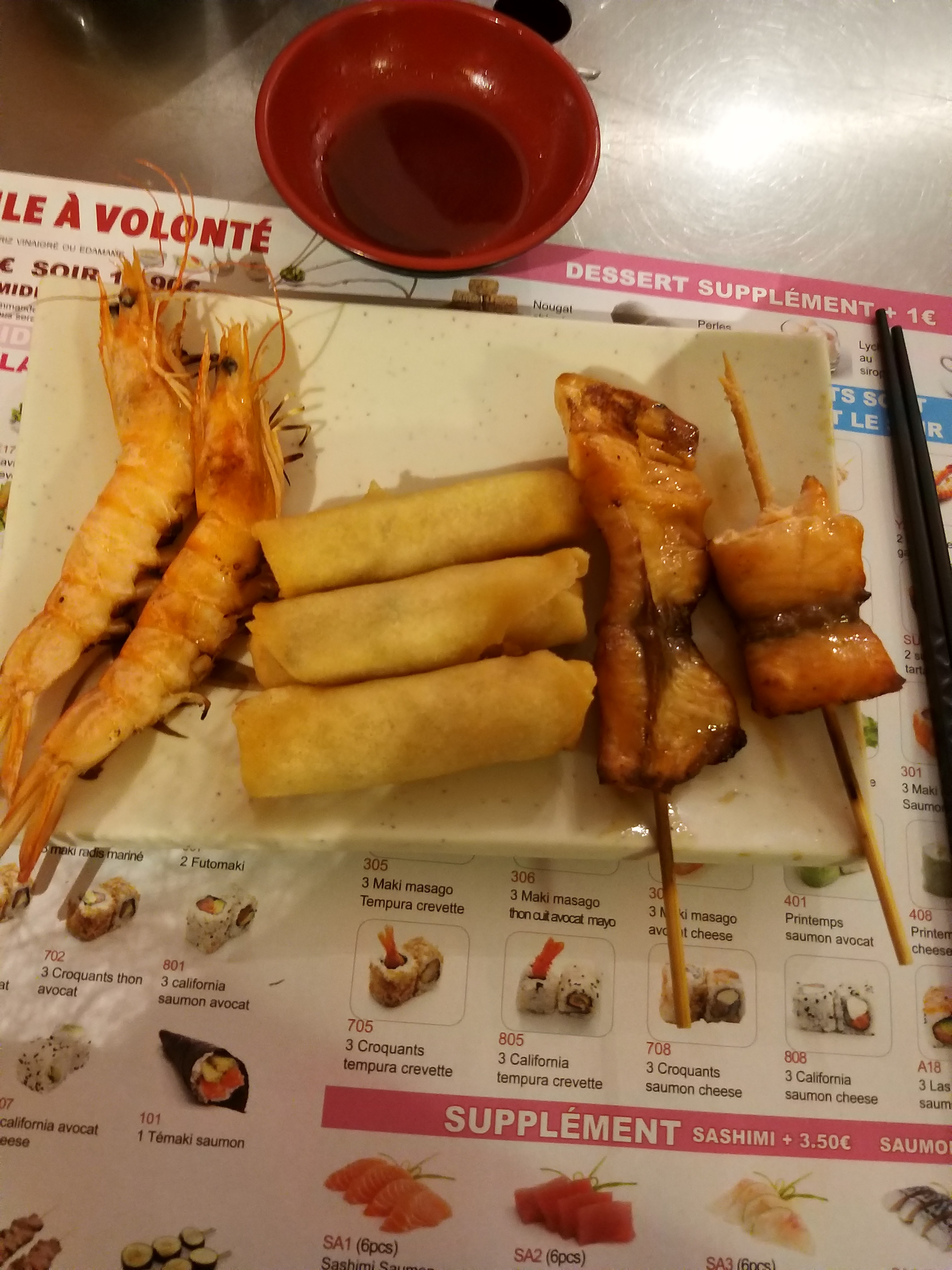 Les sushis sont bons, à volonté. Pas de place pour se garer à côté, il faut aller sur la place Verdun. Livraison à domicile ou à emporter aussi. Je recommande.