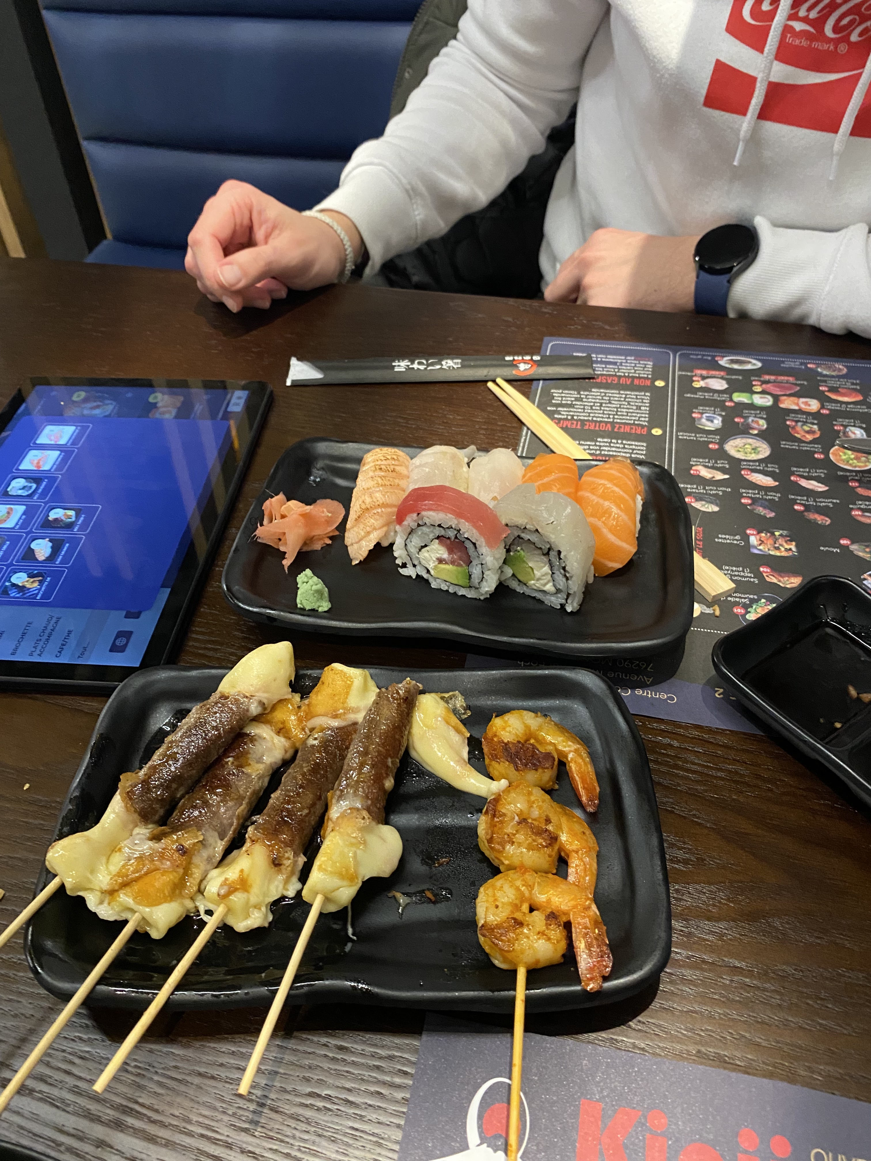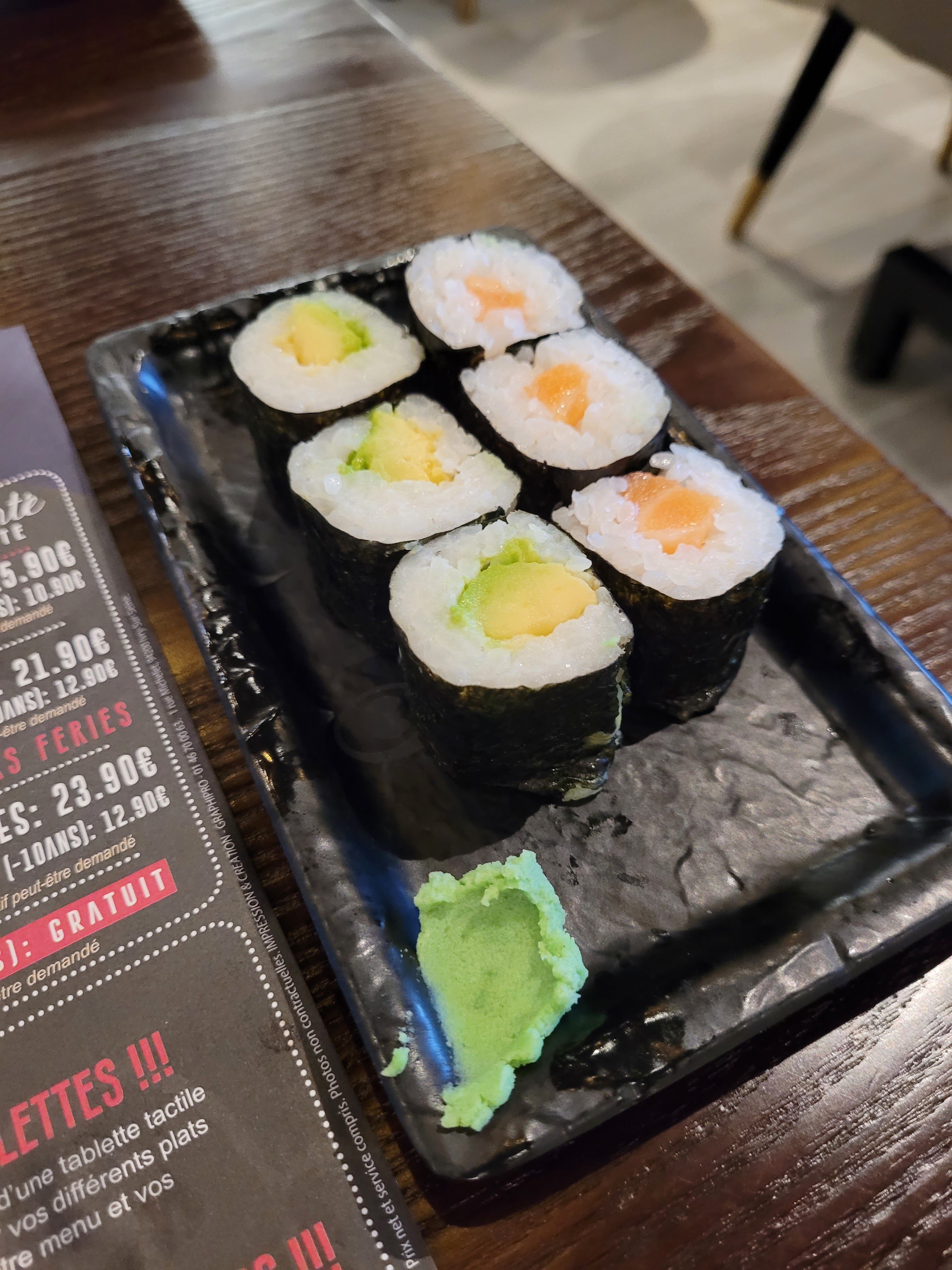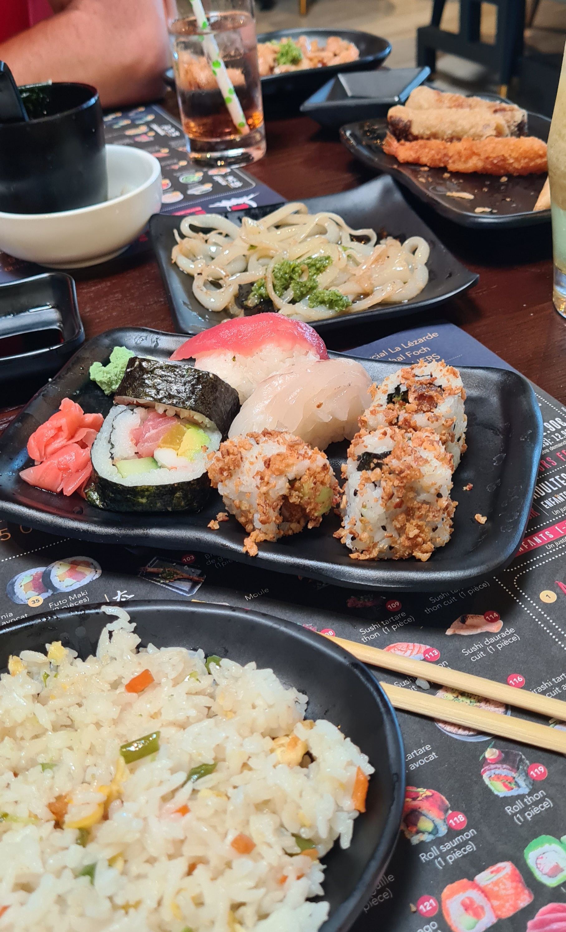 Cadre sympathique. Commande sur tablette appréciable. Peu de choix en sushi, dommage pour un japonais. Les sushis sont fades et manques de goût. Le temps d’attente par commande n’est pas gênant mais pas top quand on veut juste une boisson.