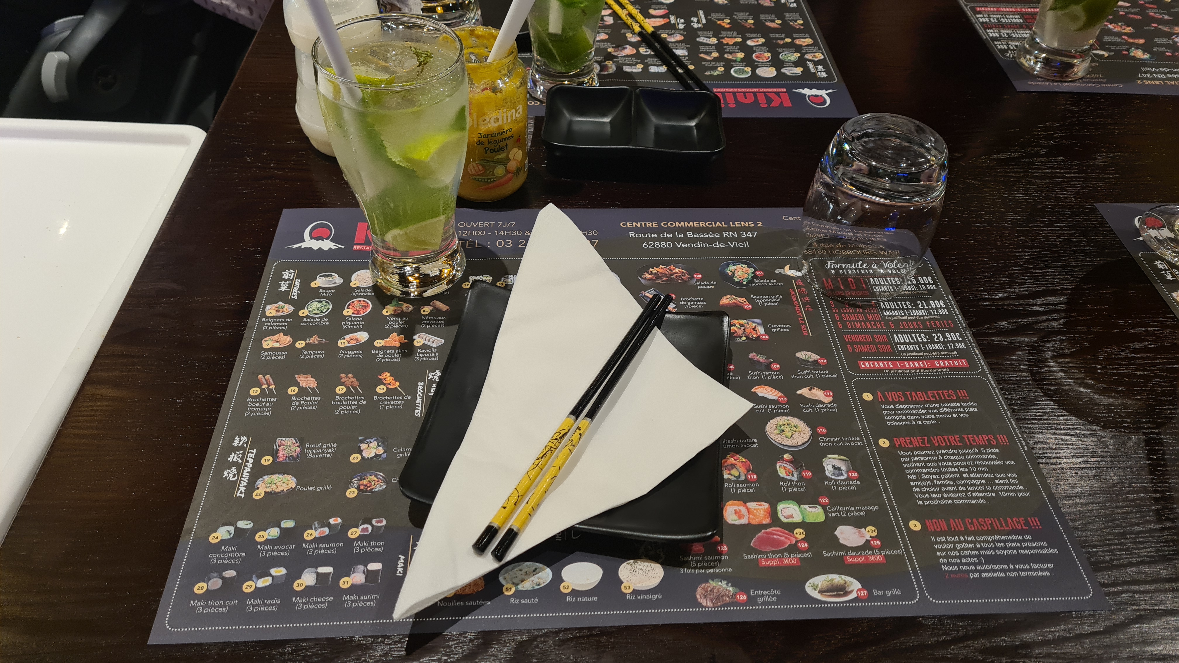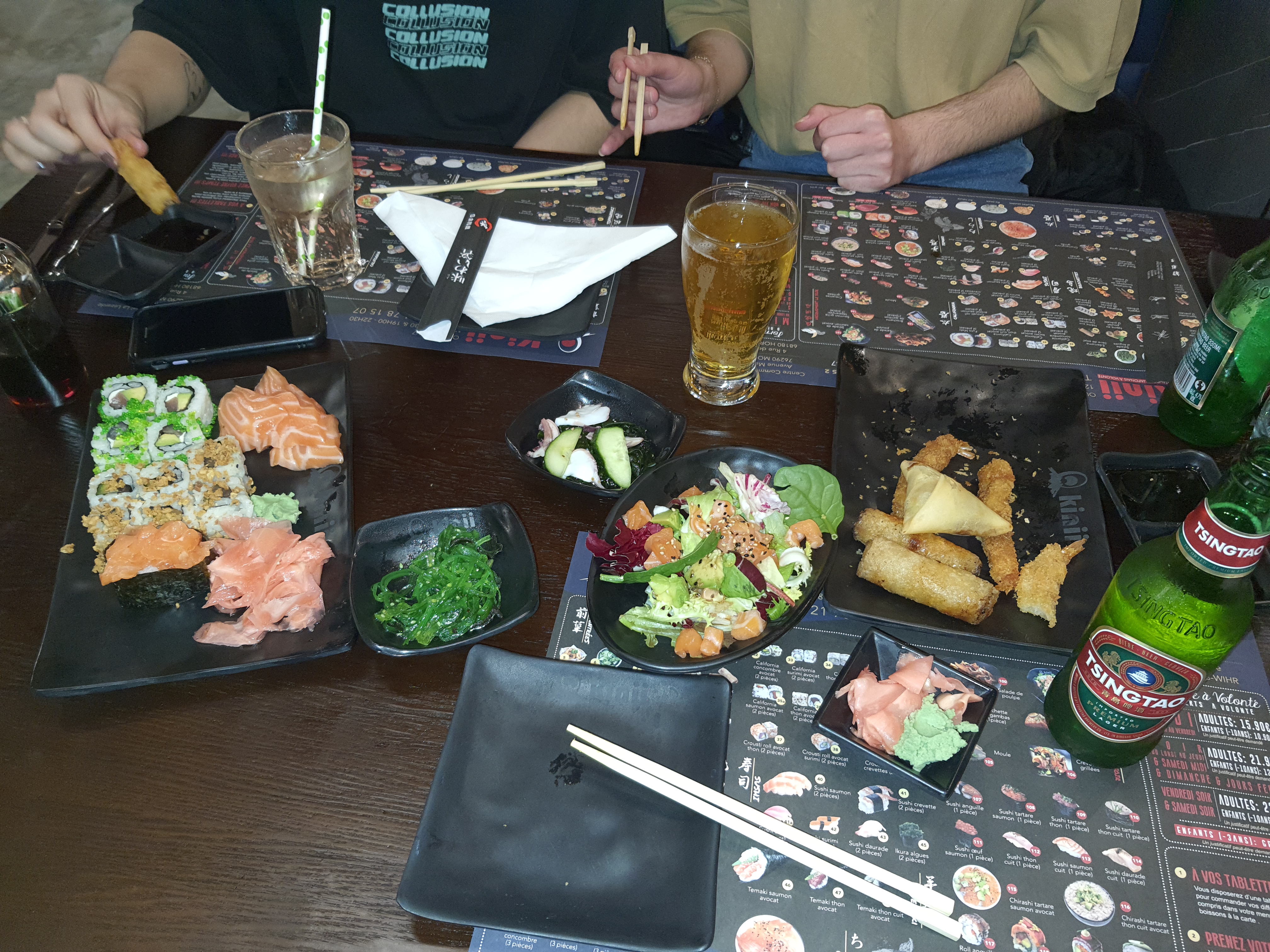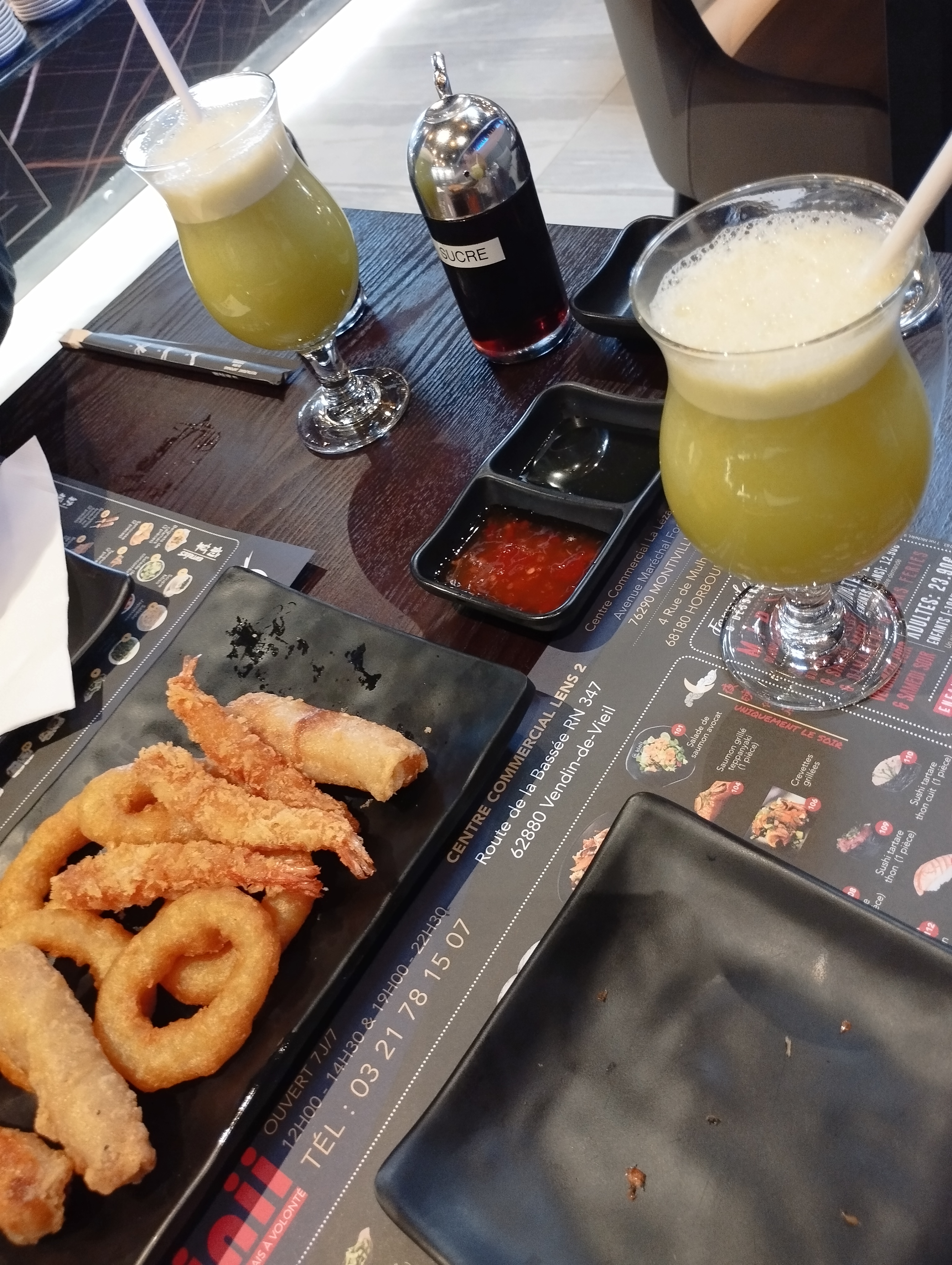Cadre sympathique. Commande sur tablette appréciable. Peu de choix en sushi, dommage pour un japonais. Les sushis sont fades et manques de goût. Le temps d’attente par commande n’est pas gênant mais pas top quand on veut juste une boisson.