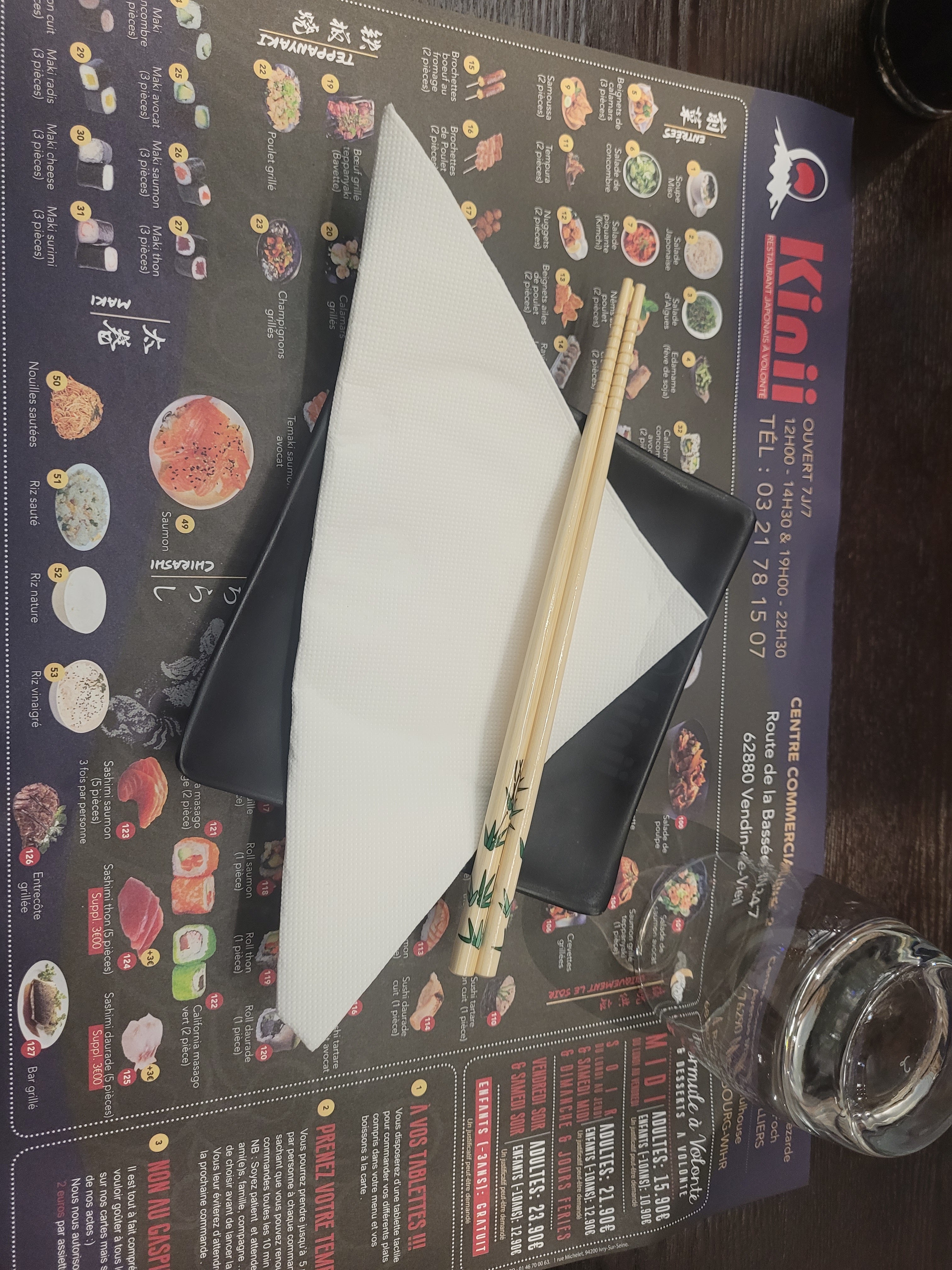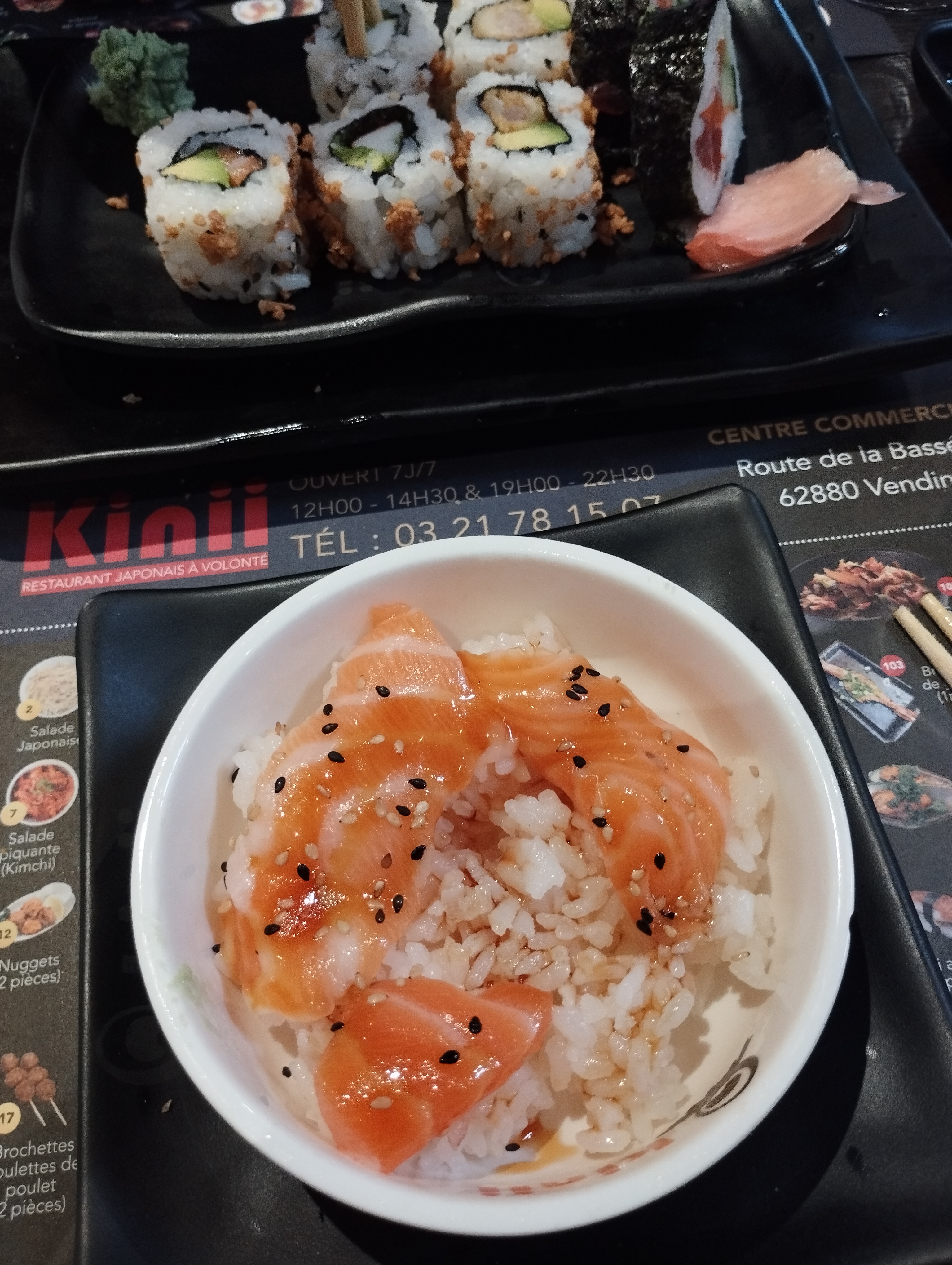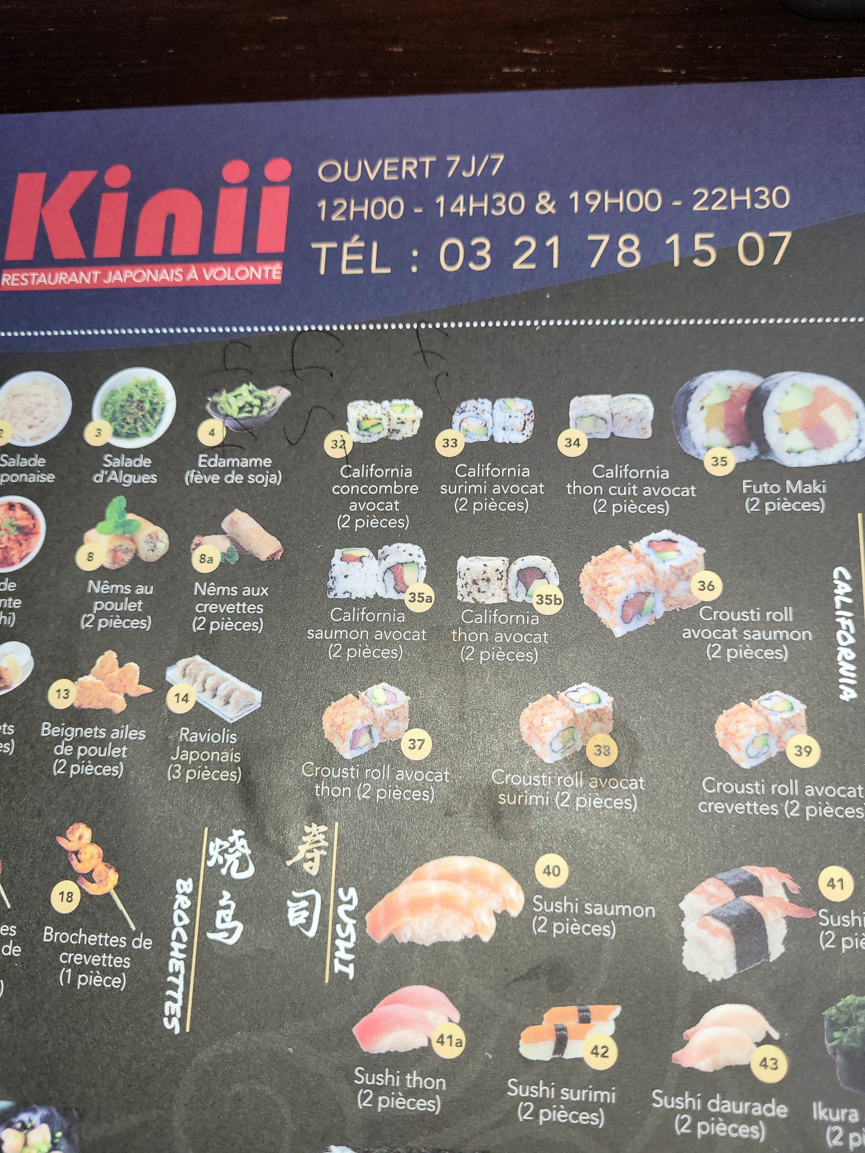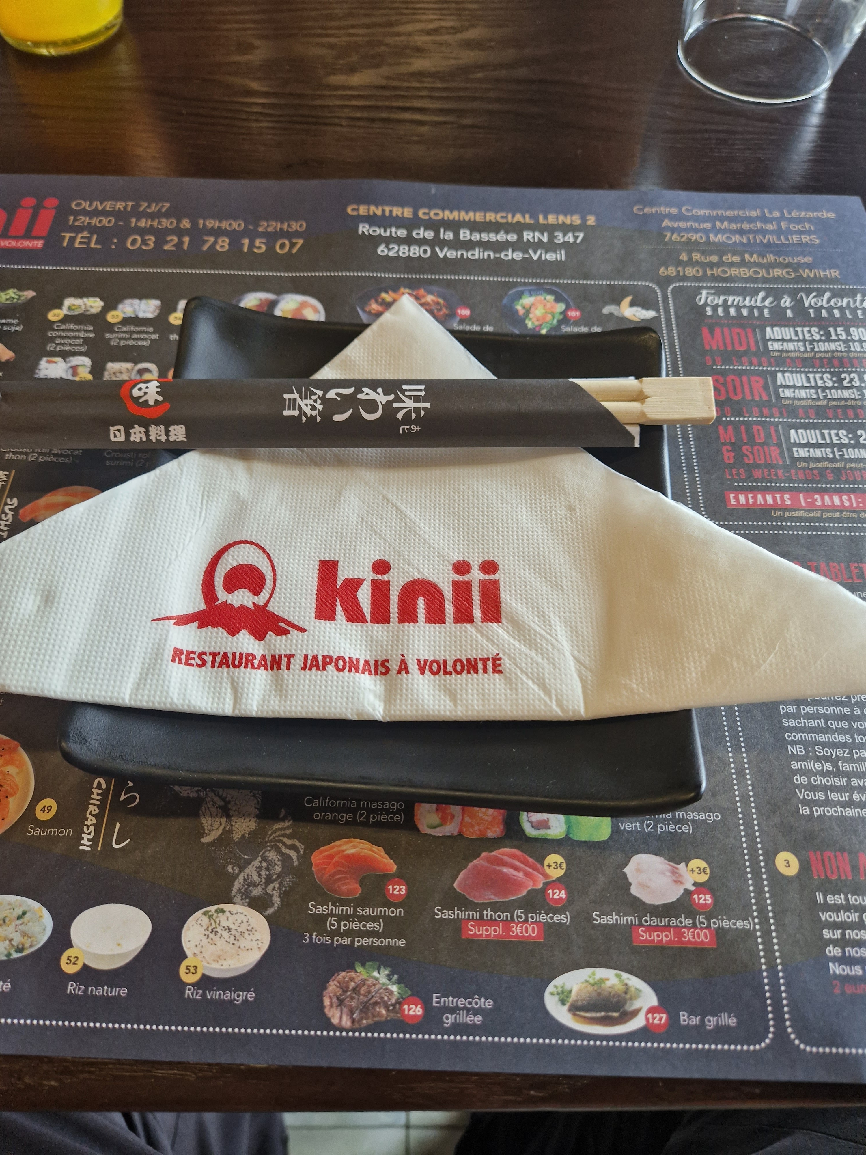 En septembre 2023 pour 2 personnes Kinii Il s'agit d'un restaurant type asiatique et à volonté. Je reviens sur mon commentaire car ayant été de nouveau dans ce restaurant je peux confirmer que la qualité des plats a changé à mon plus grand regret. Le restaurant : Toujours très propre et bien décoré Le personnel : toujours très gentil, agréable, professionnel et rapide. Service à table et tablette a disposition pour les commandes. Voici le bilan : 1- Infrastructure très propre et stylée 2- Très bon accueil 3- Employés pro (service en salle impeccable) 4- Plats avec une qualité divisé par deux depuis l'ouverture et mes précédentes venus en 2022 5- Choix un peu moins important au niveau des california roll 6- Rapport qualité/prix mauvais en comparaison d'autres établissement de ce genre. Dommage c'était prometteur Quand c'est bien, il faut le dire ! David T