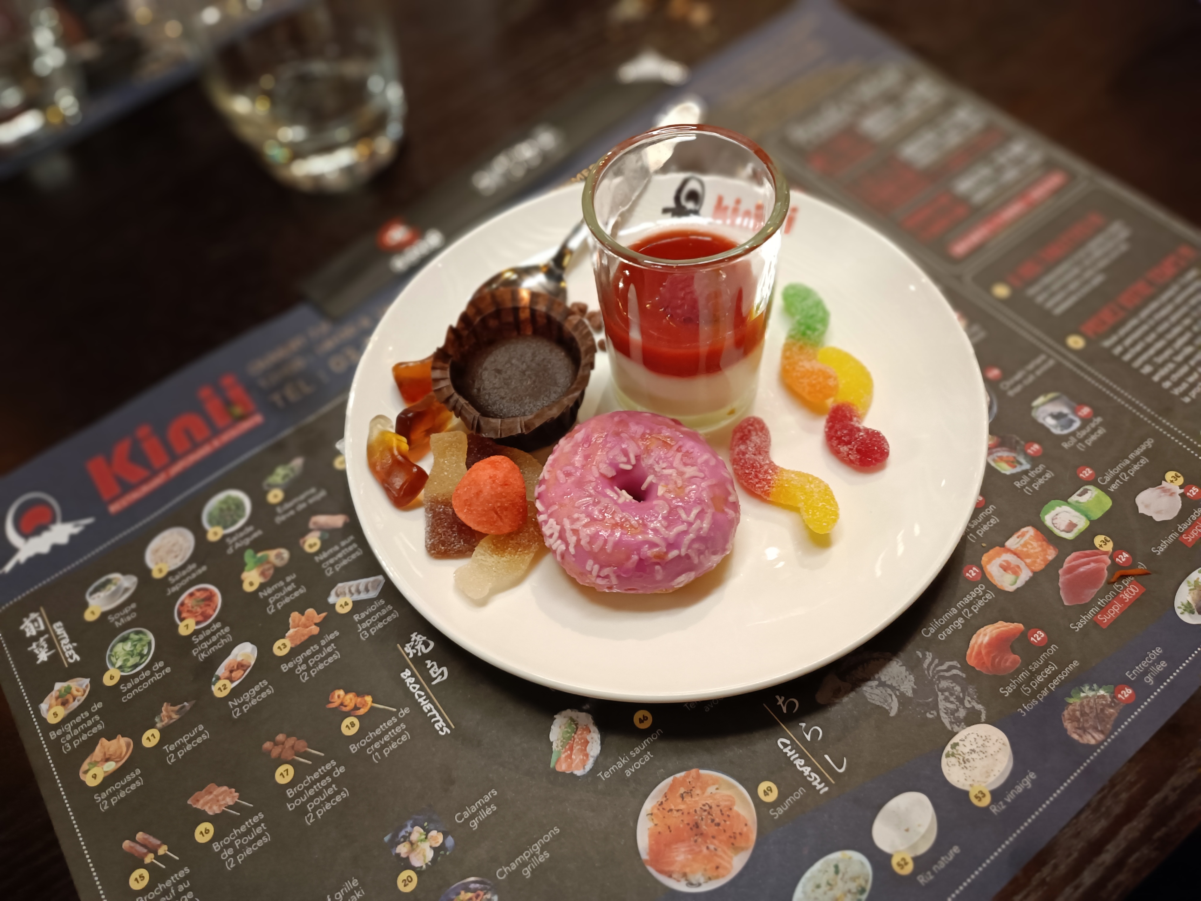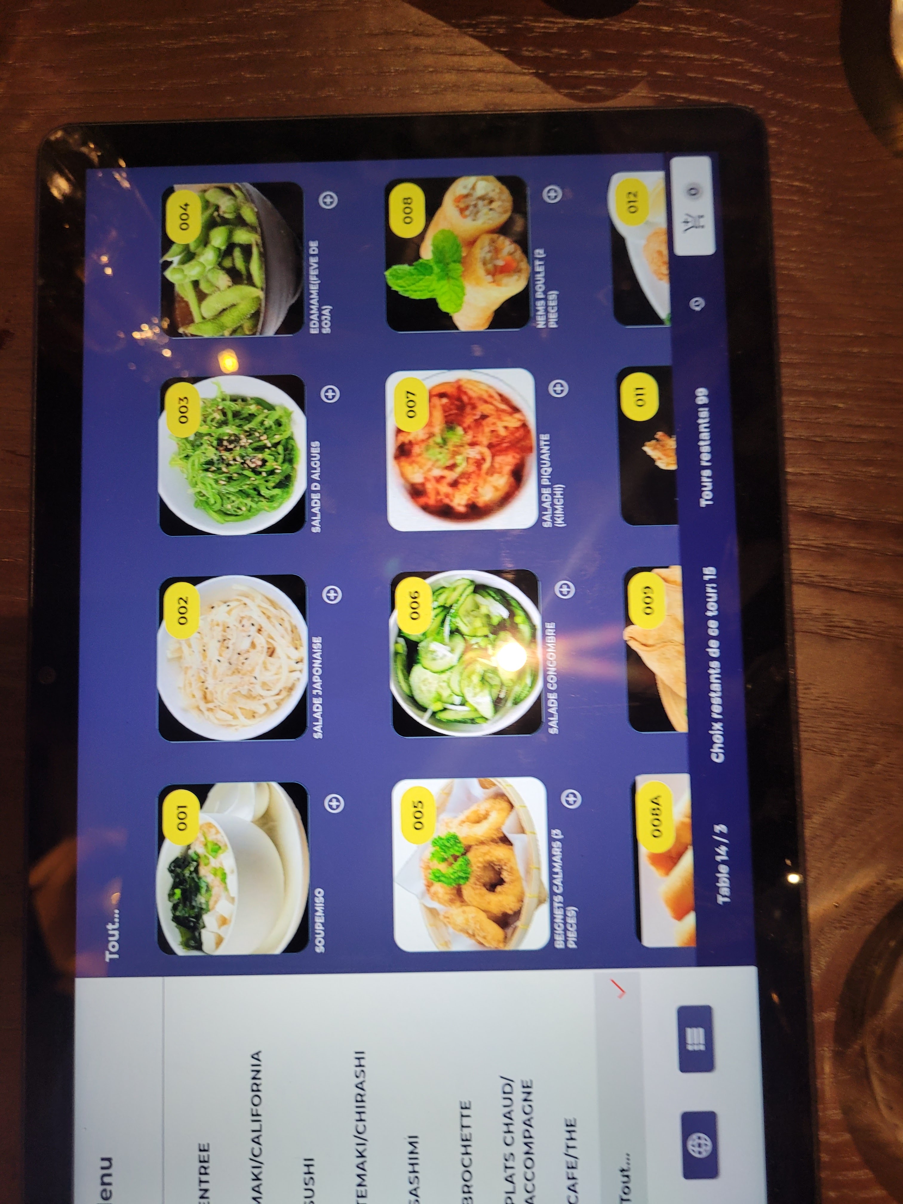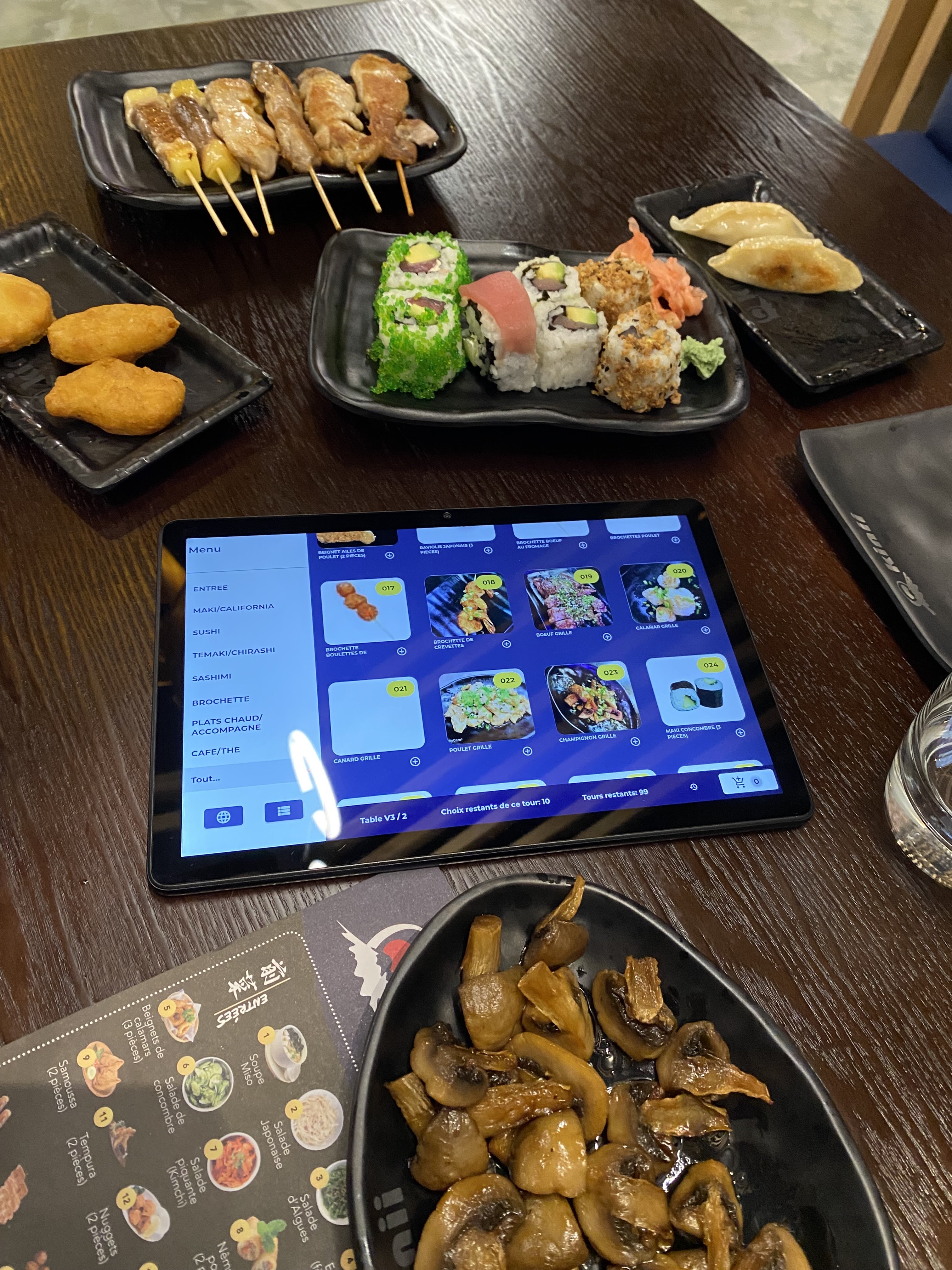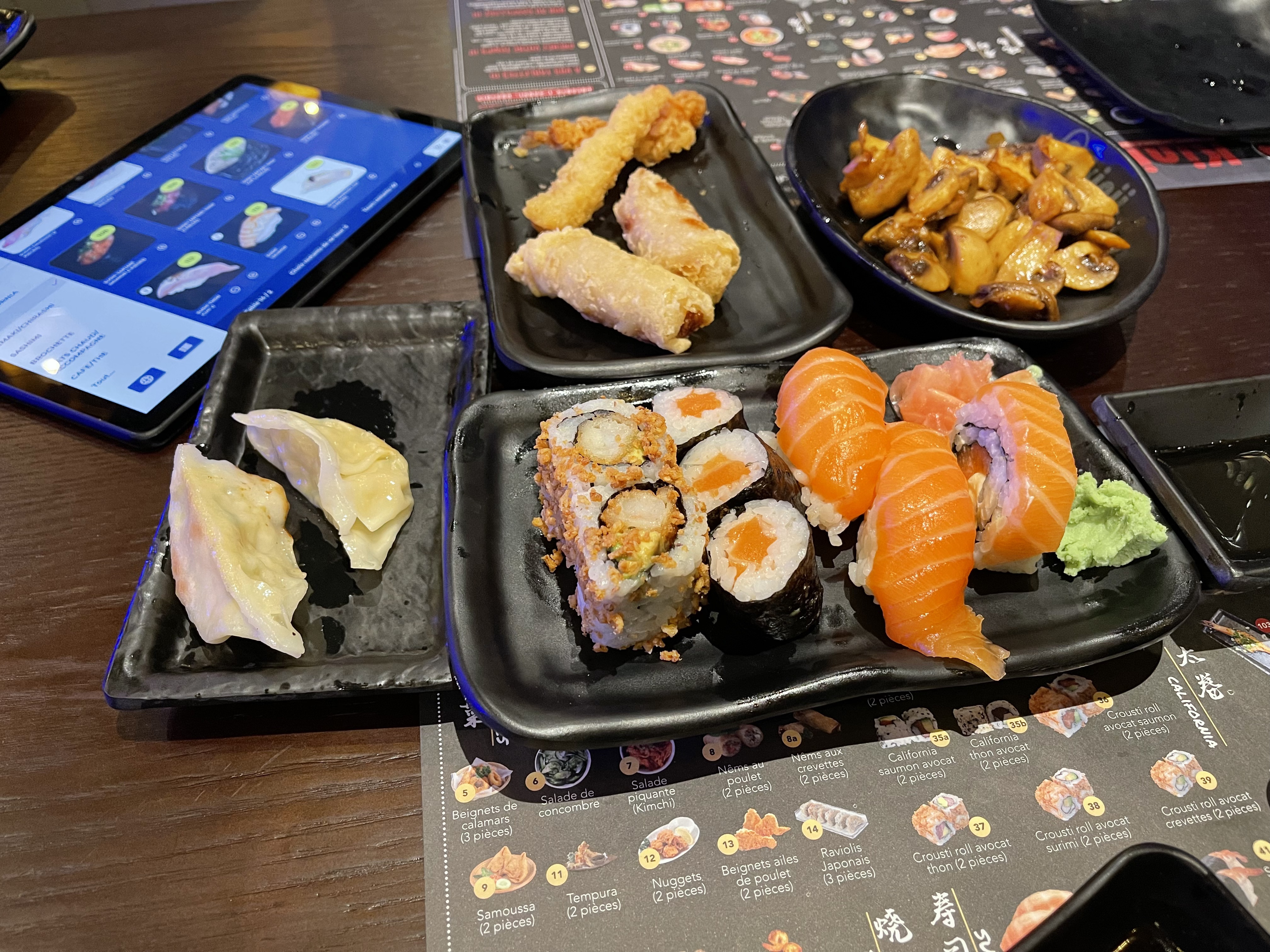 Ça change des buffets habituels. Ici, on y mange à volonté en étant servi à table grâce à la tablette mise à notre disposition. C’est très simple, on commande sur la tablette et on vient nous ramener les plats. La nourriture est très bonne : entrées, sushis, maki, brochette, nouilles, viandes, desserts etc. Pour les accompagnants qui ne sont pas fan de nourritures asiatiques, pas de problème : viande, nuggets, frites, riz. Il y en a pour tout le monde.