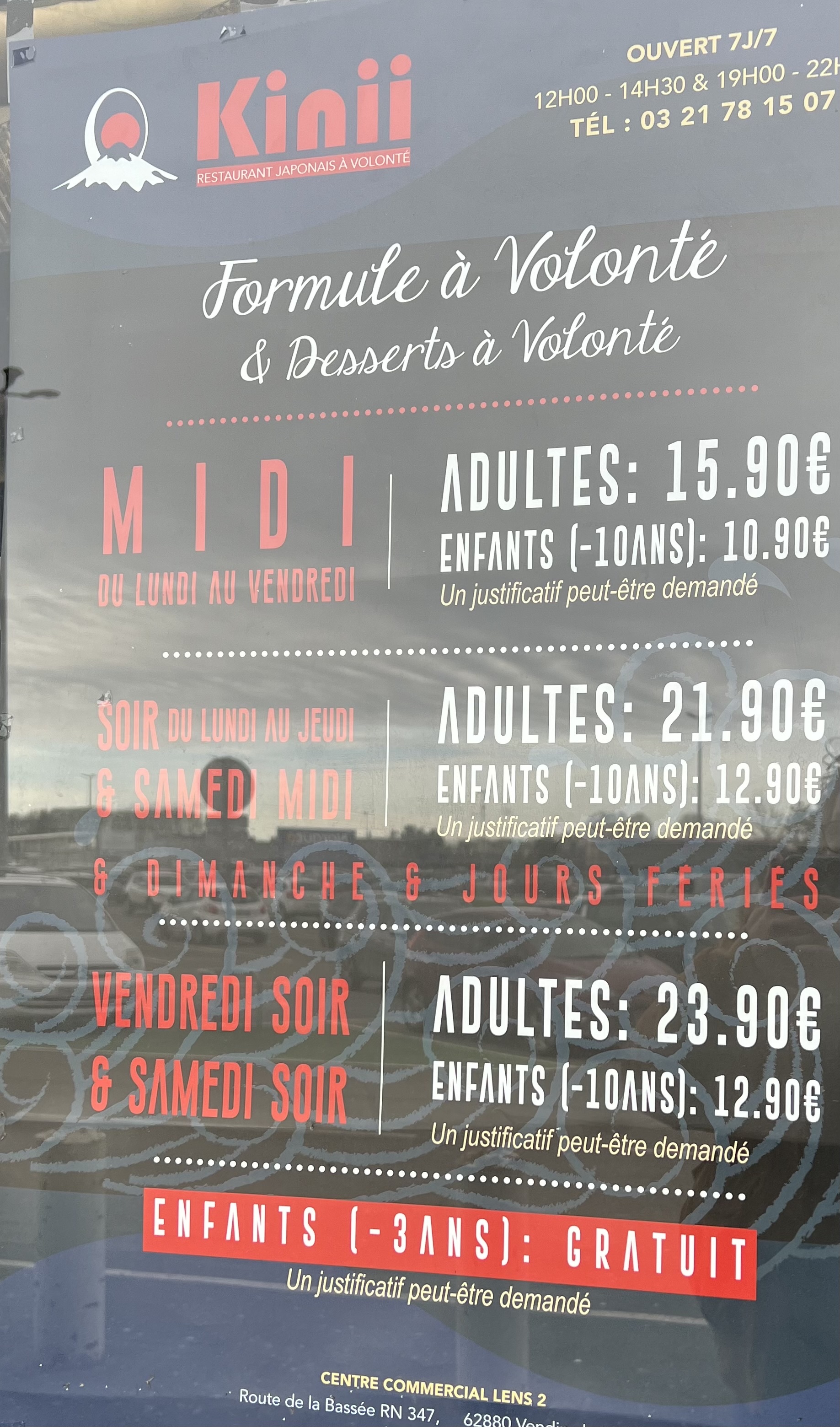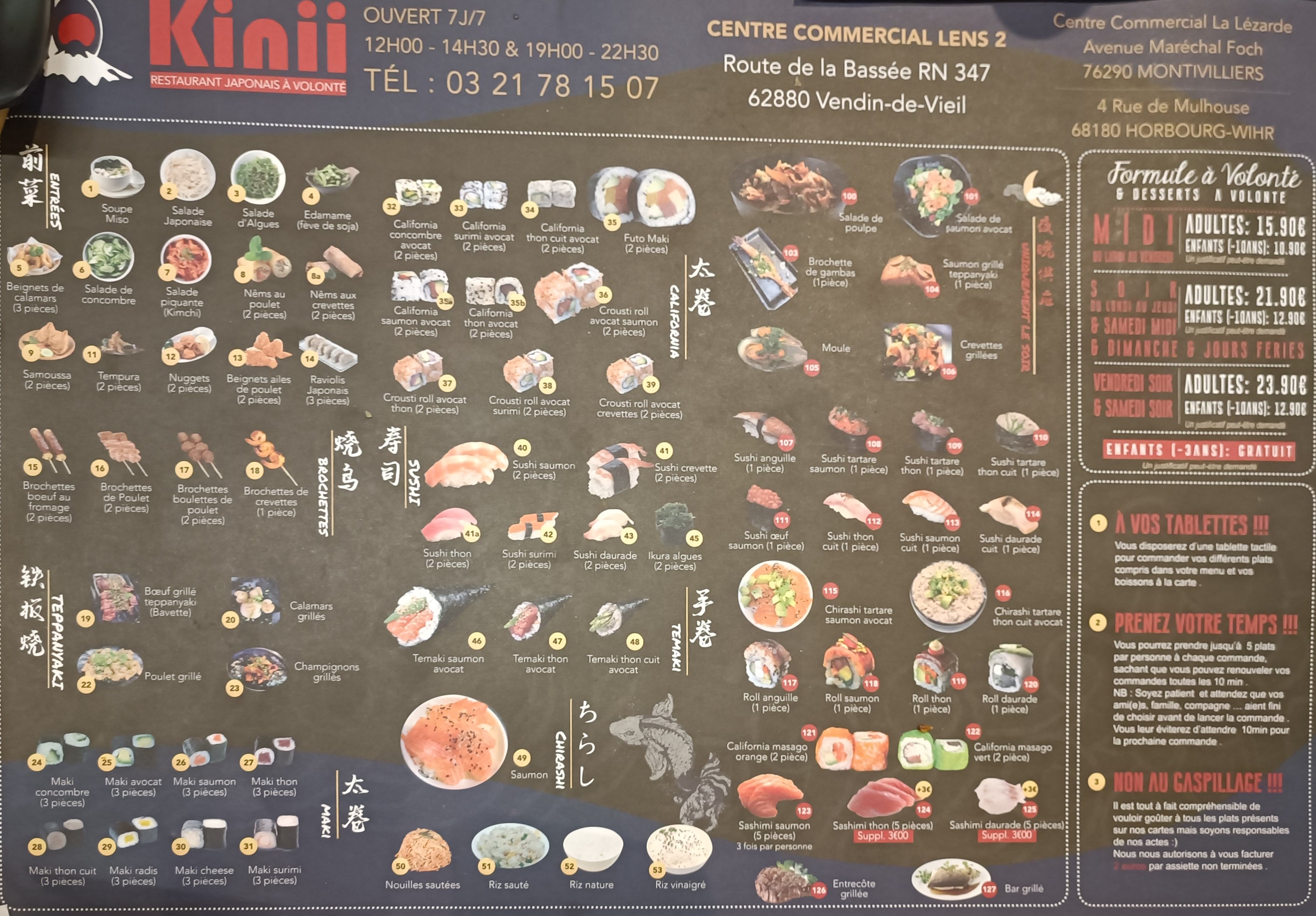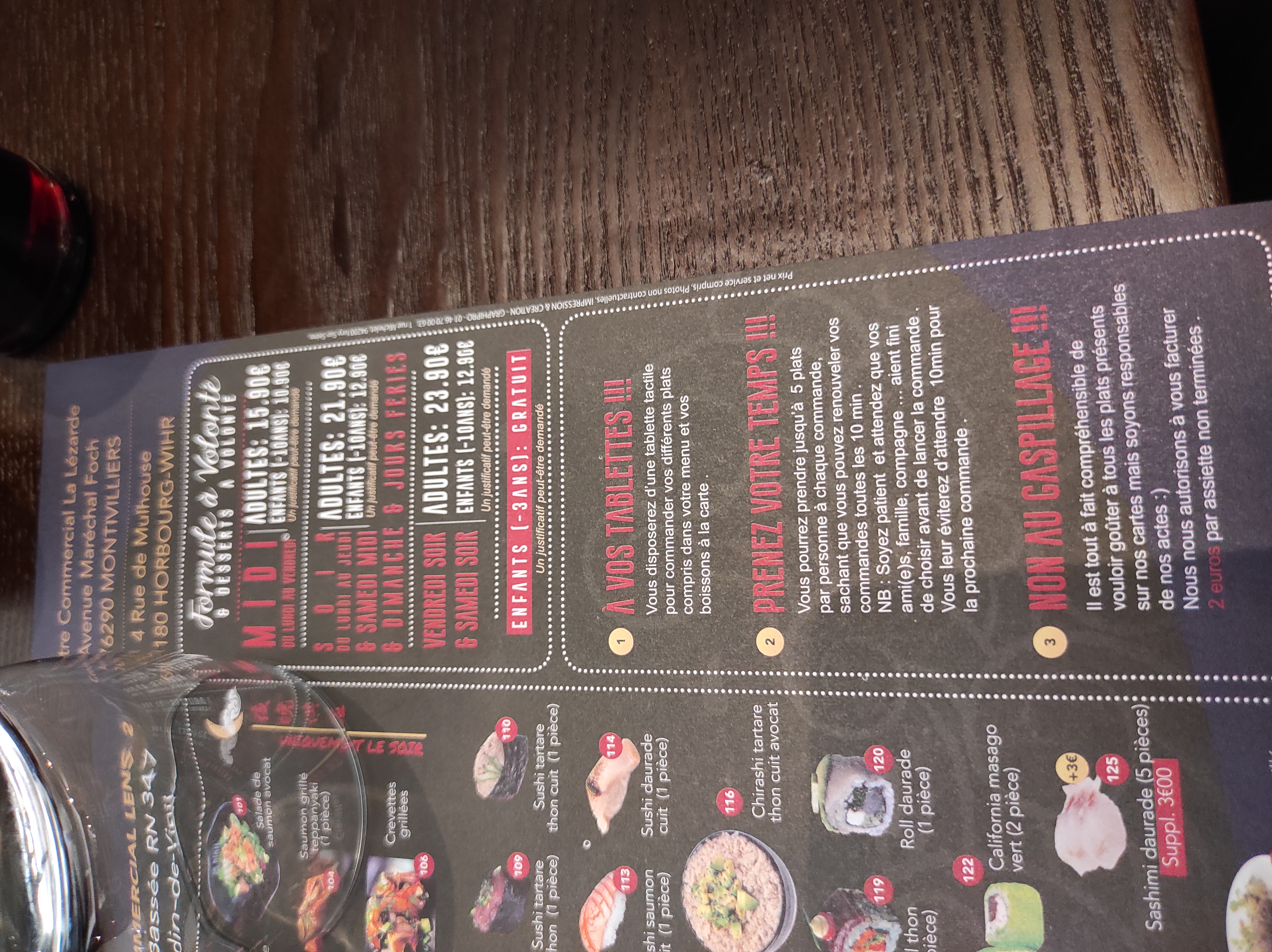 Grosse découverte. Voici un très bel endroit. Restaurant japonais à volonté. Ce restau change de ce que l'on peut connaître des restaurants chinois à volonté habituel. Ici le concept est efficace. Vous commandez à partir d'une tablette, vous avez droit à 5 plats par personne les quantités sont petites mais vous avez la possibilité de commander autant de fois que vous voulez (vous avez un laps de temps entre chaque commande de quelques minutes). Chaque serveur à sa partie (entrée, grillade,etc). Ne vous étonnez pas de ne pas avoir toute la commande d'un seul coup. le personnel est très bien et souriant. Ce système de commande permet de pouvoir goûter à tout et pour les gros mangeur ne vous inquiétez pas c'est à volonté. Si vous maîtrisez bien le concept les plats peuvent défiler 😅 Cela permet de voir moins de gaspillage. Chose appreciable vous êtes vraiment au restaurant, vous ne bougez pas de la table sauf pour aller au toilette, au buffet des desserts ou pour jeter votre oeil tellement le mieux est magnifique et dépaysant. Concernant la nourriture, les plats sont bons, ça reste du japonais contrairement au plat au wok. Vous trouverez quand même des plats tels que les nuggets, frite, entrecôte.. En terme de prix c'est un peu plus cher mais vois êtes servi à table et au resto. Voilà une bonne adresse à découvrir près de Lens