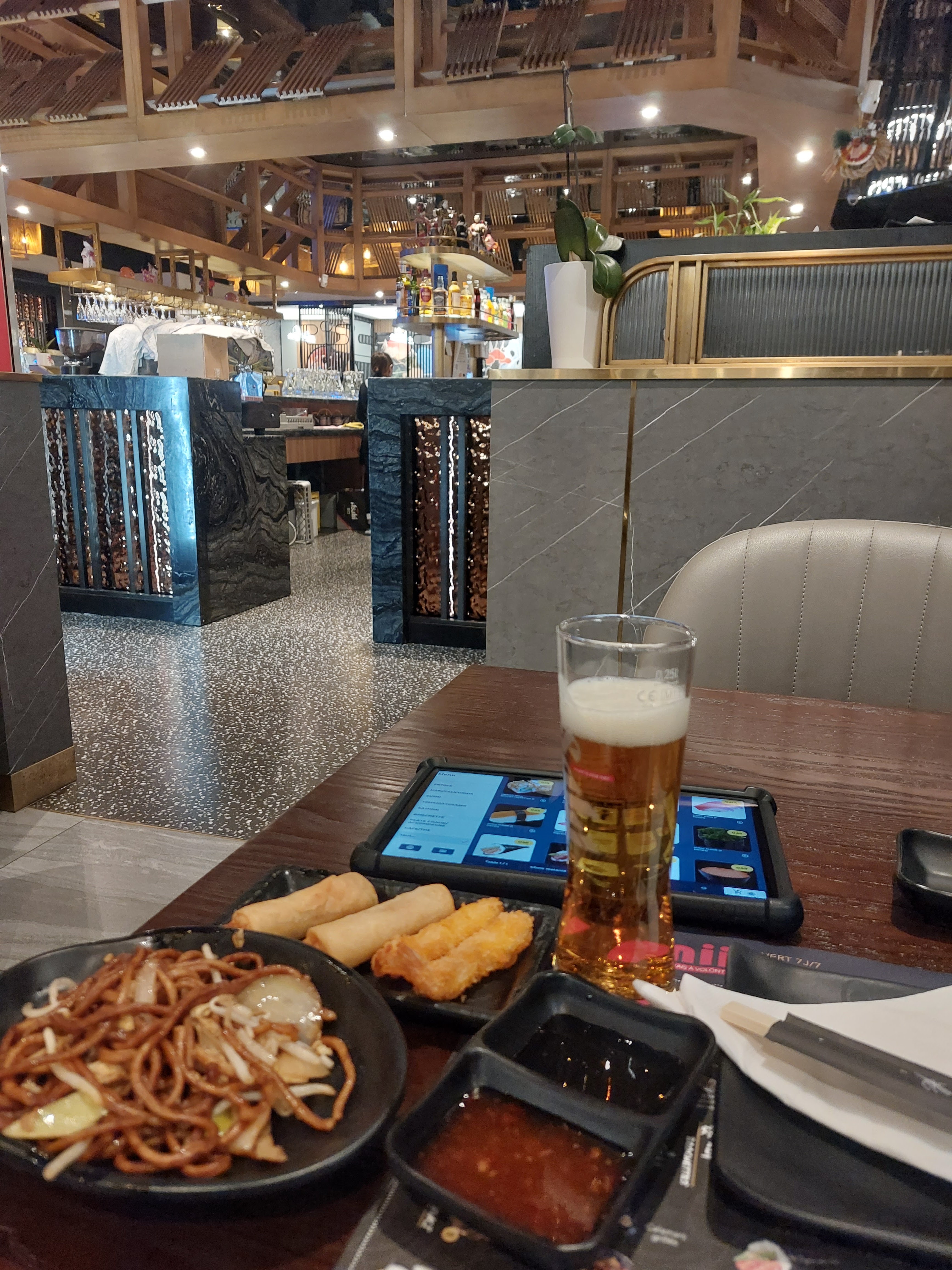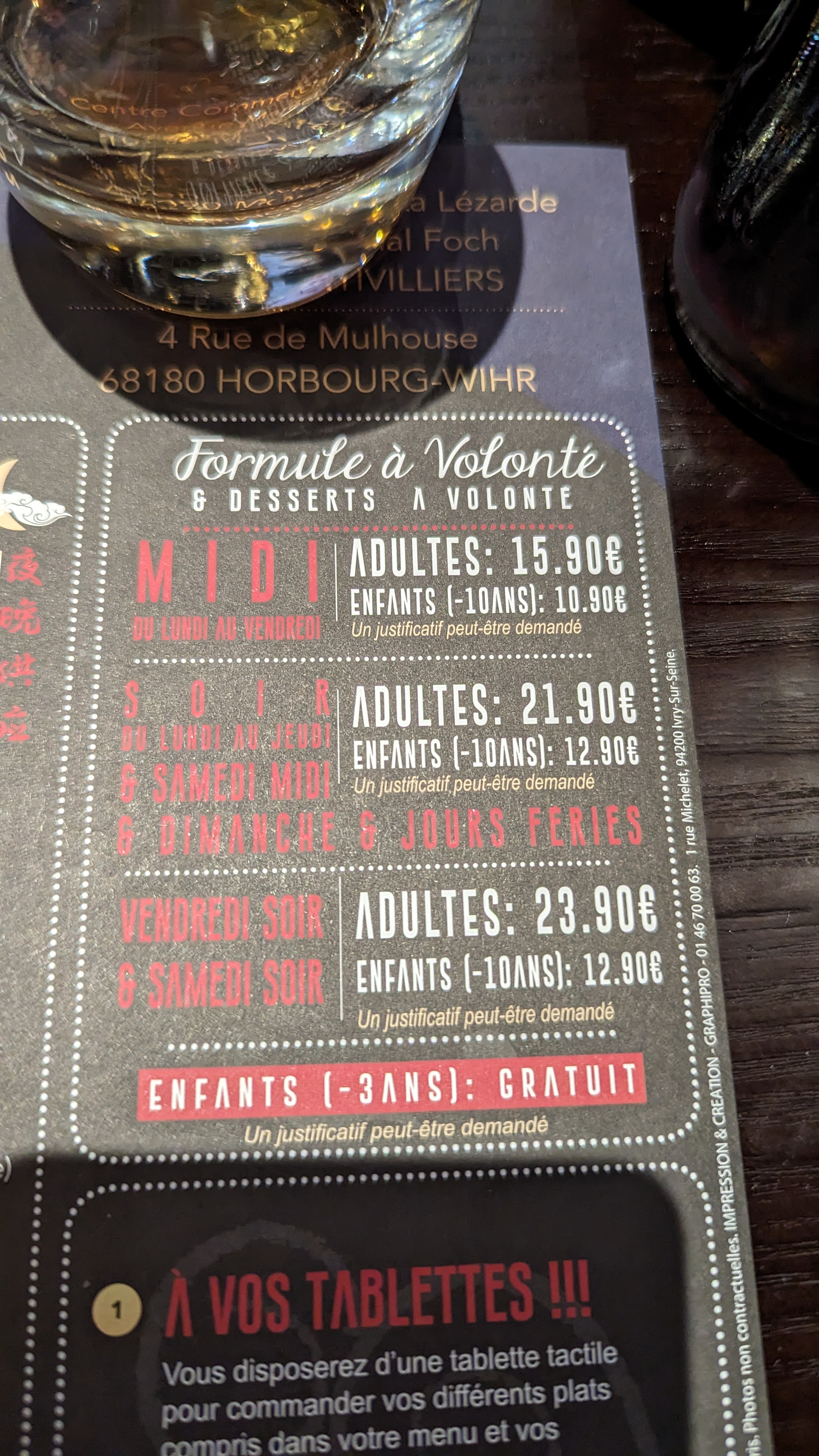 C'est la deuxième fois que je vais au restaurant là les deux fois je me suis régalé j'aime bien aussi la nouvelle façon de commander nos plats avec une tablette il y a un prix pour le midi le soir le weekend mais à volonté peut-être les nouilles sautées un peu plus chaude