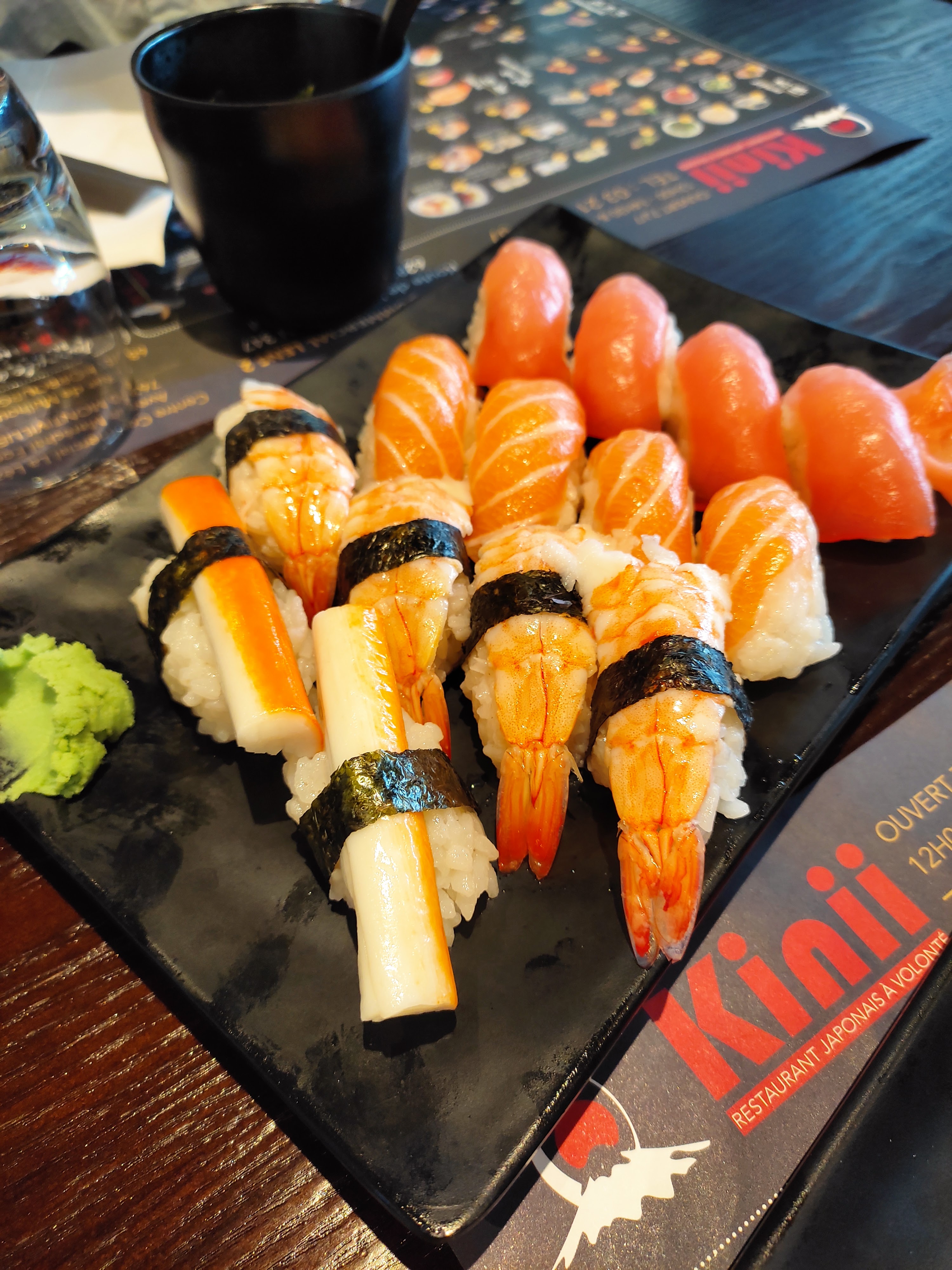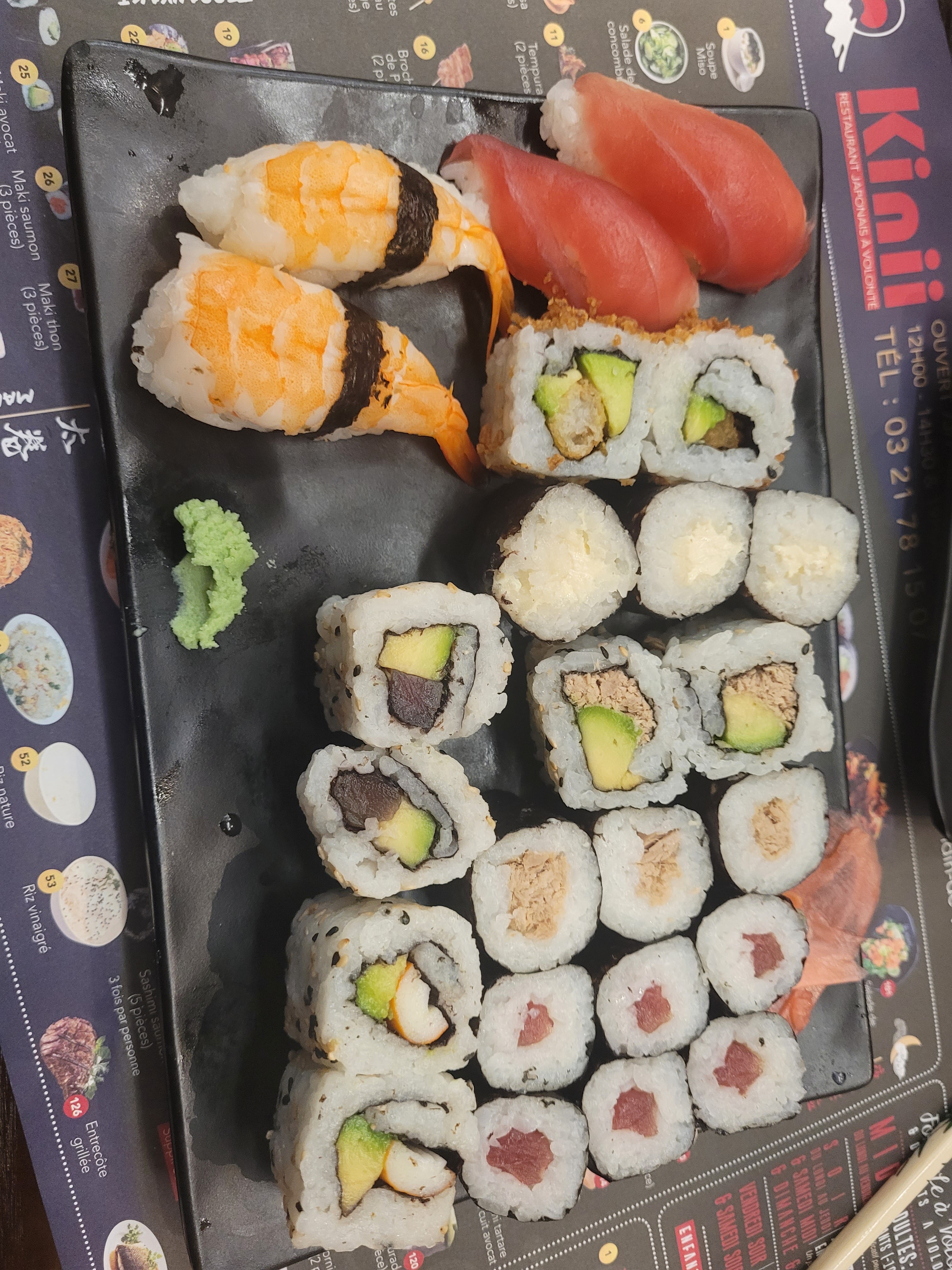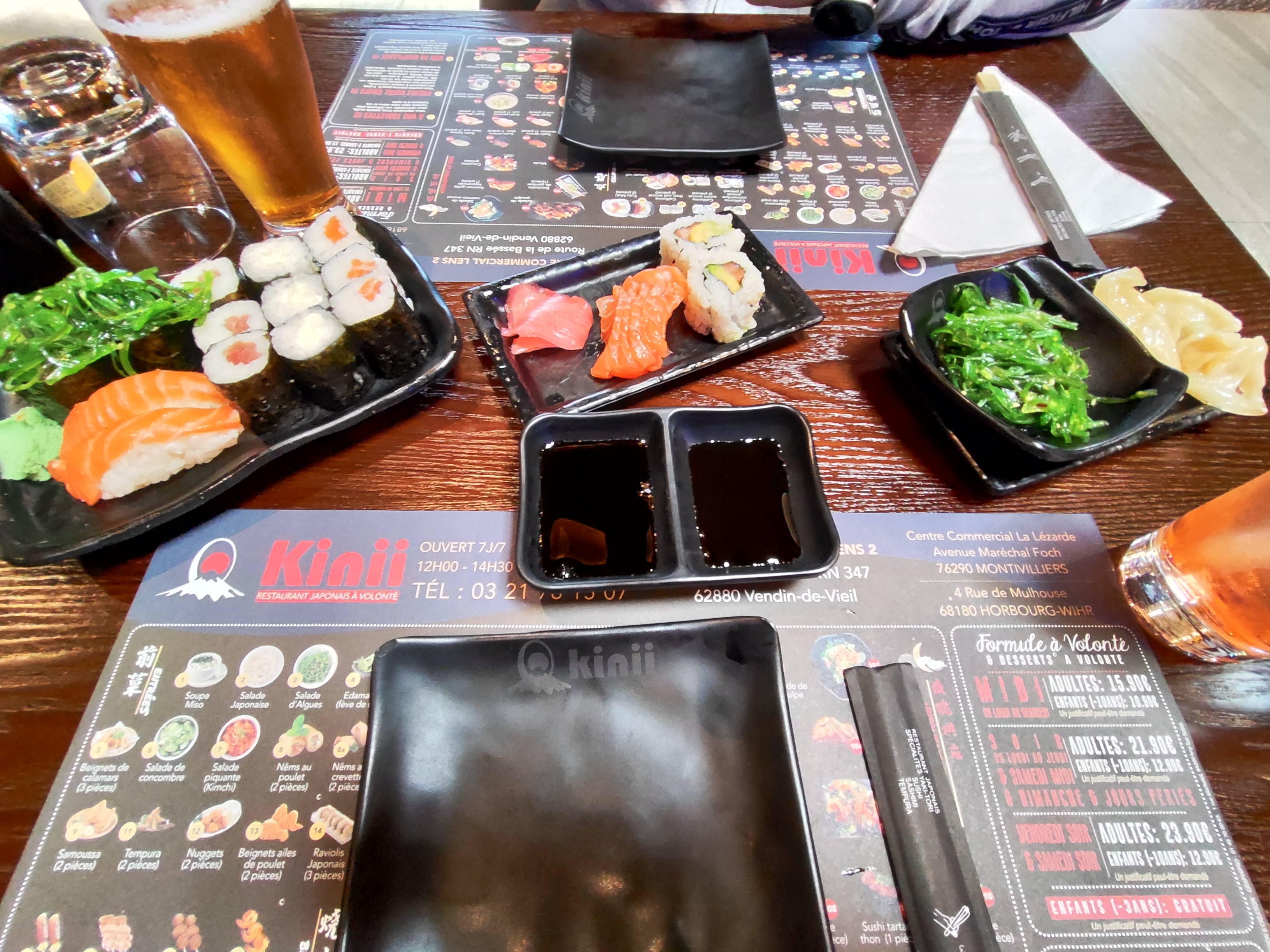Repas en amoureux ce soir au restaurant Kinii de Vendin-Le-Viel. Super accueil de la part du personnel, cadre charmant et très intimiste grâce aux tables séparées de cloisons, ce qui rend le restaurant calme. Système de commande à la tablette, et service très rapide. Le fait de recevoir quelques échantillons de chaque évite le gaspillage et de goûter la plus part des plats. Nous avons commandé les plats et entrées en même temps et on s’est régalé avec tout. Certes on a connu des produits de meilleur qualité, mais le fait que ce soit à volonté le rapport qualité prix est correct. Parmi les boissons nous pouvons retrouver différentes variétés japonaise que soit alcoolisé ou non. Bémol au niveau des desserts, effectivement les pâtisseries congelées ne sont pas très appréciés mais les coupelles de fruit et les verrines sont vraiment sympa et permet de terminer sur une touche légère et sucrée. Je recommande ce restaurant, à essayer entre amis pour tout goûter 😁🍱