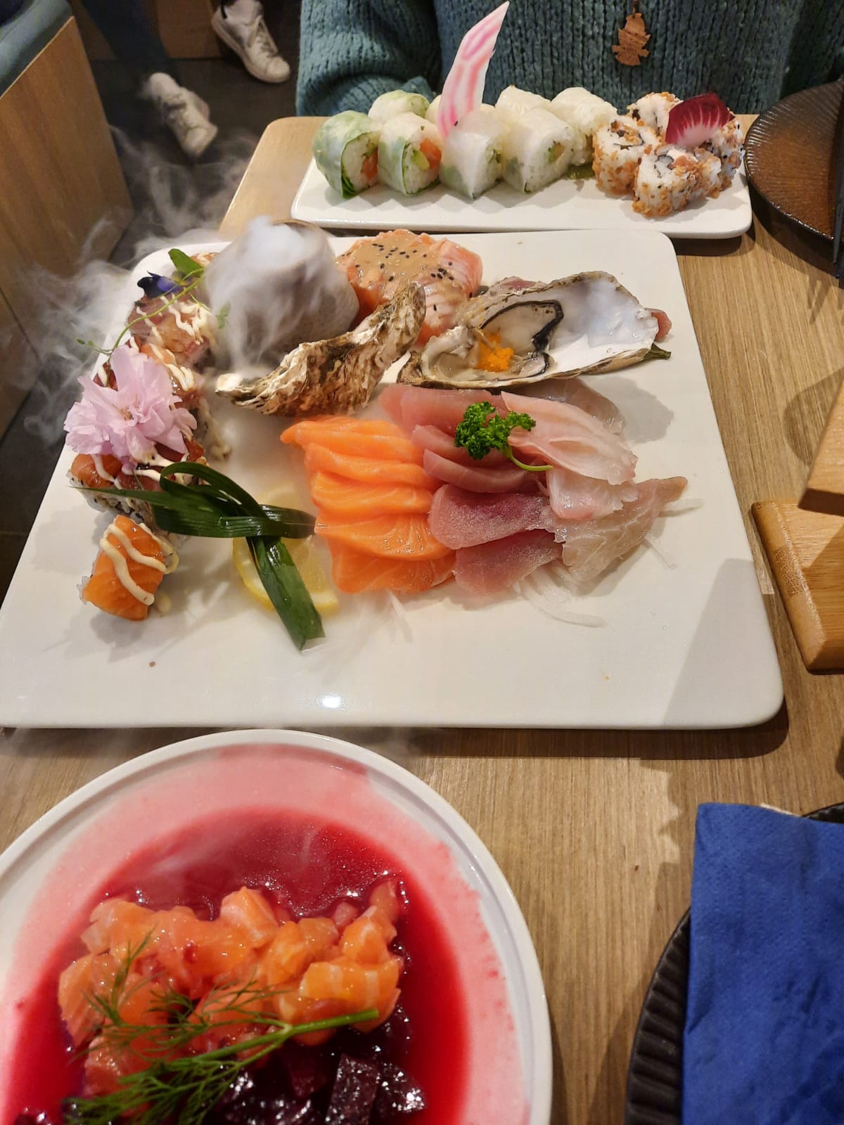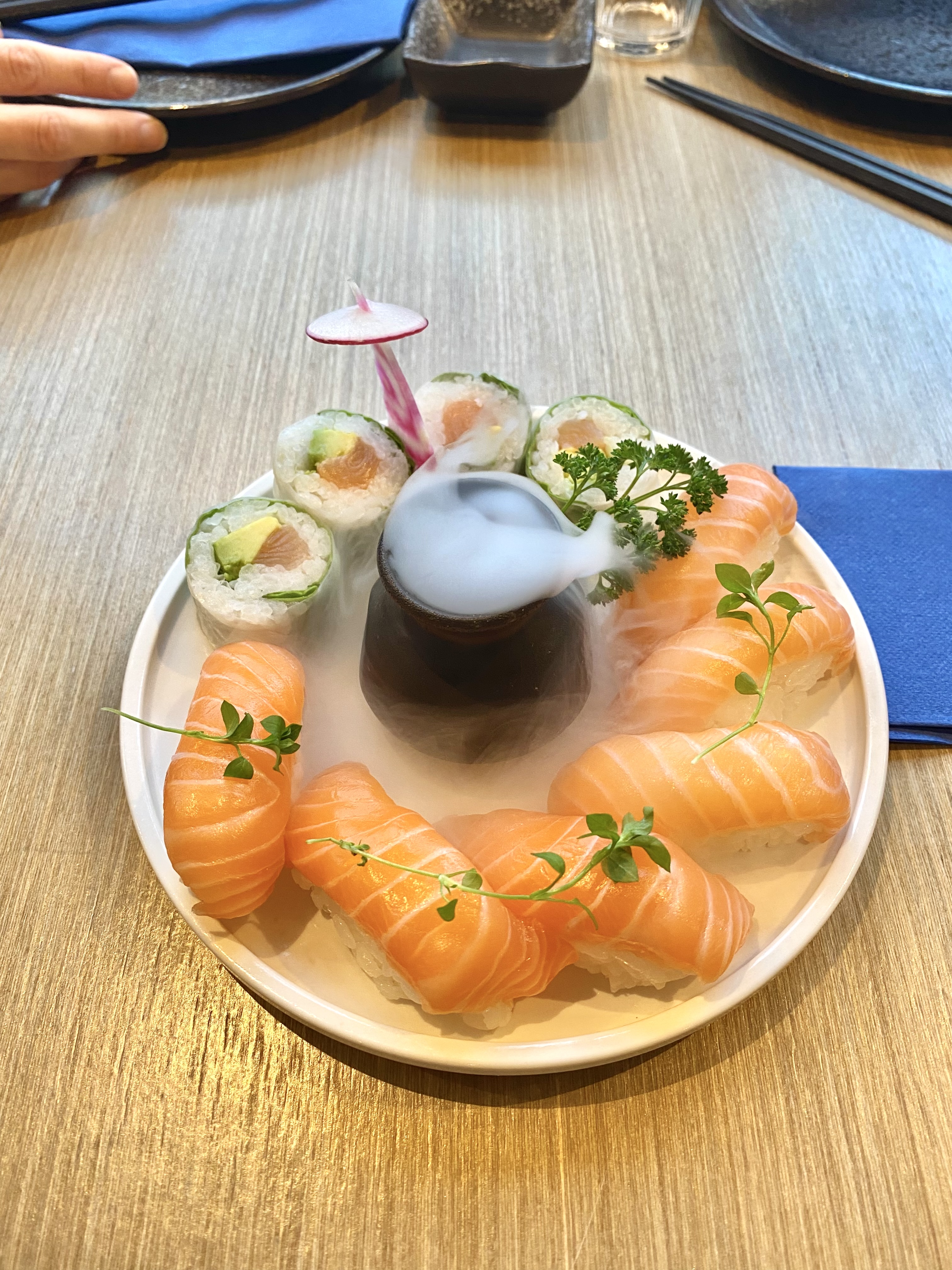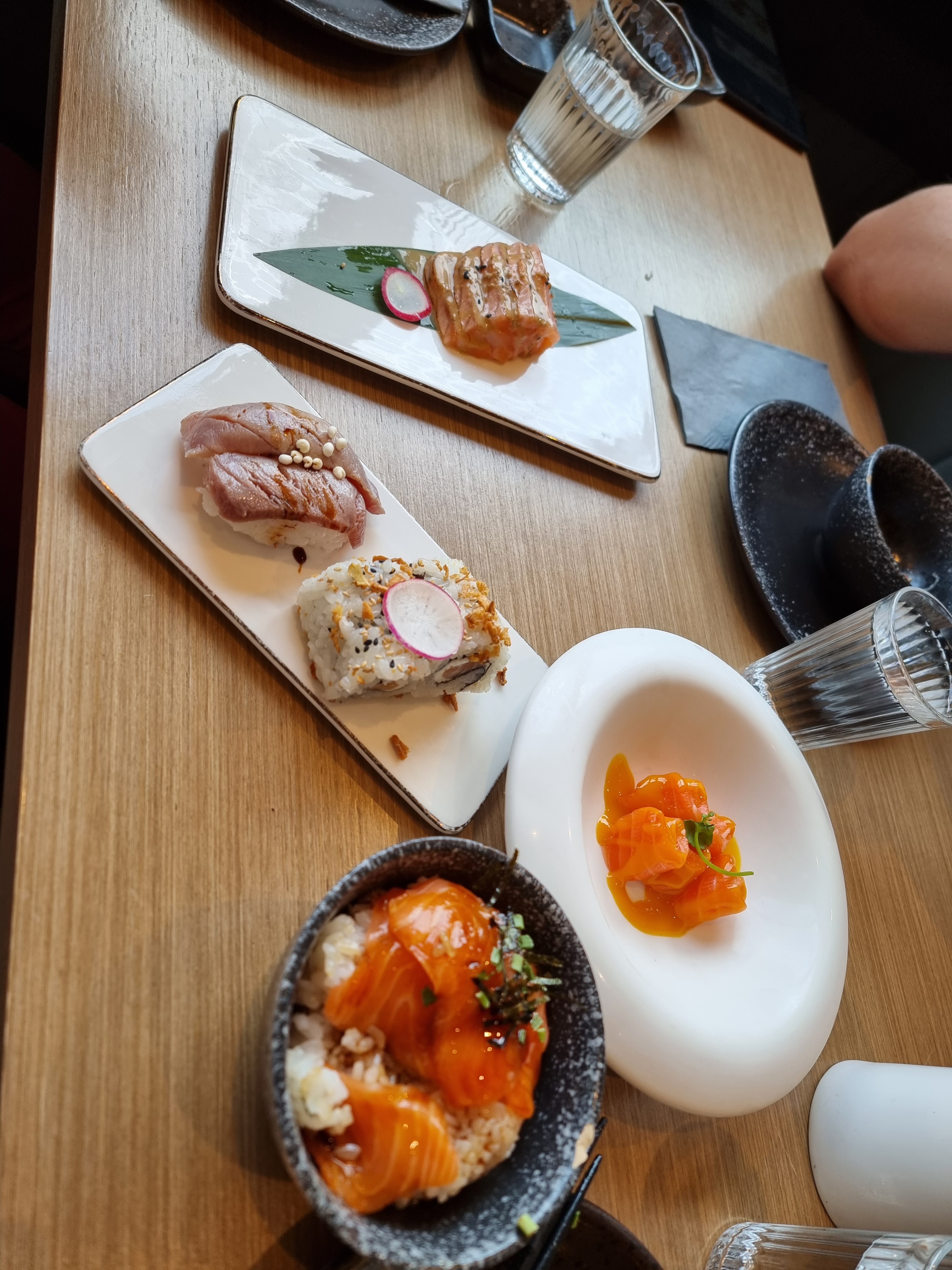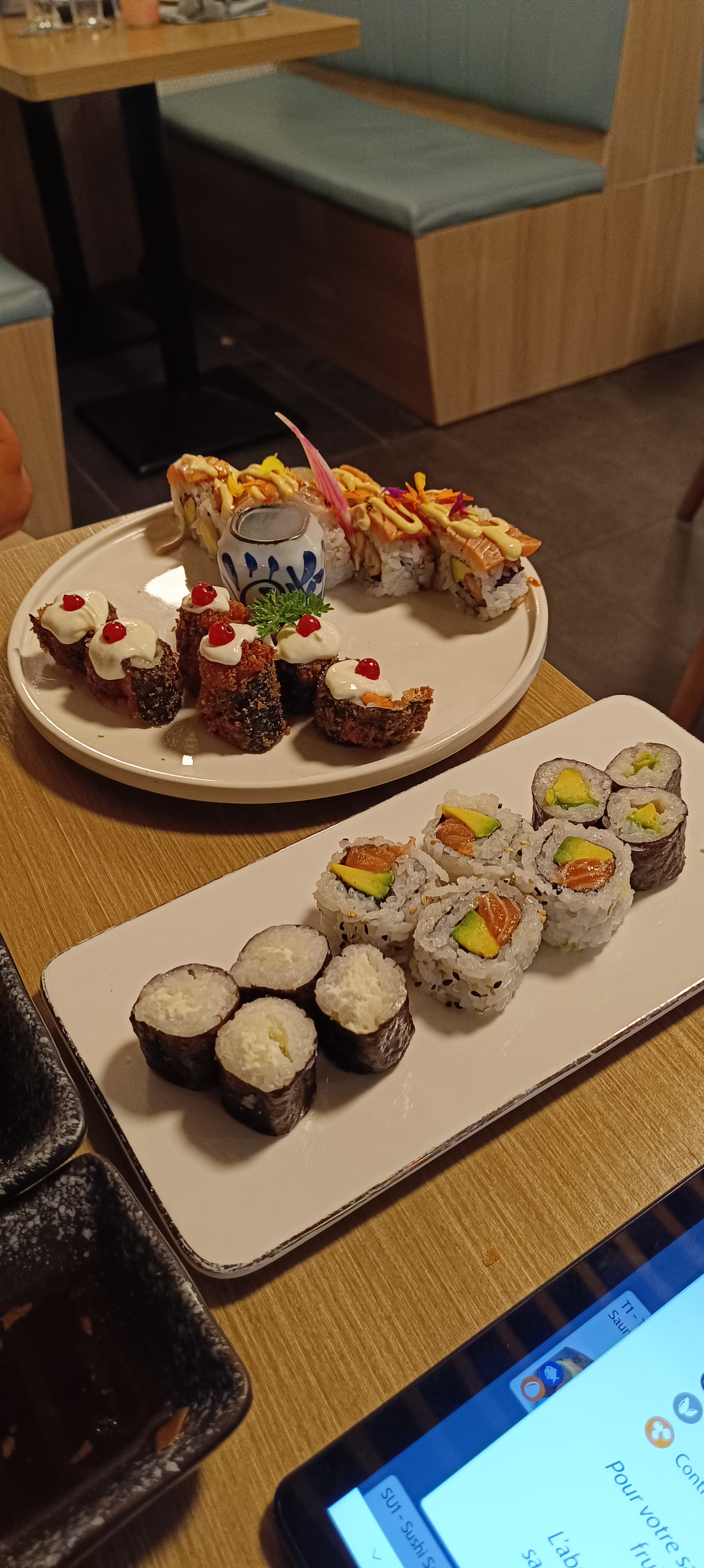 Je n'avais jamais mangé de japonais aussi bon Le cadre du restaurant est sublime Le prix abordable au vu du nombre de plat possible (50 plats par personne) La carte propose un large choix de plats (sushi, maki, gyoza, bouché...) Les serveurs sont aimable et à l'écoute Il faut également souligner la présentation des plats qui est juste incroyable Temps d'attente correcte Je recommande vivement