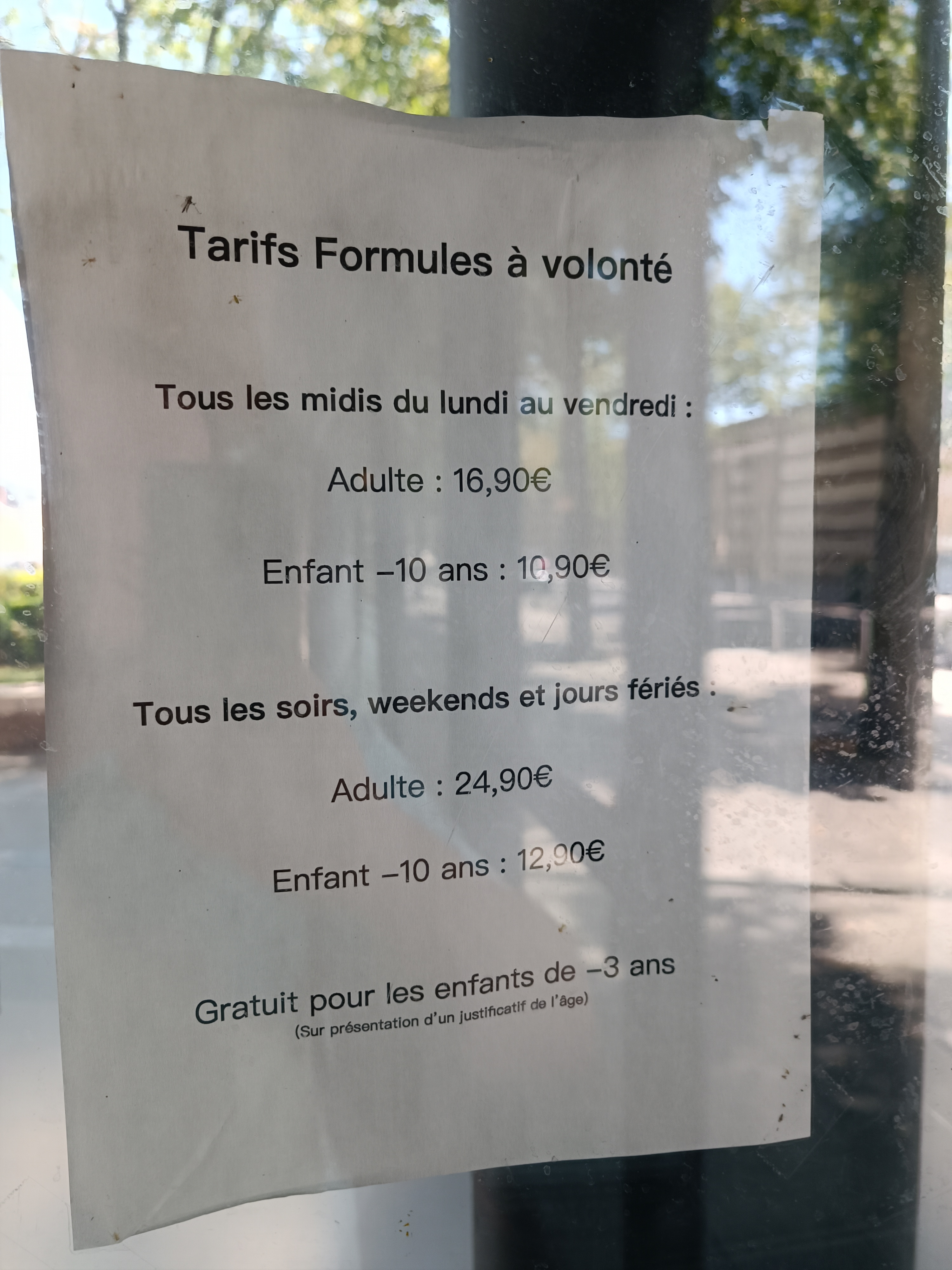 Nous y sommes allés un soir. Le menu est a 24 euros 90. c'est restaurant qui propose 5 plat par personne 5 fois donc 25 plat maximum (ce qui est largement suffisants nous n'avons pris que 3 tours alors que nous sommes des bons mangeur). Les produits sont frais, il propose des choses que je n'avais jamais manger ailleurs, type salade, sushi mangue... Nous avons vraiment apprécié notre repas ! Nous reviendrons, c'est sûr. La décoration est simple et zen, et la vaisselle est très esthétiques également. Merci pour votre accueil et votre service qui était parfait et rapide 😁