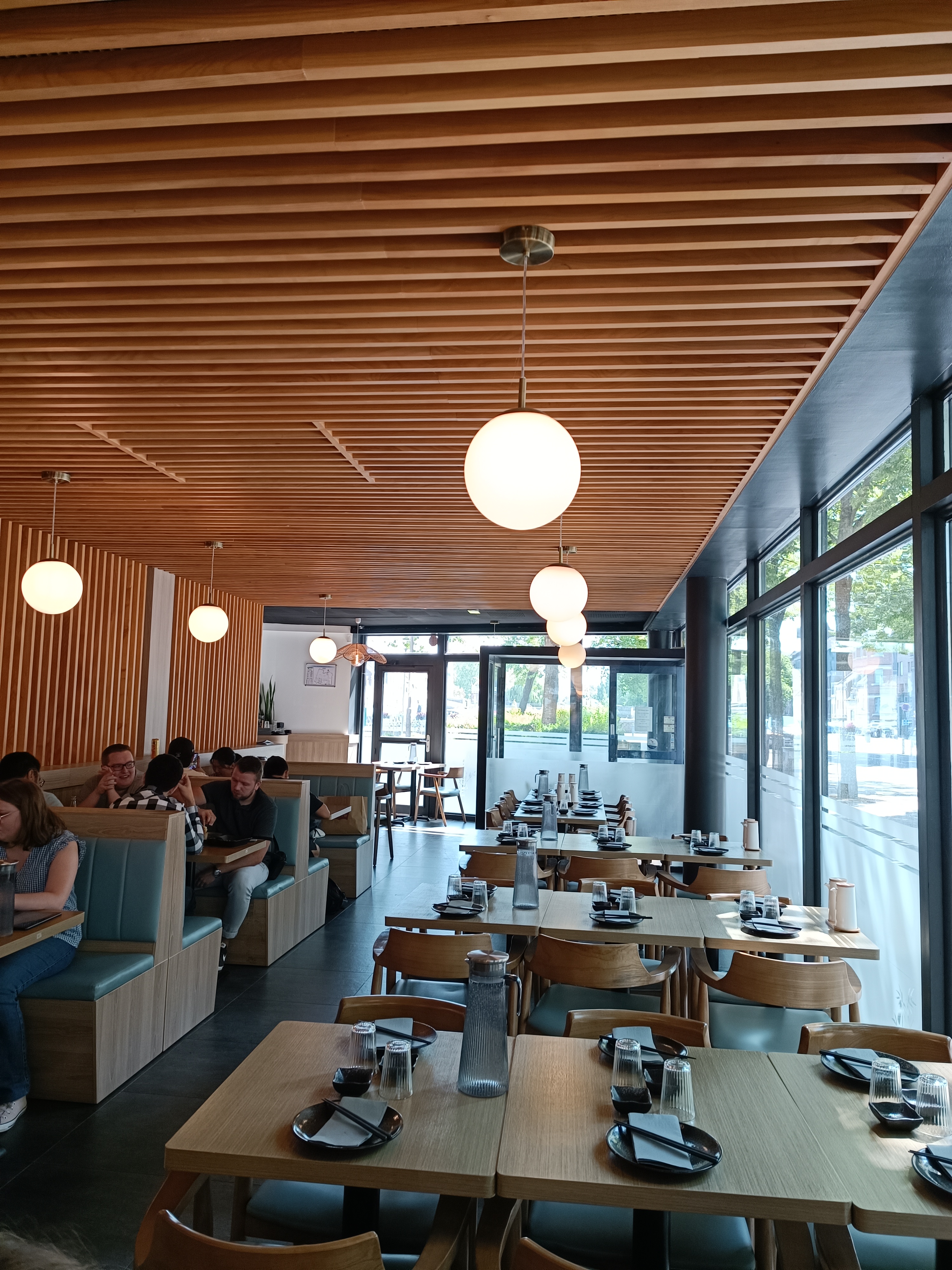 Posté le 25/07/2024 à 20:52"Formule de 5 plats x 5 fois toutes les 15 mns au choix sauf dessert, est intéressante. Conseil: commencez par les plats légers sans riz ( brochettes....) et finir par les sushis. Il est difficile d'arriver à la 5e commande. Tout se fait avec une tablette. Les commandes arrivent très rapidement. Cuisine correcte. Seuls les desserts devraient être revus. Nb: à vous de vérifier que c'est le plat commandé si vous êtes à plrs. Parfois un plat en plus non commandé arrive Prix unique, donc pas d'importance sur le type et nbr de commandes faites. Ambiance: assez bruyante car du monde 😀 Serveurs: très réactifs et sympa.👍👍 Réservation souhaitable le week end.👌"