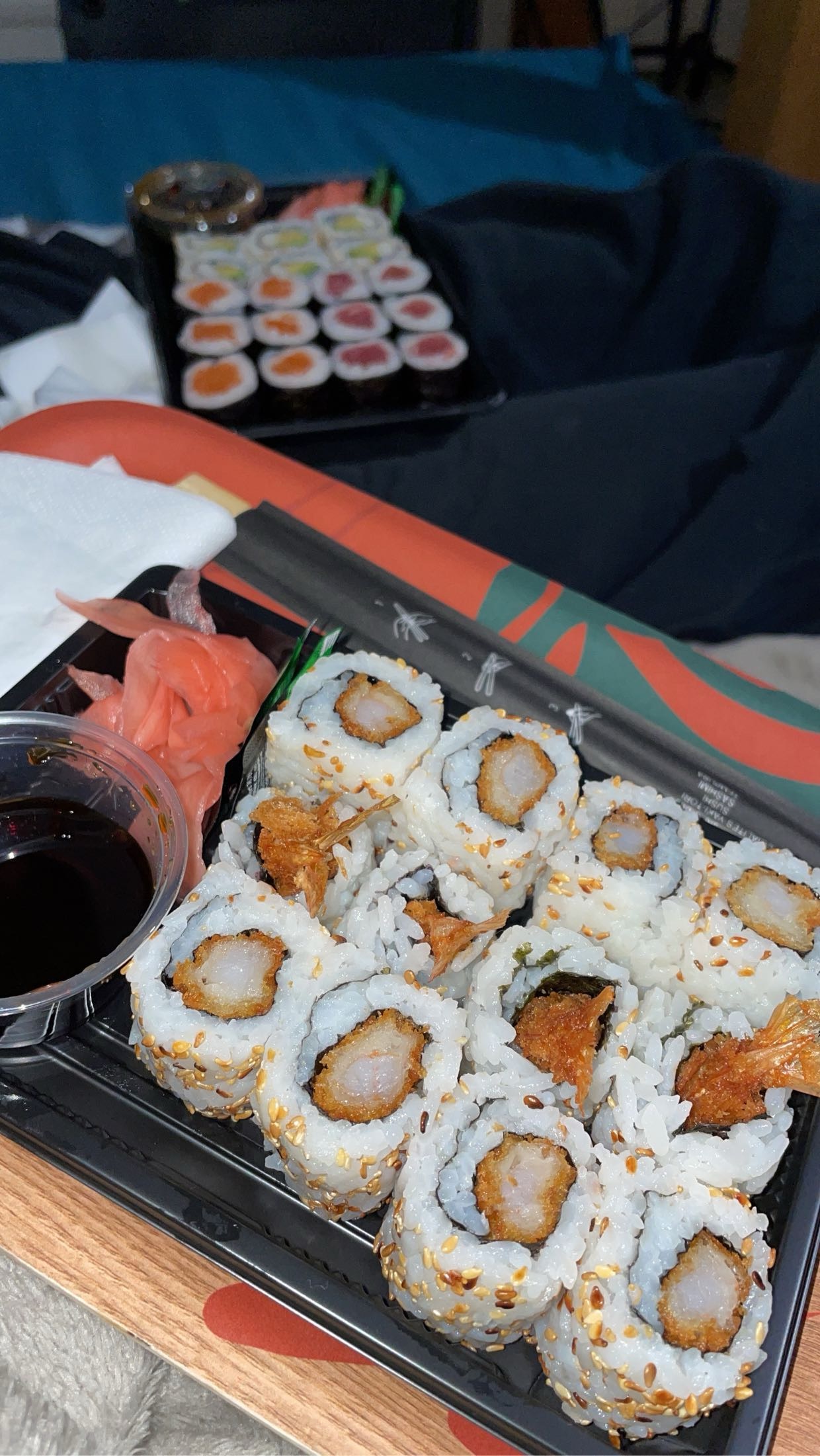 Livraison de commande de sushi, délai annoncé respecté, produits frais, des chips de crevette en cadeau, à refaire!