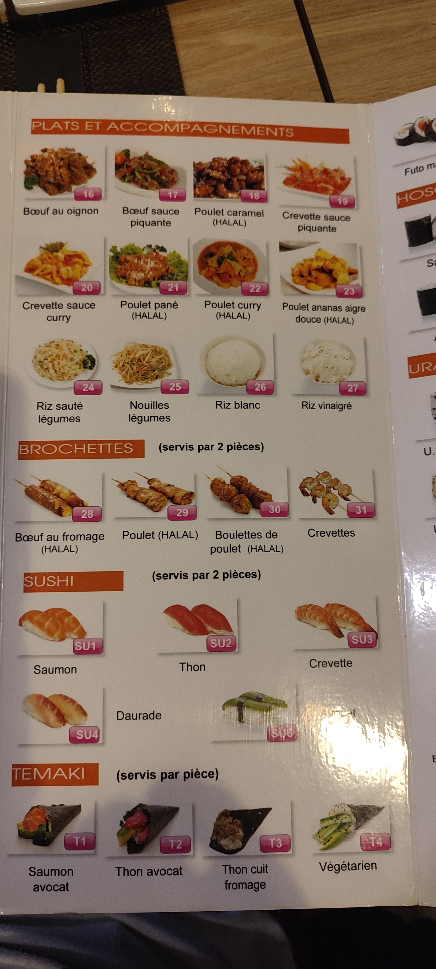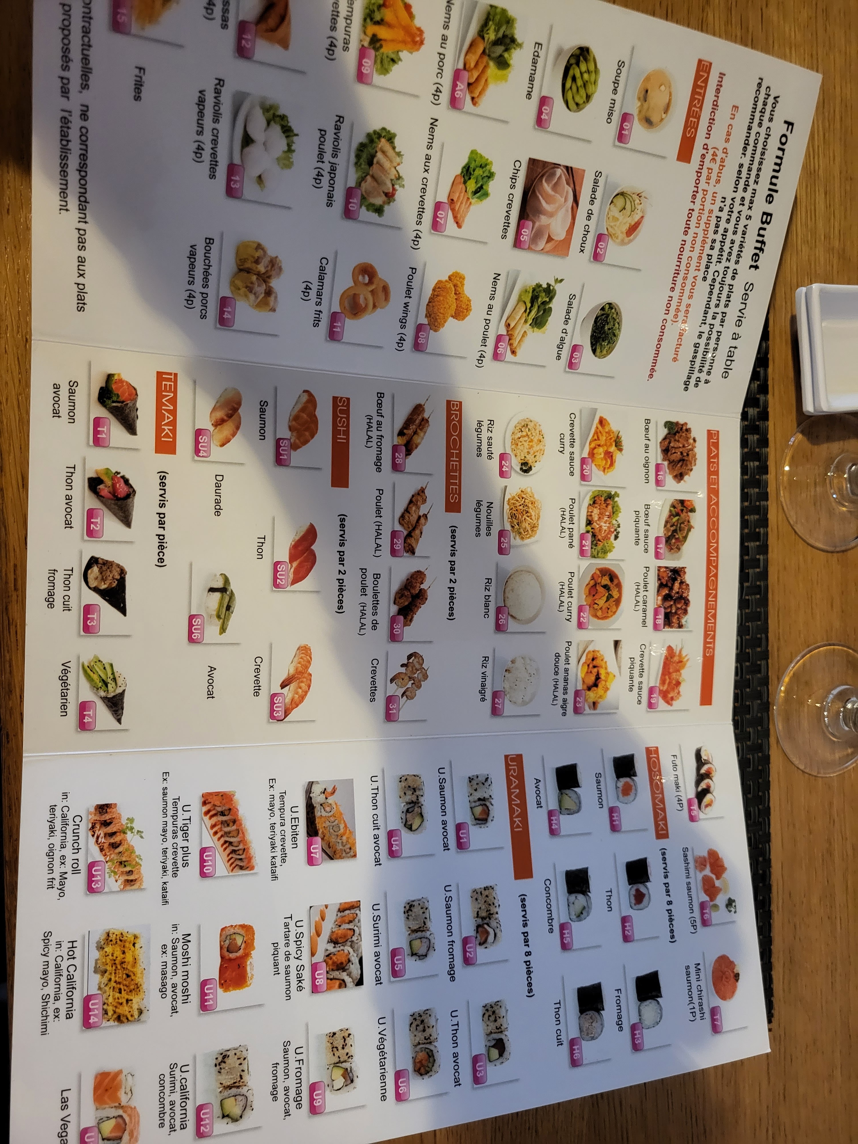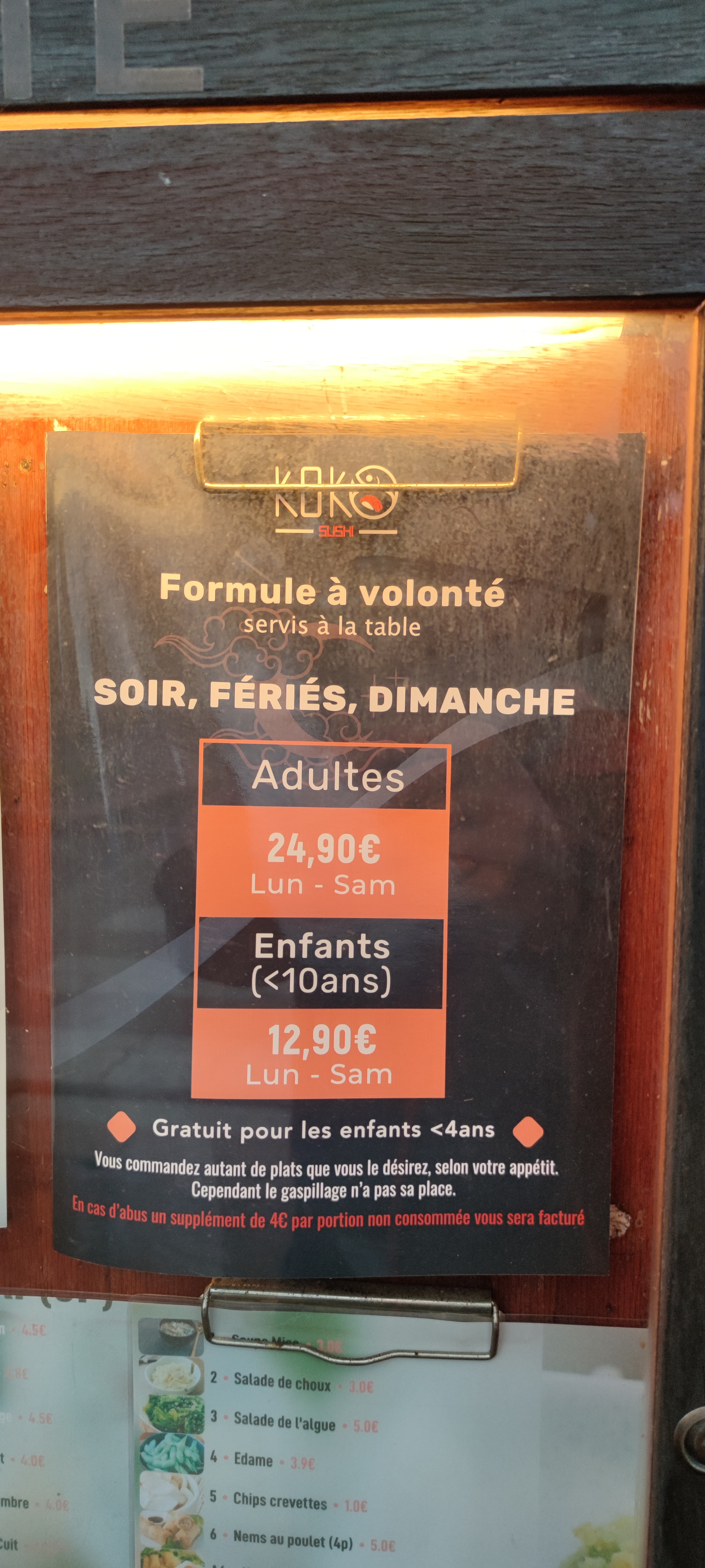 Sushi à volonté !! La commande se fait sur une fiche avec la carte. Chaque plat contient 2 à 8 pièces chacun. Bien faire attention au nombre surtout si vous êtes peu à table. Il y a toujours la possibilité de commander autant de fois que voulu. La diversité des sushis permet de goûter à tout, mais les grosses portions pour certains sont parfois de trop, il faudrait pouvoir partager pour goûter à plus de goût différents. Les sushis sont copieux et assez gros. Il y a quelque friture pour ceux qui mange moins de sushis. Le menus à volonté n'est pas forcément le même le midi et soir cetains plat ne sont que à un seul service.