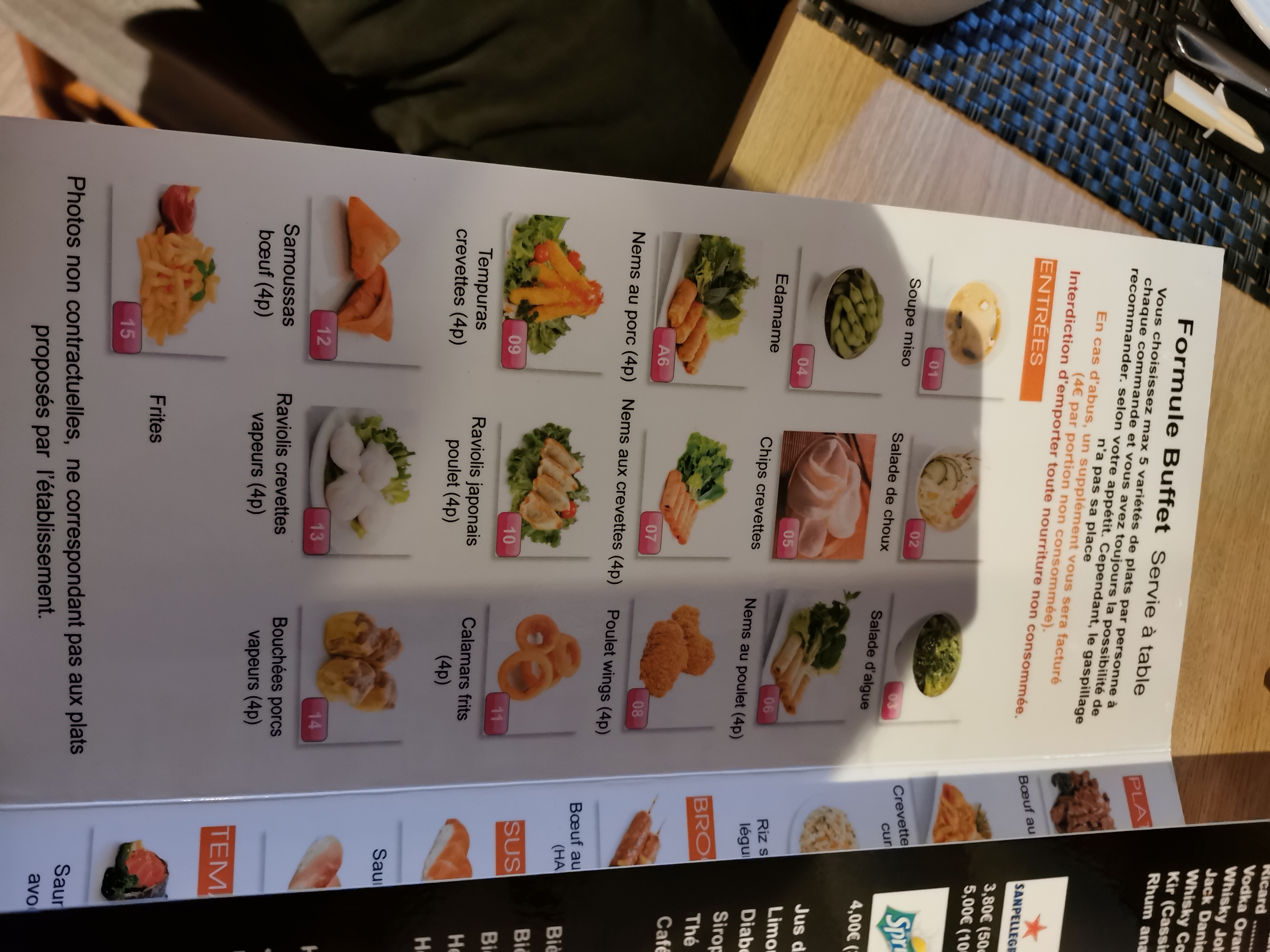 Excellent rapport qualité prix Les sushis sont excellents ! La carte est à volonté, il suffit de cocher ce que l'on souhaite manger et le tout est apporté sur un petit plateau Le service est plutôt rapide vu le nombre de tables. L'ensemble des employés sont sympathiques