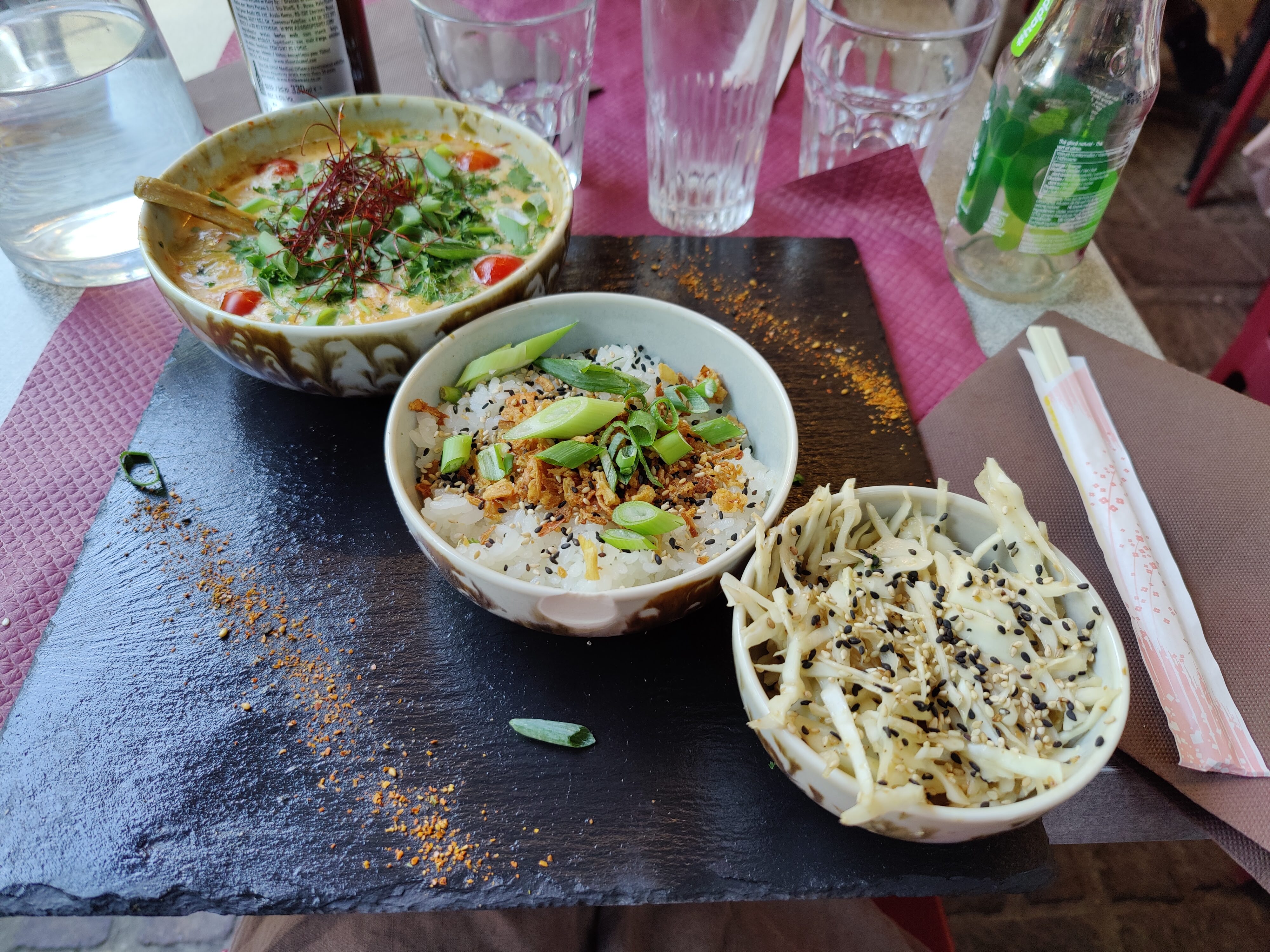 Conseillé par un ami nous avons pris un ramen Poulet Pané --> très bien. Mais nous avons aussi pris un wok poulet sauce coco curry vert --> et là c'est une révélation, non mieux : un voyage !!! Je pense que c'est le meilleur wok que nous avons mangé avec ma femme !!! Allez y les yeux fermés !