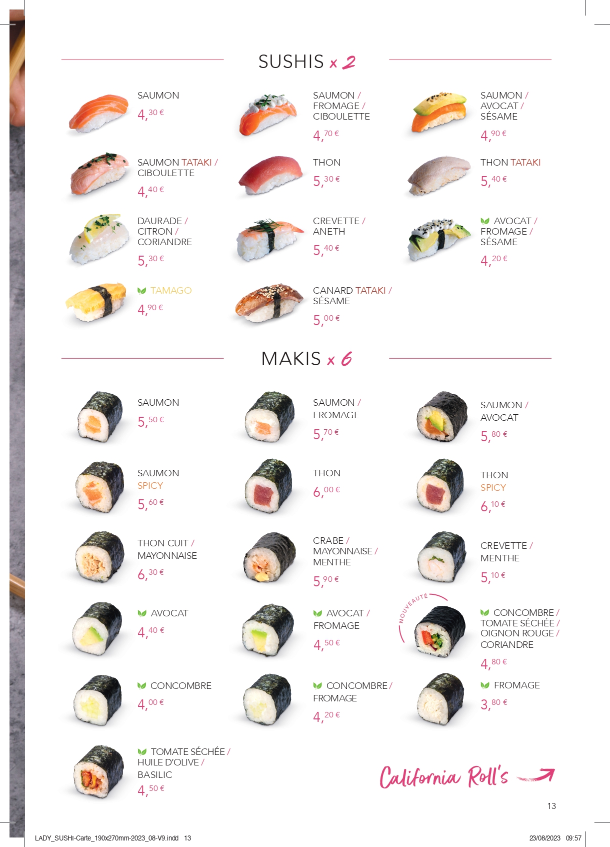 Lady sushi augmente significativement ses prix mais baisse grandement en qualité. Hier dans mes California poulet fromage, le fromage était absent. Les autres California n’avaient aucun goût ! Je ne commanderais plus.