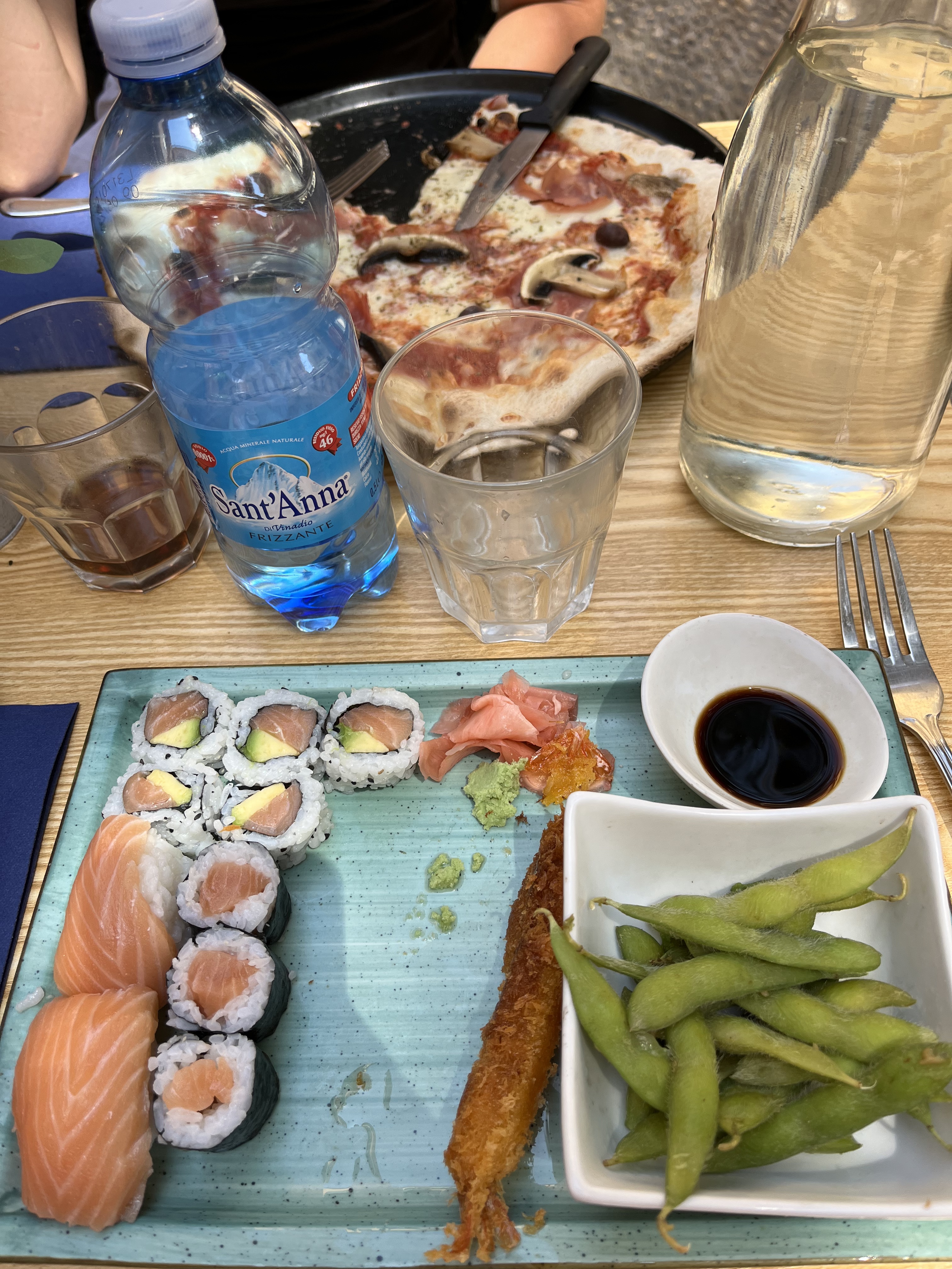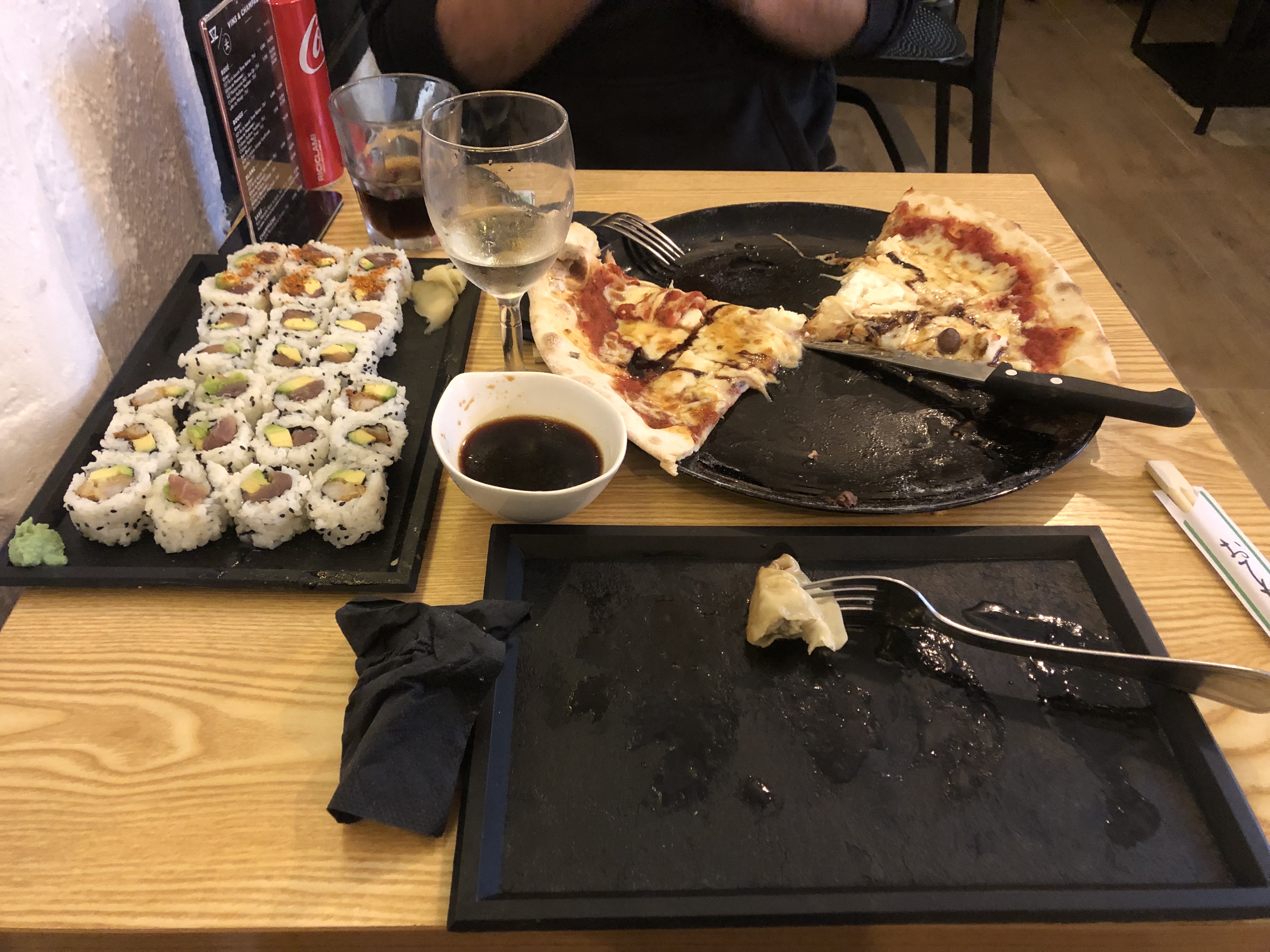 Un joli petit endroit pour prendre une pizza ou des sushis. Le service est rapide et sympathique et la nourriture est très abordable. J'ai eu une pizza margherita pour 9 €. 50 et c'était délicieux et suffisant pour 2 personnes. Je le recommande vivement si vous voulez une alternative aux restaurants les plus chers de la vieille ville.