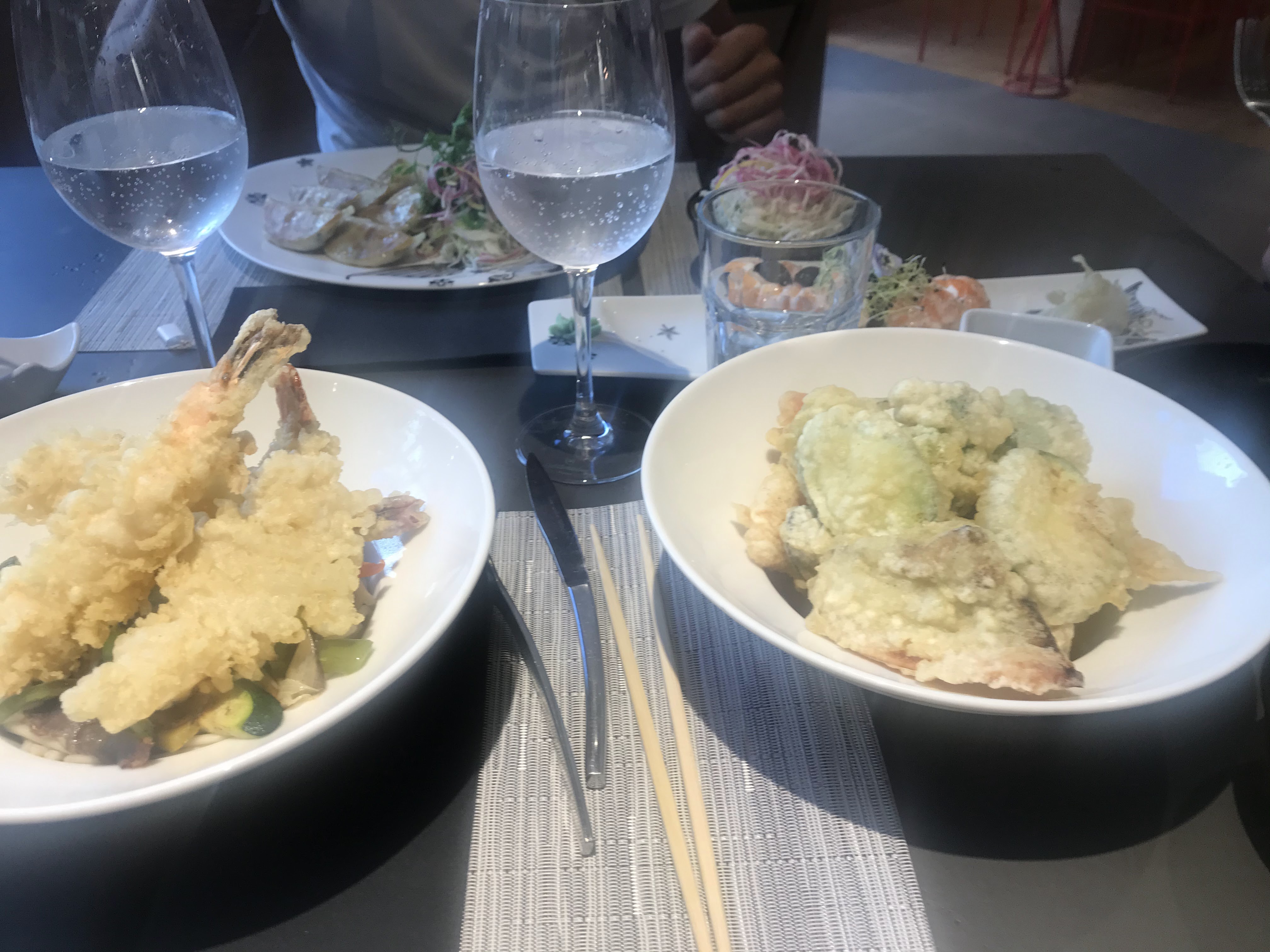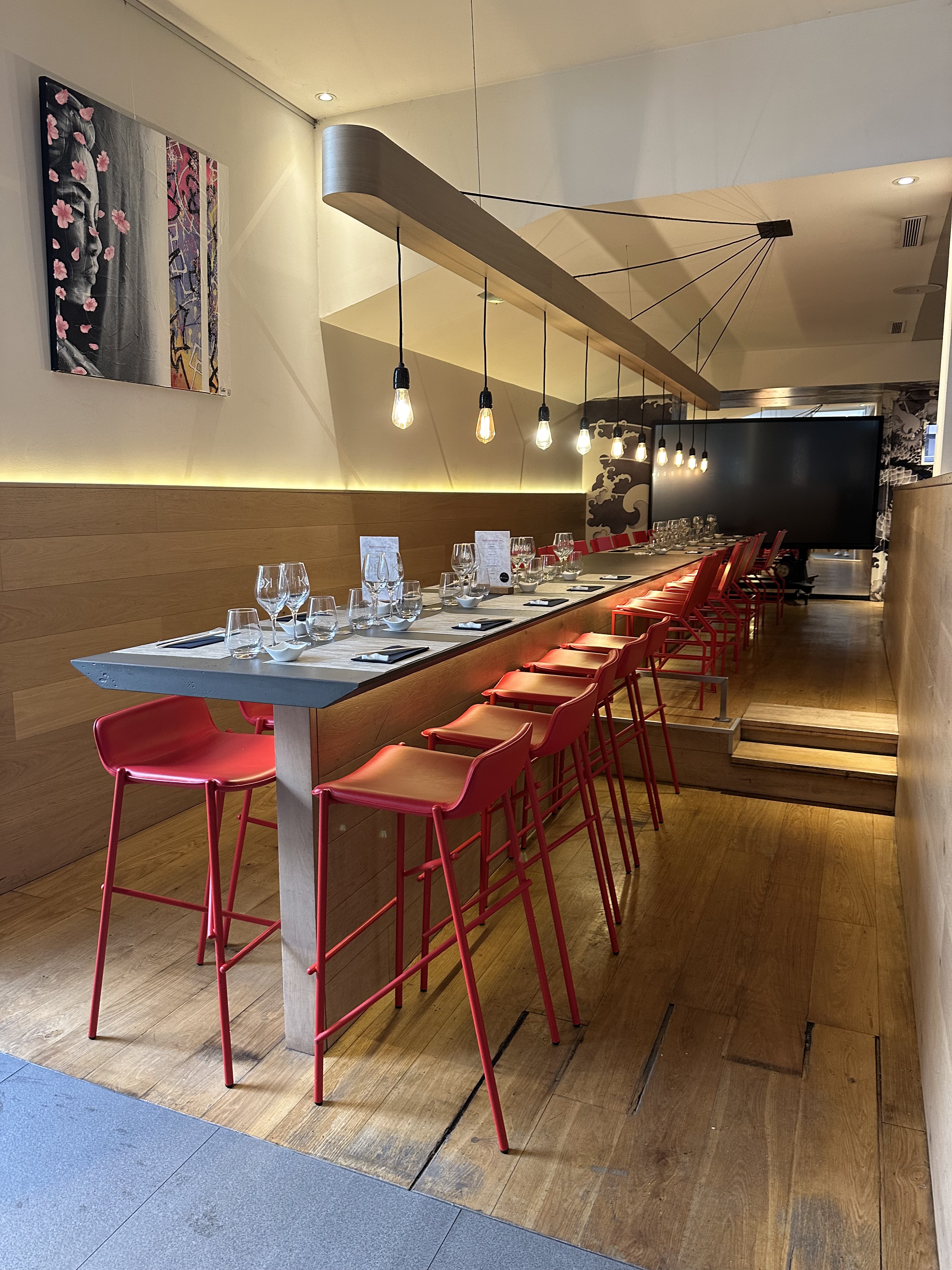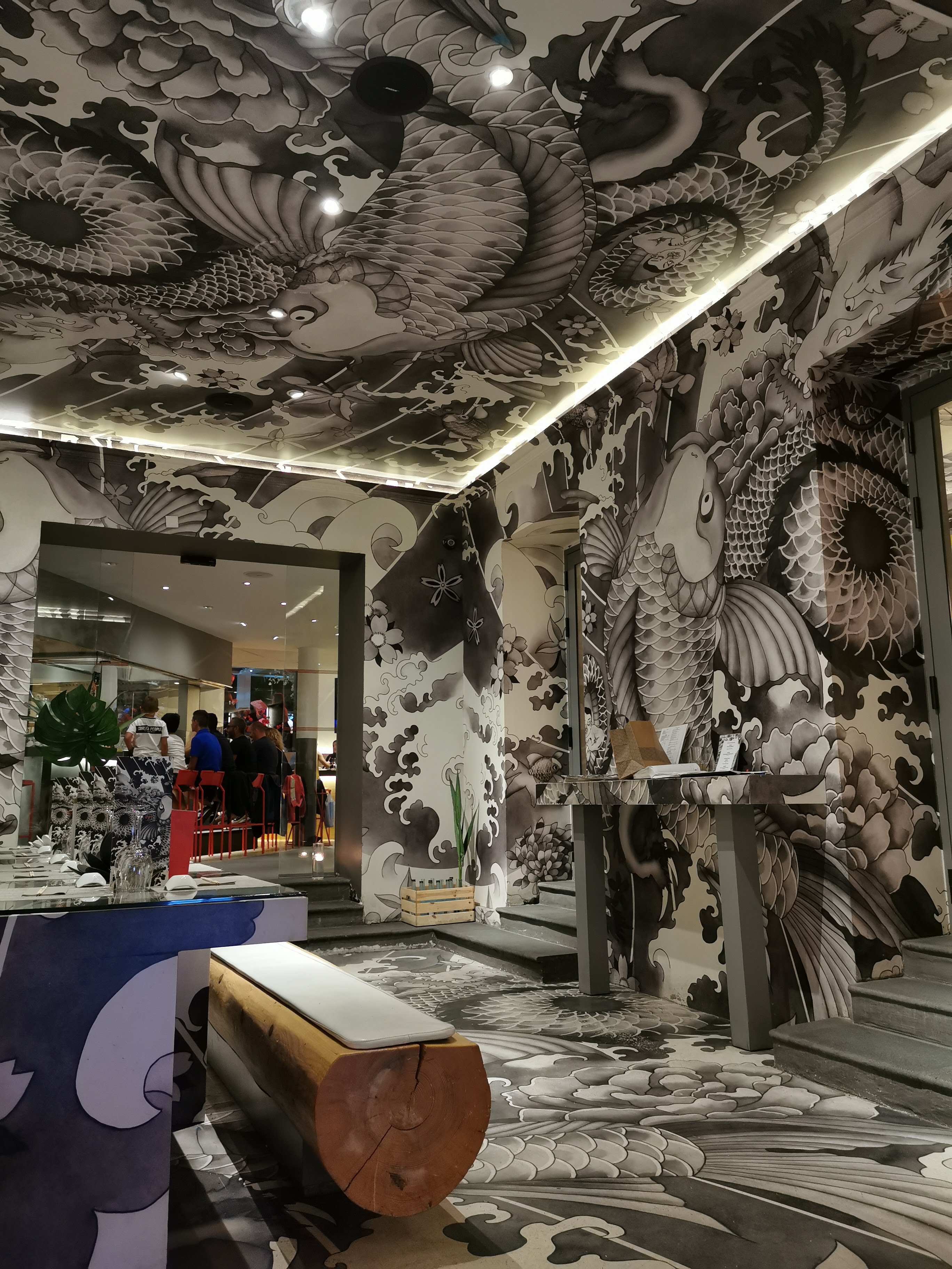 Genre de Macdo japonais avec plats préparés à l’avance. Tables « collées serrées », lumières crues, faut juste que ça tourne vite. Tout dans la présentation rien dans le goût. Sashimi de saumon tiédasse, ceviche de daurade fadasse et légumes sûrement surgelés… Si vous passez dans le coin allez au kebab d’en face ce sera plus authentique et 4 fois moins cher