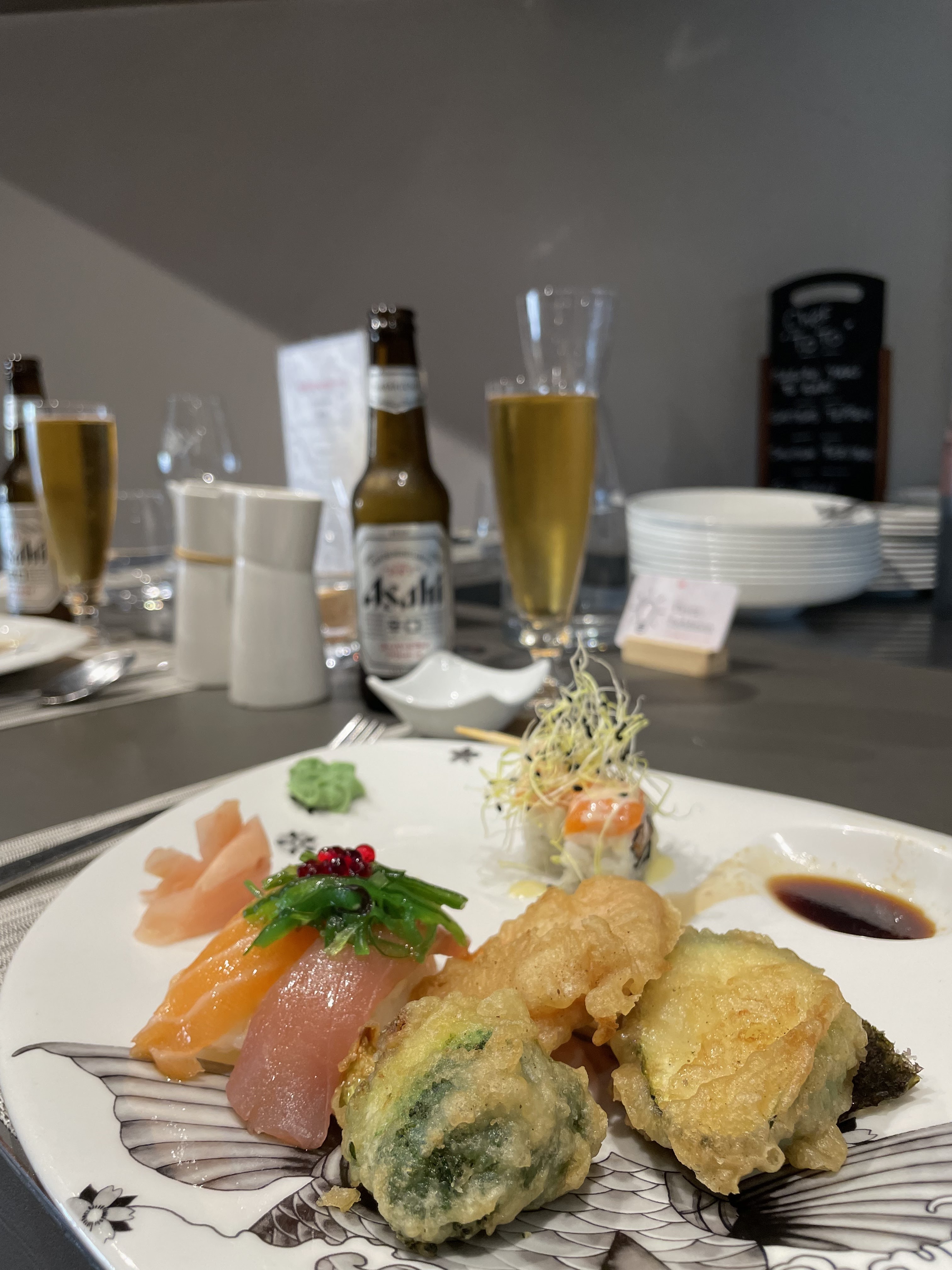 Excellente soirée à deux dans ce restaurant. Les salles sont grandes et se remplissent vite. Le service est très rapide la cuisine est excellente le tout dans une ambiance agréable. Un gros plus pour la pression de kirin et le cocktail du jour. Nous avons pris des californias un plateau de sushis et un ramen au porc. Tout est très bon, j’ai seulement trouvé le bouillon du ramen salé. Nous reviendrons goûter le reste de la carte avec plaisir.