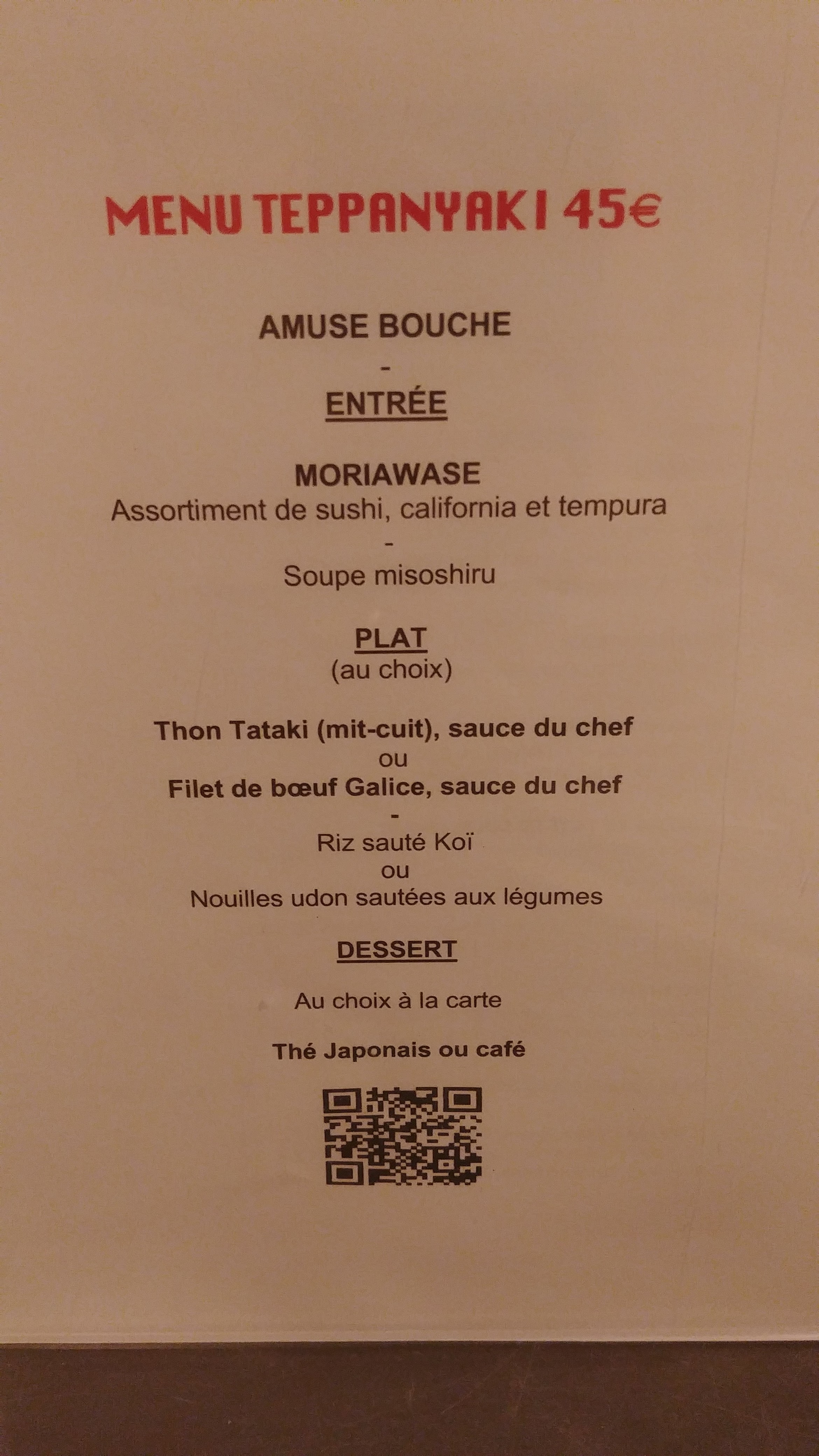 Super resto japonais ! Les plats sont bons et très copieux. L'animation sur plaque chauffante est très divertissante. Le menu a 45€ vous donne une bonne idée des différents plats.