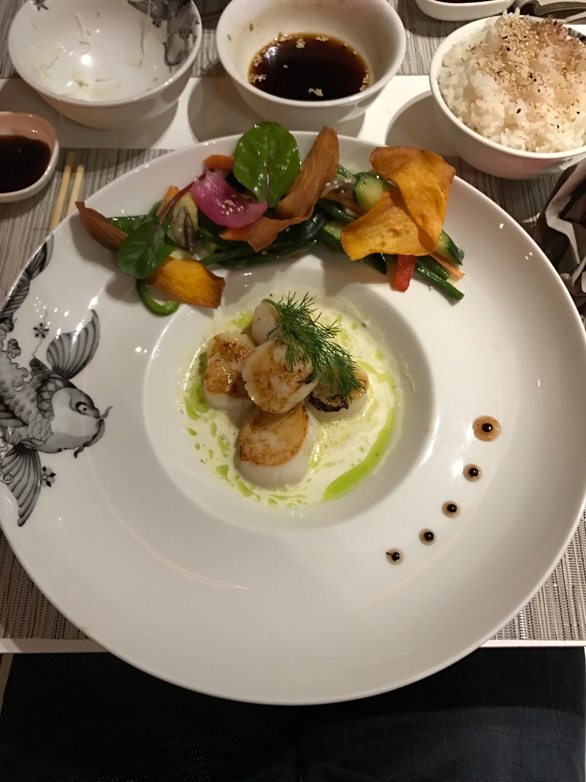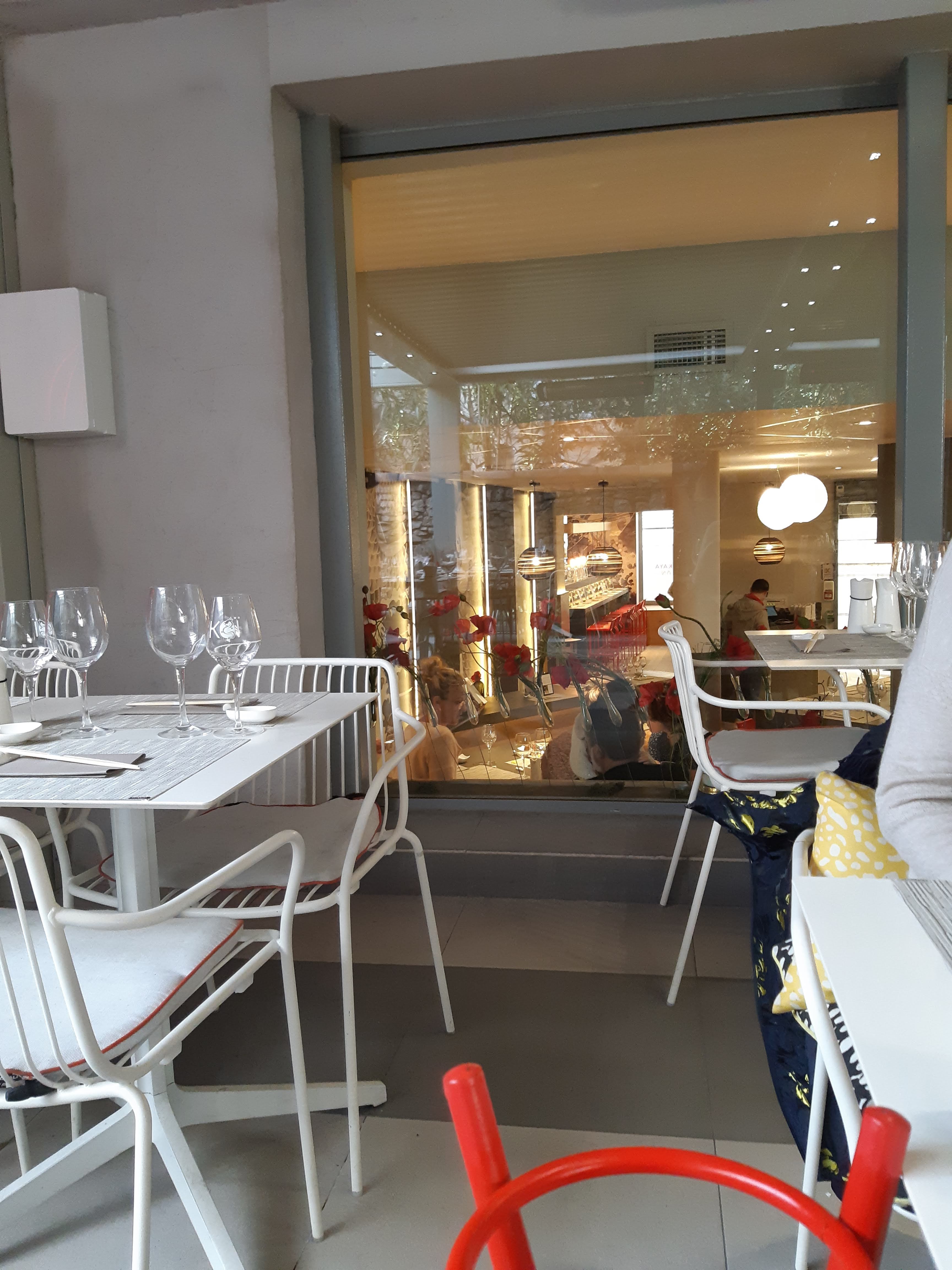 Complètement fan du koi sushi bar sur le cours Mirabeau, je suis passée par hasard devant le grand frère rue Paul Doumer. Séduite par ce restaurant vaste et au design épuré et stylisé, j’ ai pu enfin le tester en amoureux il y a quelques jours. Le décor tient ses promesses avec une thématique très japonisante, le chef à l’abri derrière des vitres fait son show puis on monte vers une vaste terrasse très agréable. Le service est impeccable même si cela manque un peu de chaleur à mon goût, notre serveur n’a pas été sensible à notre humour c’est son droit 😉 . Passons aux choses sérieuses le repas, une carte sobre avec ce qu’il faut, une petite remarque pour la végétarienne que je suis cela manquait de choix mais bon. Donc je commande une soupe miso mon chéri des tempuras végétariens, là grosse déception ma soupe miso contenait des morceaux de ...poulet beurk et surtout pas d’excuses ni de geste pour la changer juste une remarque vous savez cela arrive sic je le constate effectivement ! Bon je passe outre, je déguste des sushis végétariens et mon amoureux un bœuf Angus c’était bon mais sans plus et vu le prix nous étions un peu déçus. Passons au dessert mon chéri prend un gâteau au chocolat sur une carte des desserts éphémère et moi mes mochis adorés là encore c’etait Bon mais ... grosse déception par rapport au petit koi et à la gestion de mon incident poulet. 90€ à deux au lieu de 50€ sur le cours Mirabeau c’est tout vu. Quel dommage.