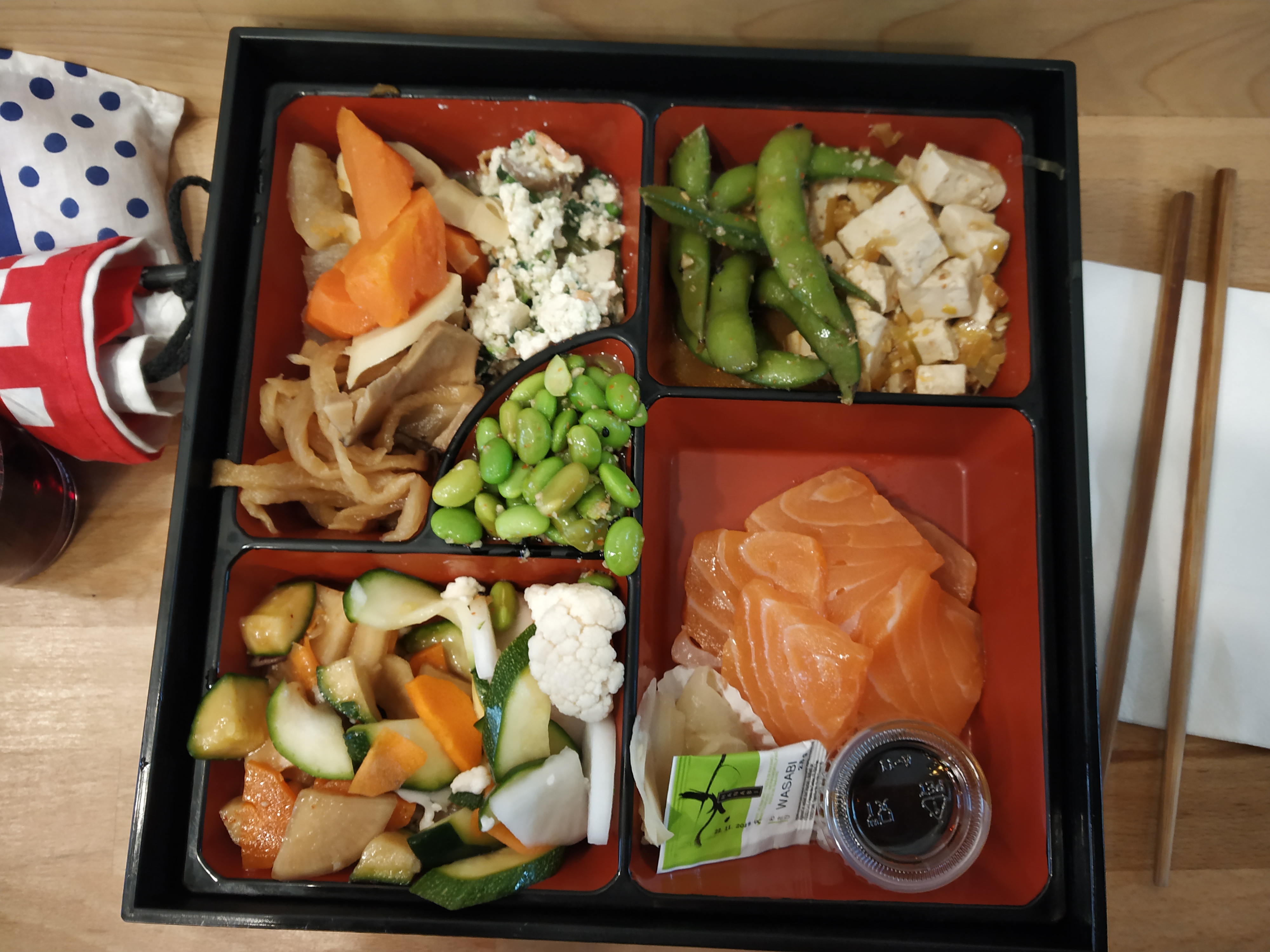 Excellent bento, saumon façon tataki, oden, et pickles. Bonne quantité pour éviter de pioncer juste après le déjeuner. En revanche je conseille de ne pas le manger dans un minable coworking, pour éviter d’avoir le bourdon. 5 étoiles.
