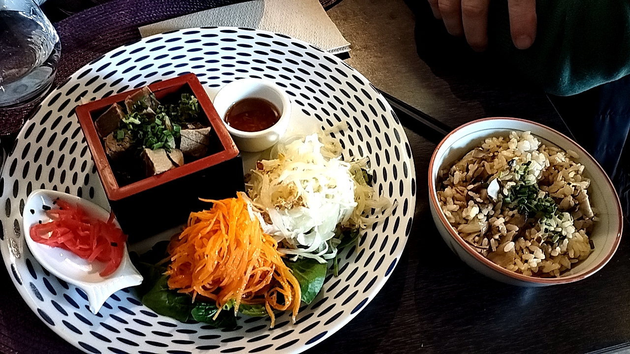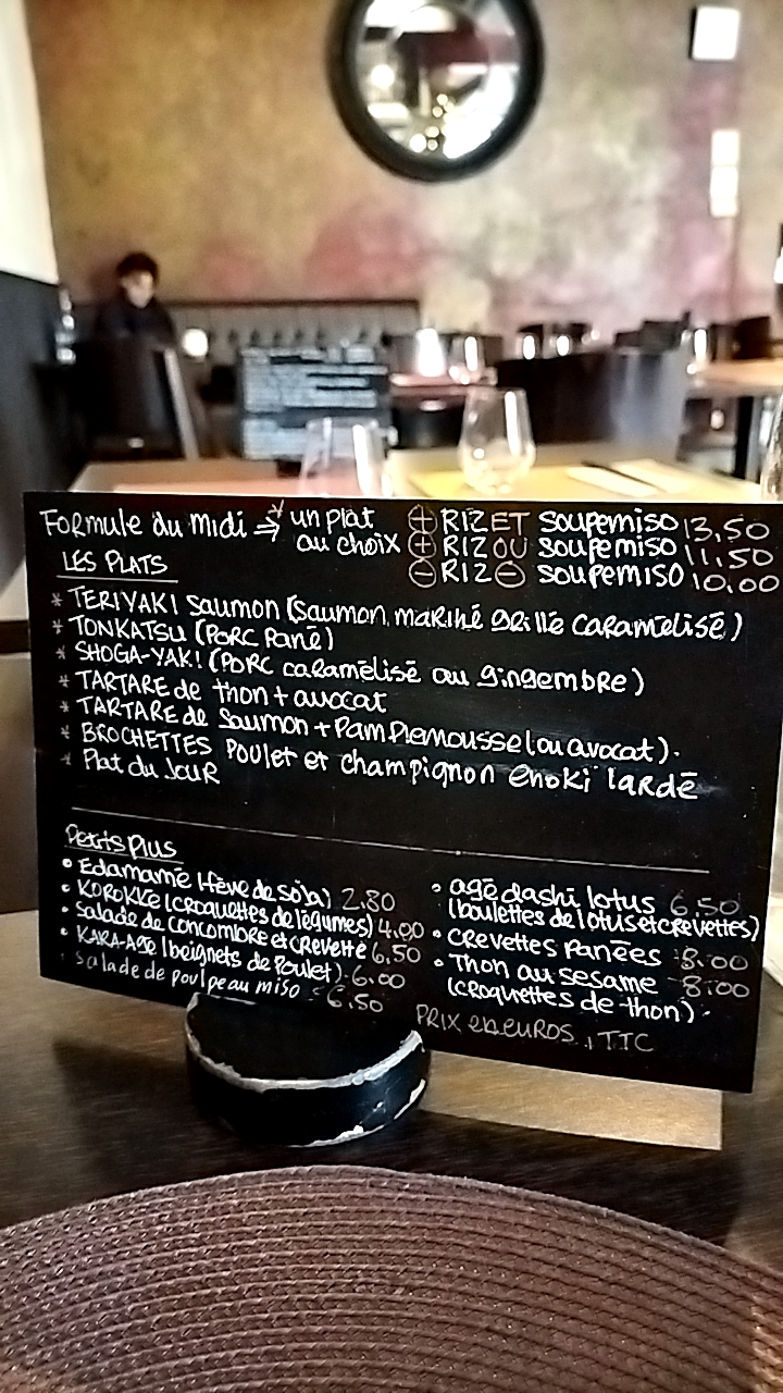 Restaurant intimiste , j’ai commandé un saumon teriyaki dans la formule midi avec riz et soupe miso qui d’ailleurs été très bonne . Portion pas si copieuse mais suffisamment pour vous rassasier sauf si vous avez un grand appétit . Le service agréable
