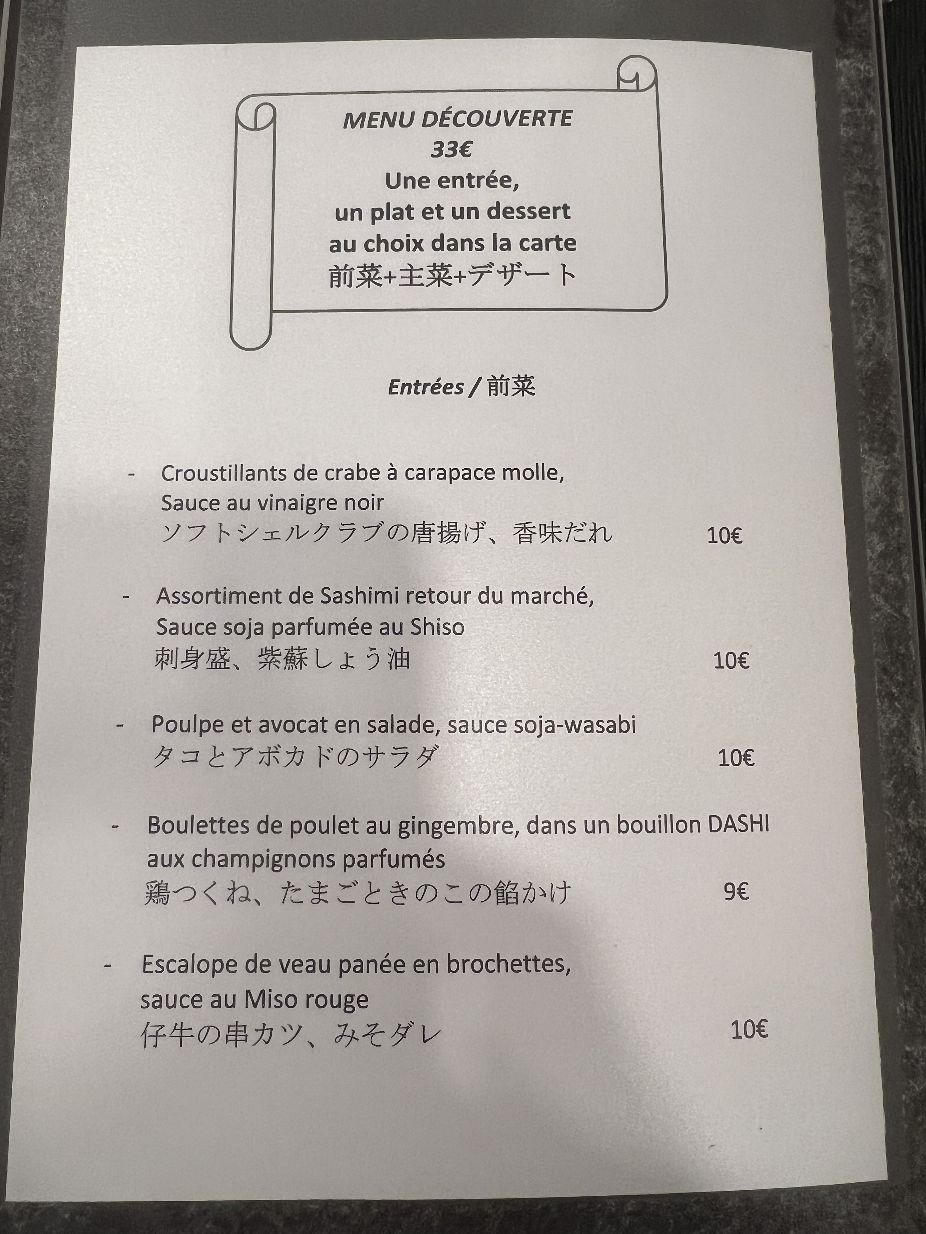 Un repas très bon , comme là bas avec un umeshu en apéritif, de succulent poulpe en salade et de la lotte... que dire on ce serai cru l'espace de quelques instants dans un restaurant a kyoto... le personnel très aimable. On a passé un excellent moment on reviendra.