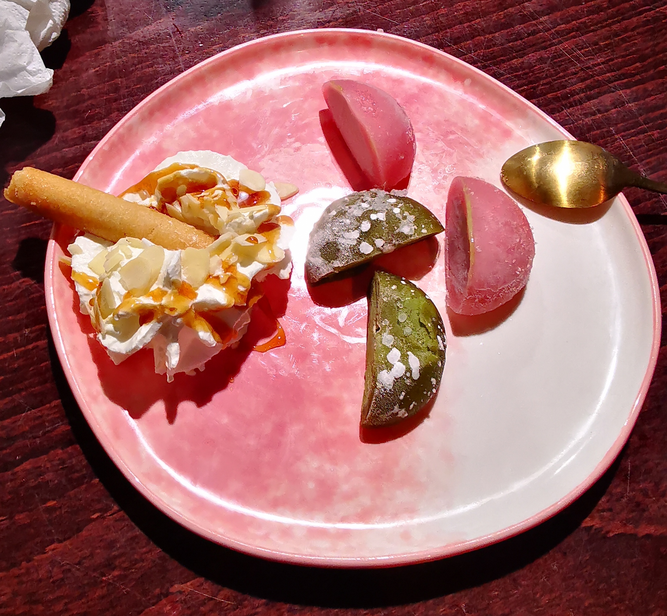 Belle découverte concernant les plats proposés ! Nous nous sommes RE-GA-LES, un grand BRAVO au cuisto derrière ! :) Les points négatifs : - Servir l'apéritif en même temps que l'entrée, c'est quelque chose que je ne comprends pas. - Un apéro oublié lors de la commande, nous avons attendu près de 10 minutes avant de le signaler au serveur, pour pouvoir enfin l'avoir. - Le serveur qui vient nous servir tous nos plats, il faut les récupérer directement dans ses mains, pas de bol un des plats tombe sur ma fille.. ; - Le serveur était complètement perdu donc trop de temps à prendre les desserts, il était complètement à l'ouest. Je suis presque certaine que celui-ci débuté et je suis consciente qu'il faut un début à tout, je sais être quelqu'un de compréhensive mais ce serveur devrait être un peu plus accompagné afin d'apprendre correctement ce métier.