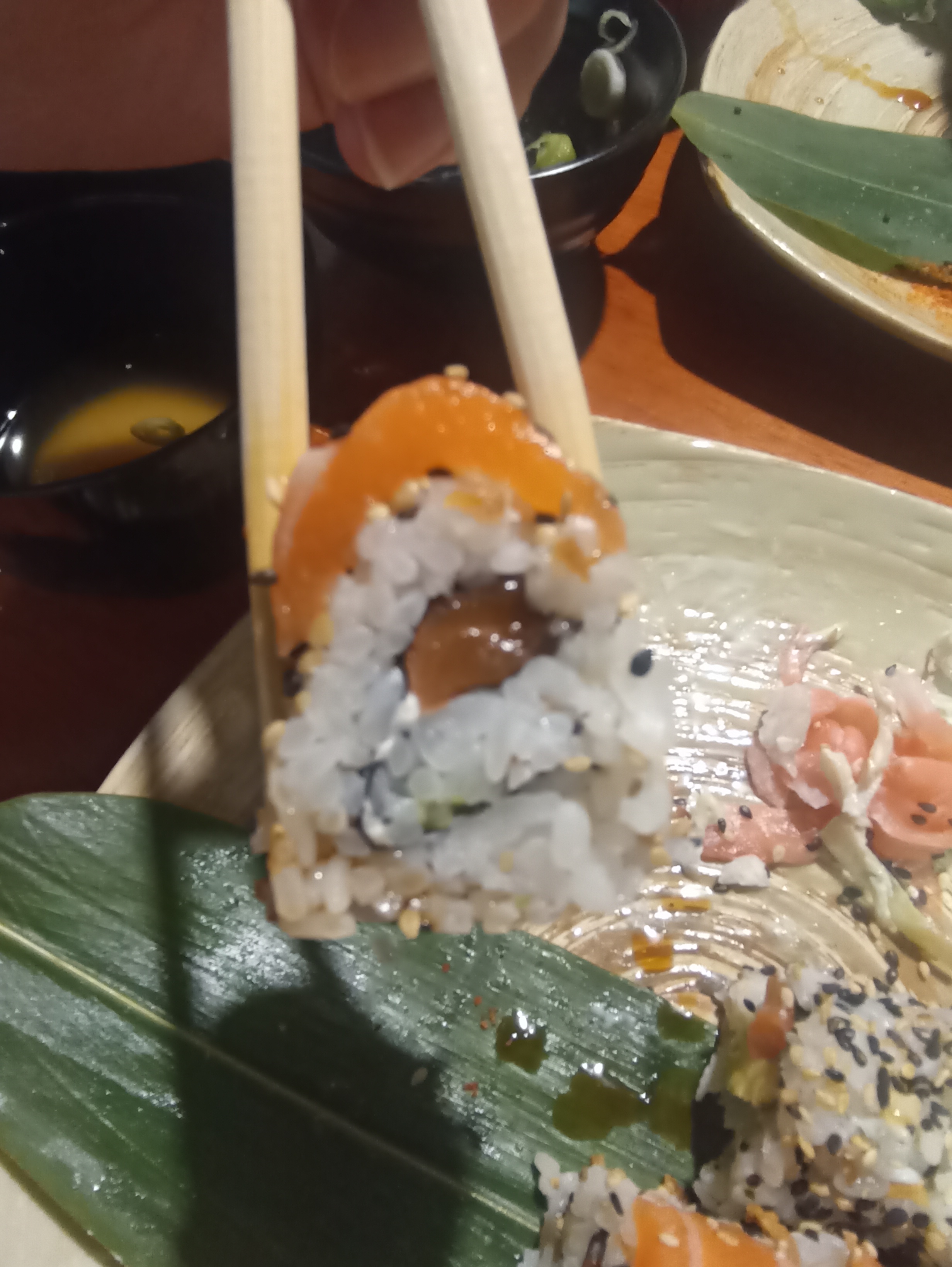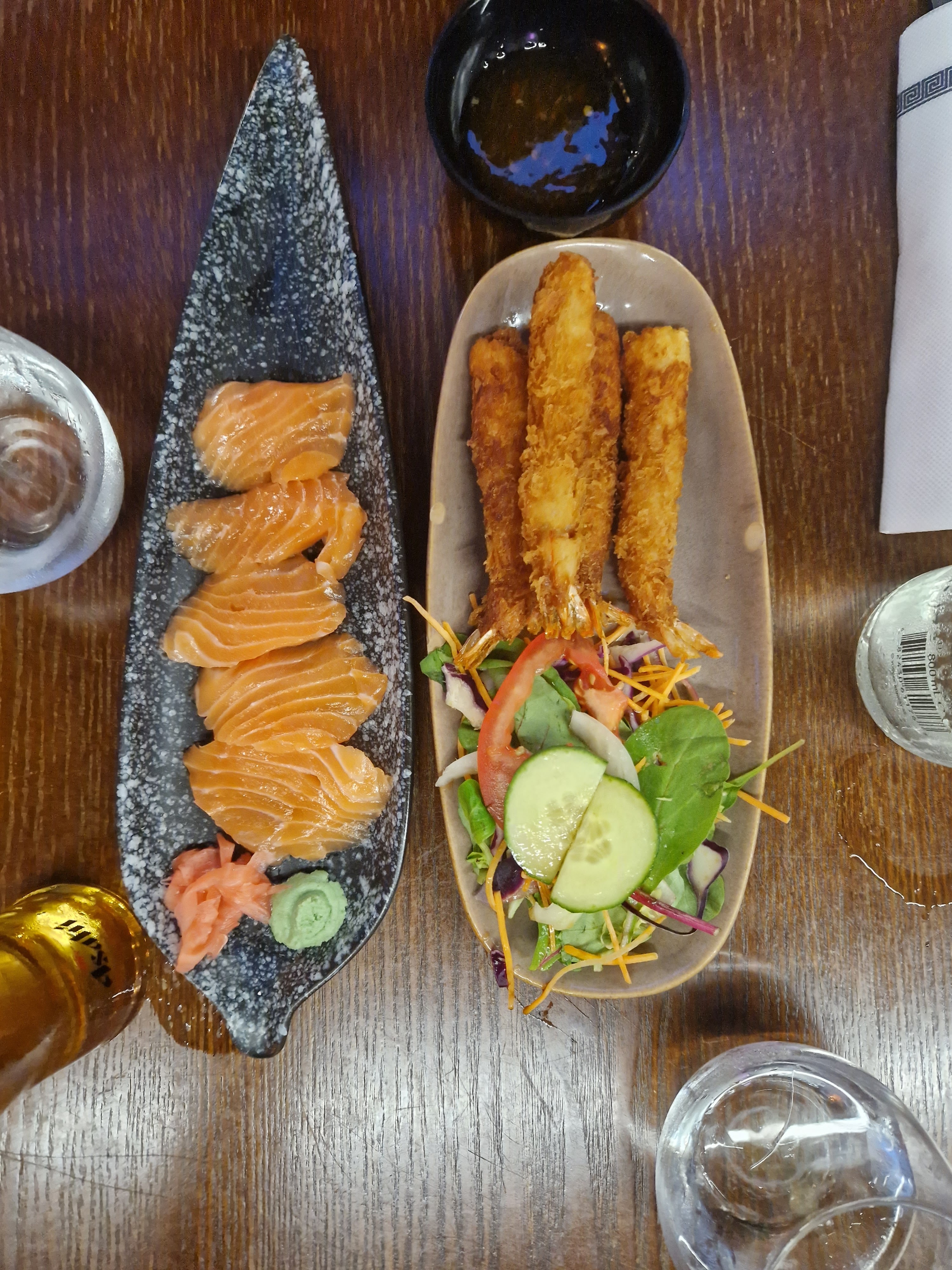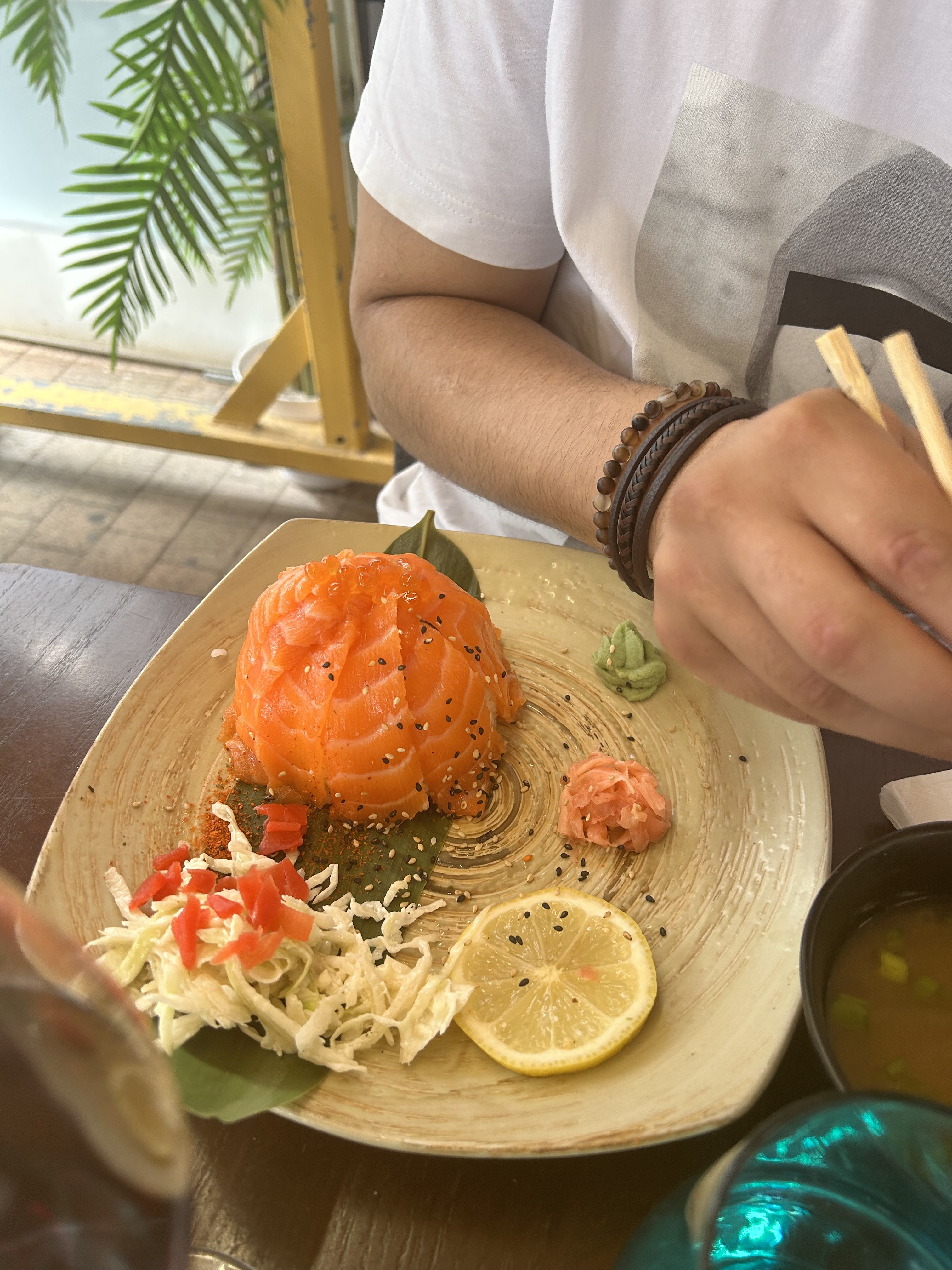 40€ de sashimi de saumon pas frais parti à la poubelle ( le saumon se détache de lui même et a un goût d’eau les sashimi sont soit petits soit c’est le filet directement) avec 2 petits pots de soja coupé à l’eau quelle honte, pire restaurant de La Rochelle