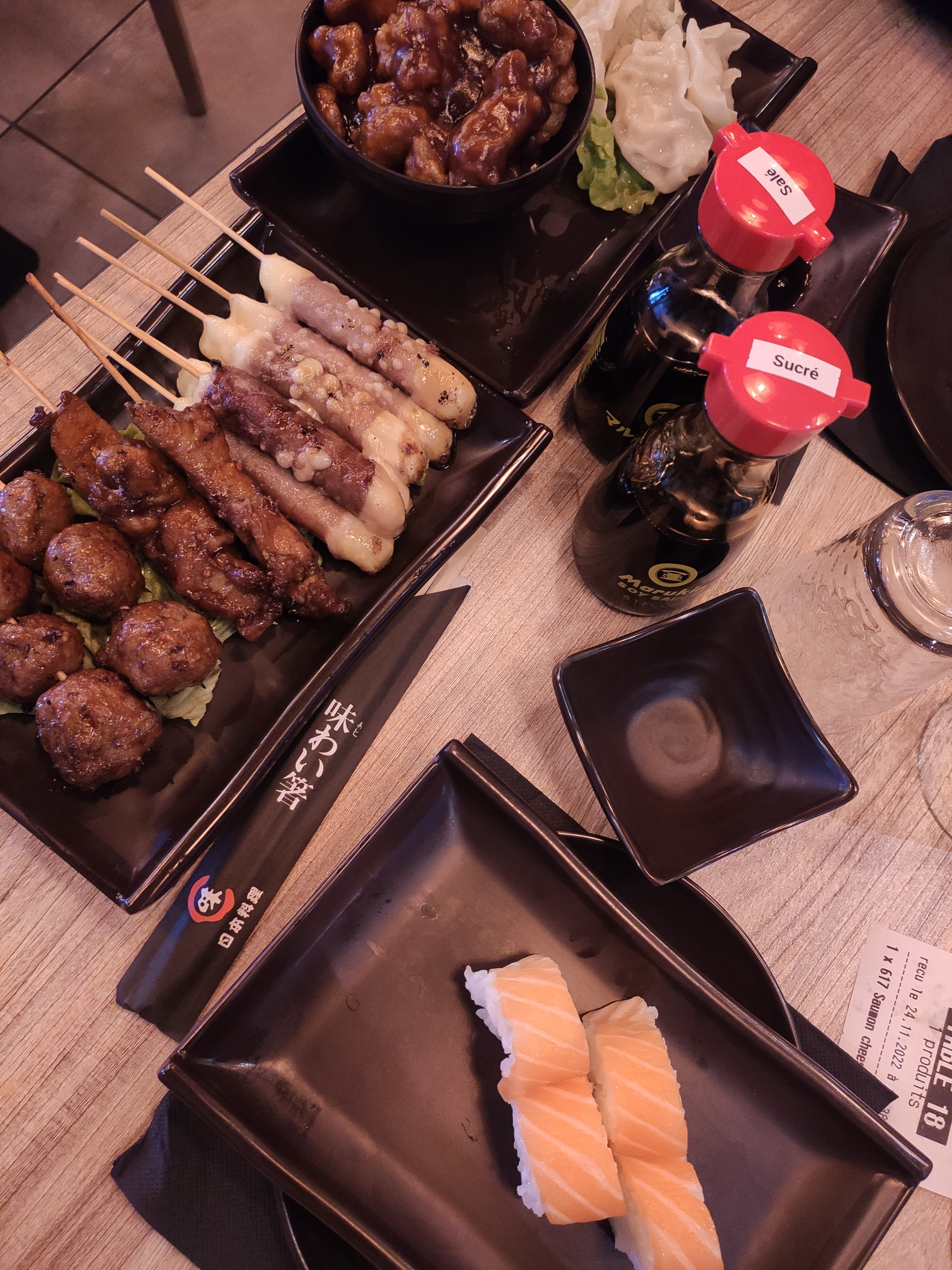 Posté le 21/01/2025 à 17:16"Excellent ! Les sushis sont à tomber par terre ! 🥰🥰 Et les fritures , brochettes sont très bonnes ( un peu froides ) Le kimchi par contre n’est pas bon du coup je ne vous le conseille pas et les plats baignent dans la sauce …"