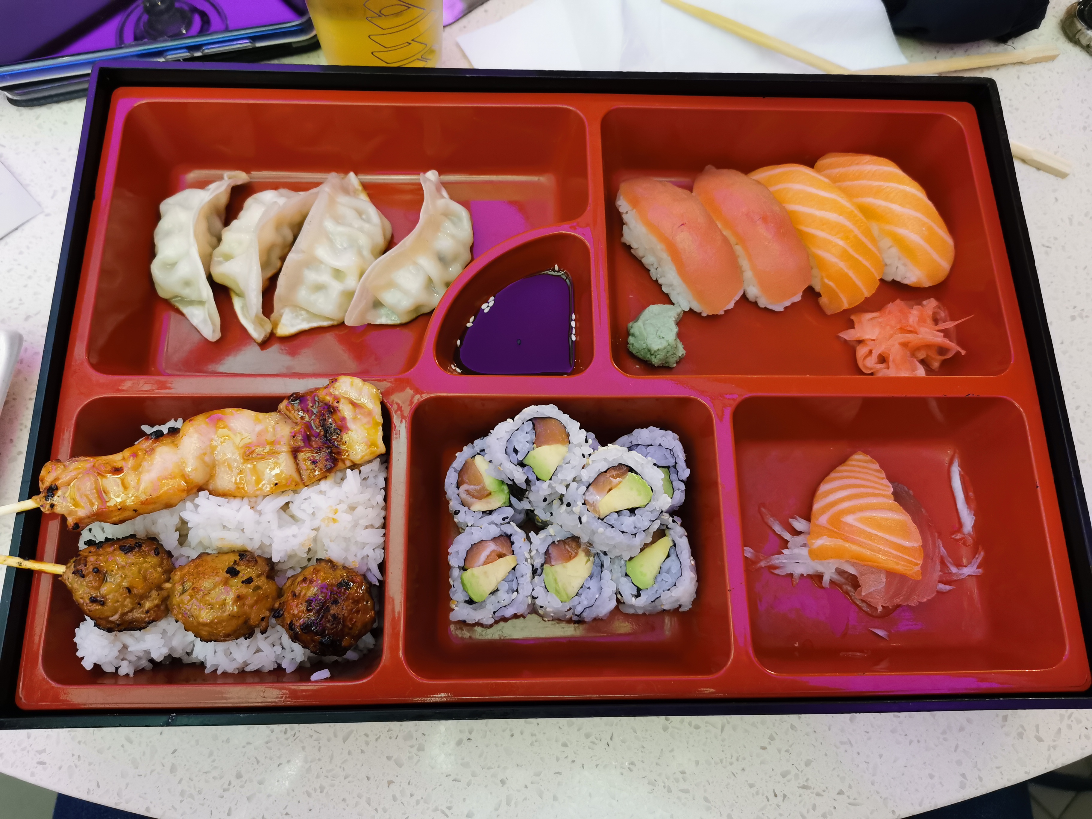 Sushis, makis, etc si petits qu'on n'en fait qu'une bouchée 😞Revoyez vos quantités car cher pour ce qu'on a dans l'assiette. Pensez à augmenter le chauffage car très désagréable de manger dans le froid.