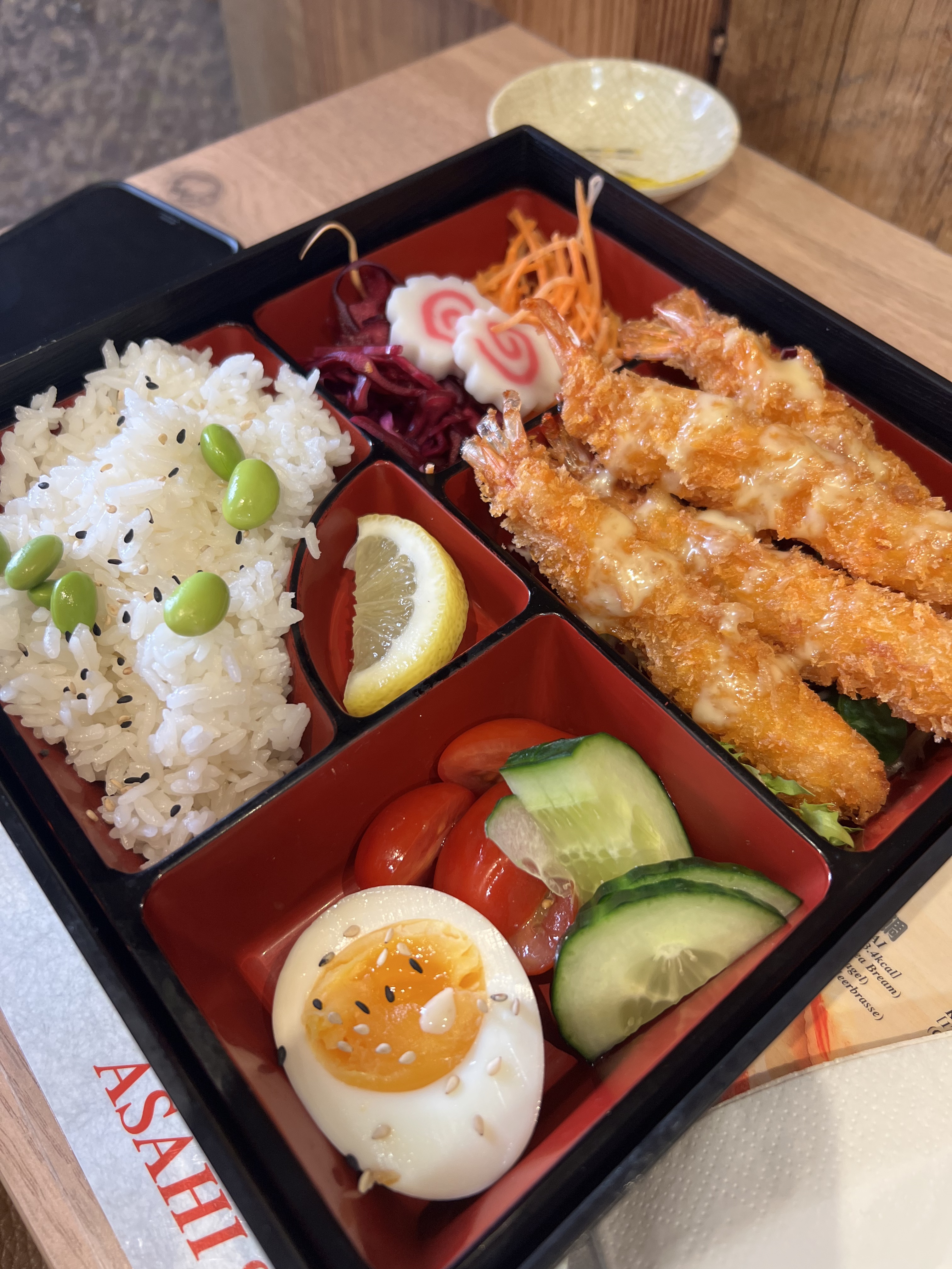 Avis partagé... Nous avons trouvé les plats globalement bons. Pour le ramen commandé, les nouilles étaient trop agglomérées et l'oeuf mollet froid. Pour le bento, très bien garni, les sauces étaient très bonnes, toujours cet oeuf mollet froid, et nous avions commandé des gyozas végétariens, or nous avons eu des gyozas au POULET ! Assez déçu que notre commande n'ai pas été complètement respectée, surtout que c'était à emporter... Néanmois, le personnel était agréable et efficace.