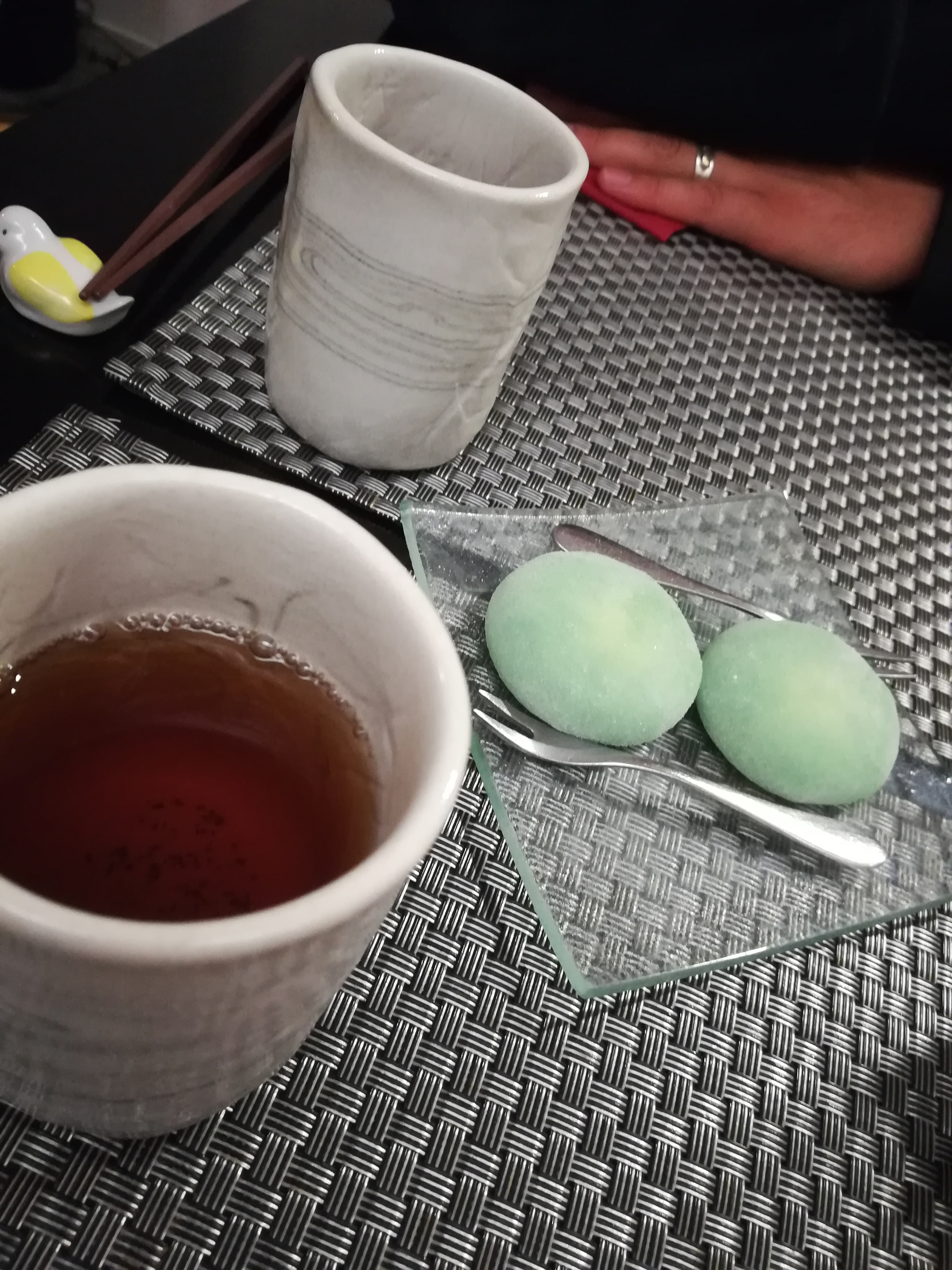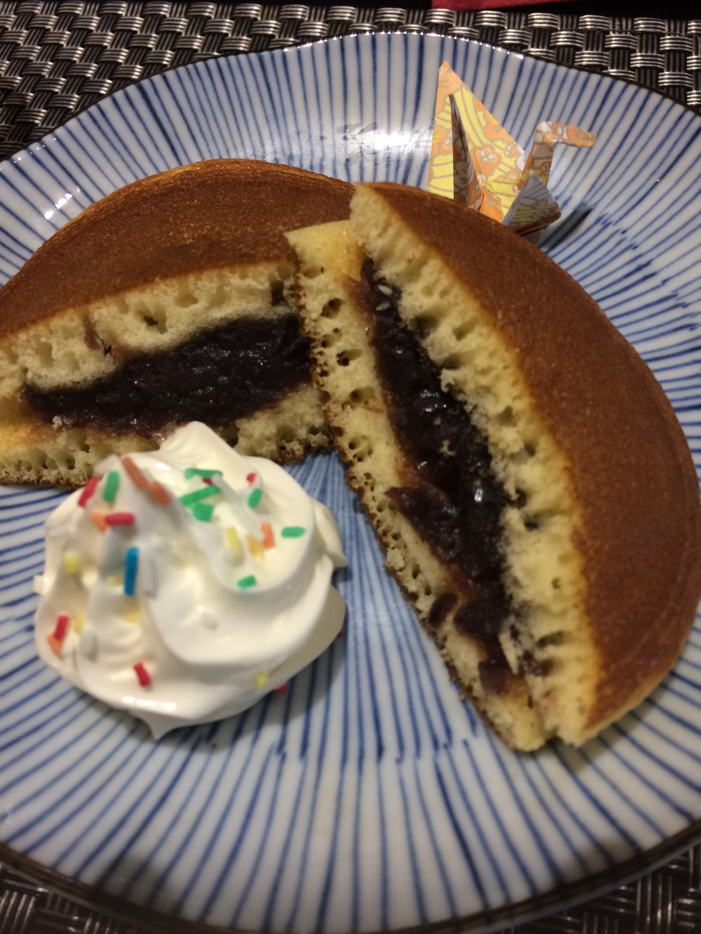 Ambiance chaleureuse, super repas ! J’ai pris un ume shu (alcool de prune), des takoyaki, des ramen et un dorayaki. C’était très bon ! Et j’ai adoré la grue en décoration pour le dorayaki ! J’y reviendrai surement !