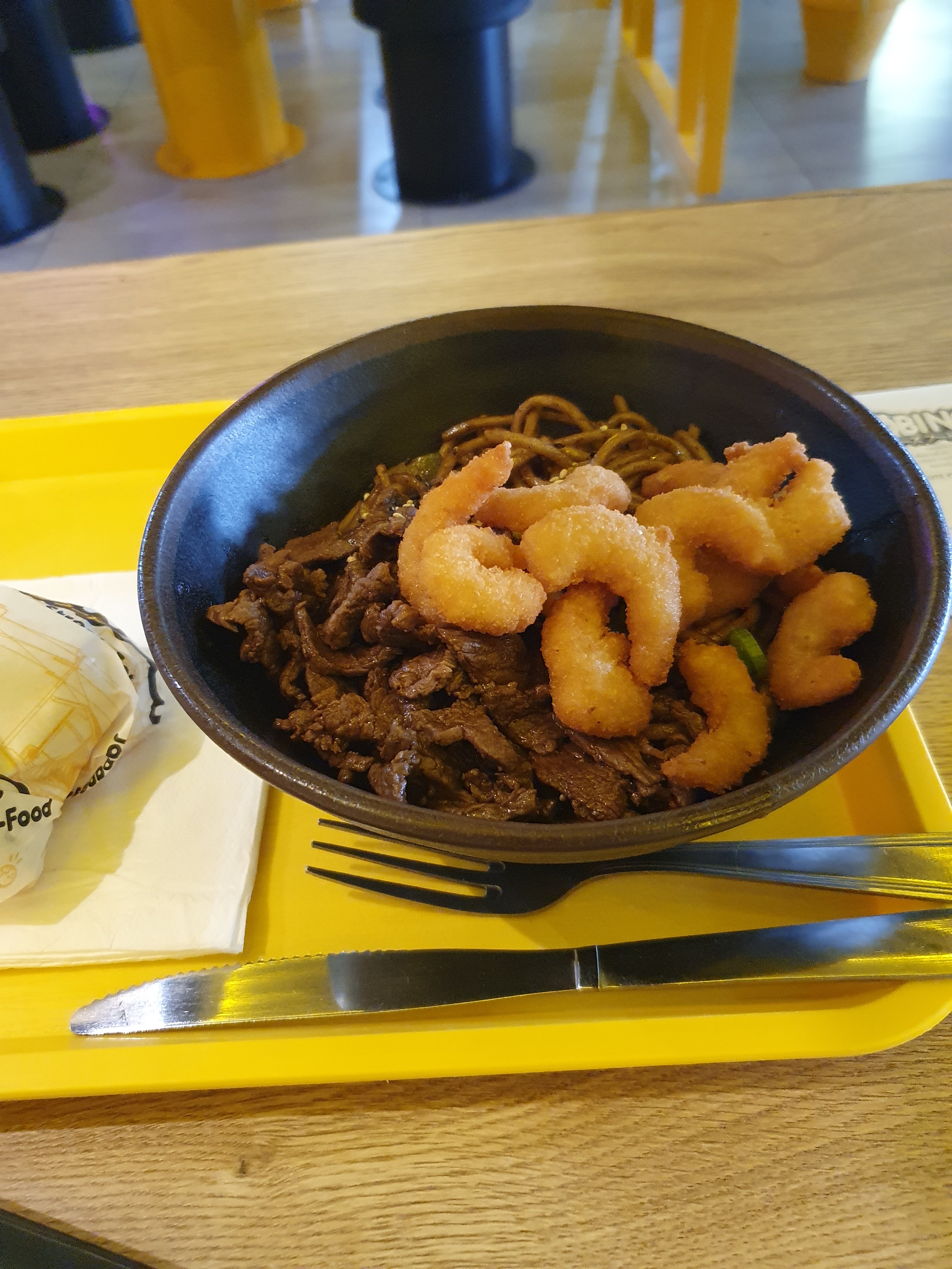 J'ai mangé un plat avec du boeuf du chou rouge et des pâtes ( je ne me rappelle pas du nom) c'était délicieux. Mon mari, des crevettes remplacaient le boeuf. Nous nous sommes régalés. C'était copieux et pour un coût abordable. J'y reviendrai