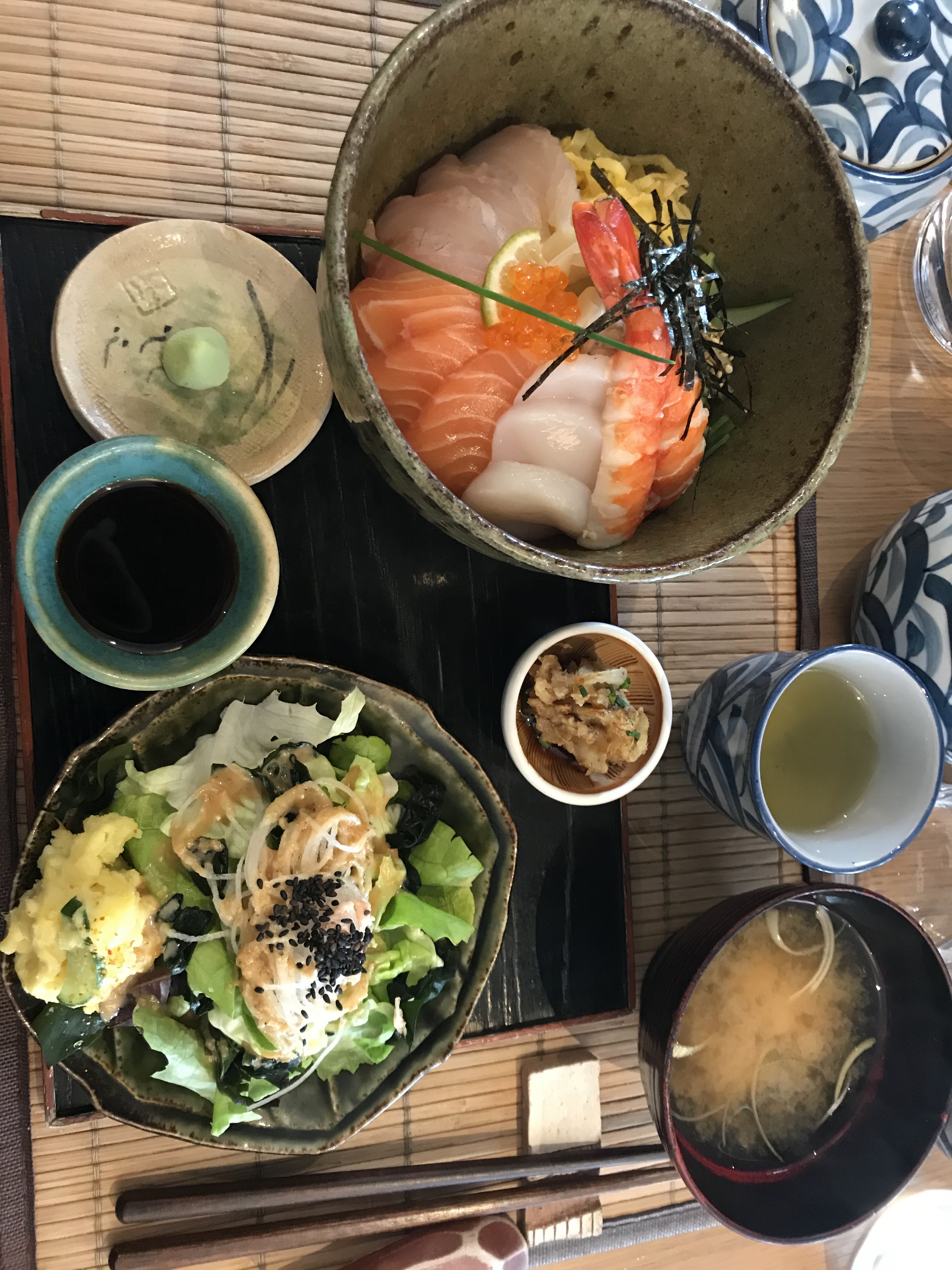 Excellent resto japonais. Pas de sushis mais vous trouverez du poisson cru dans les chirachis. Pas donné (30 euros pour un dej) mais si bon! Fraîcheur des produits irréprochable et quantités généreuses.
