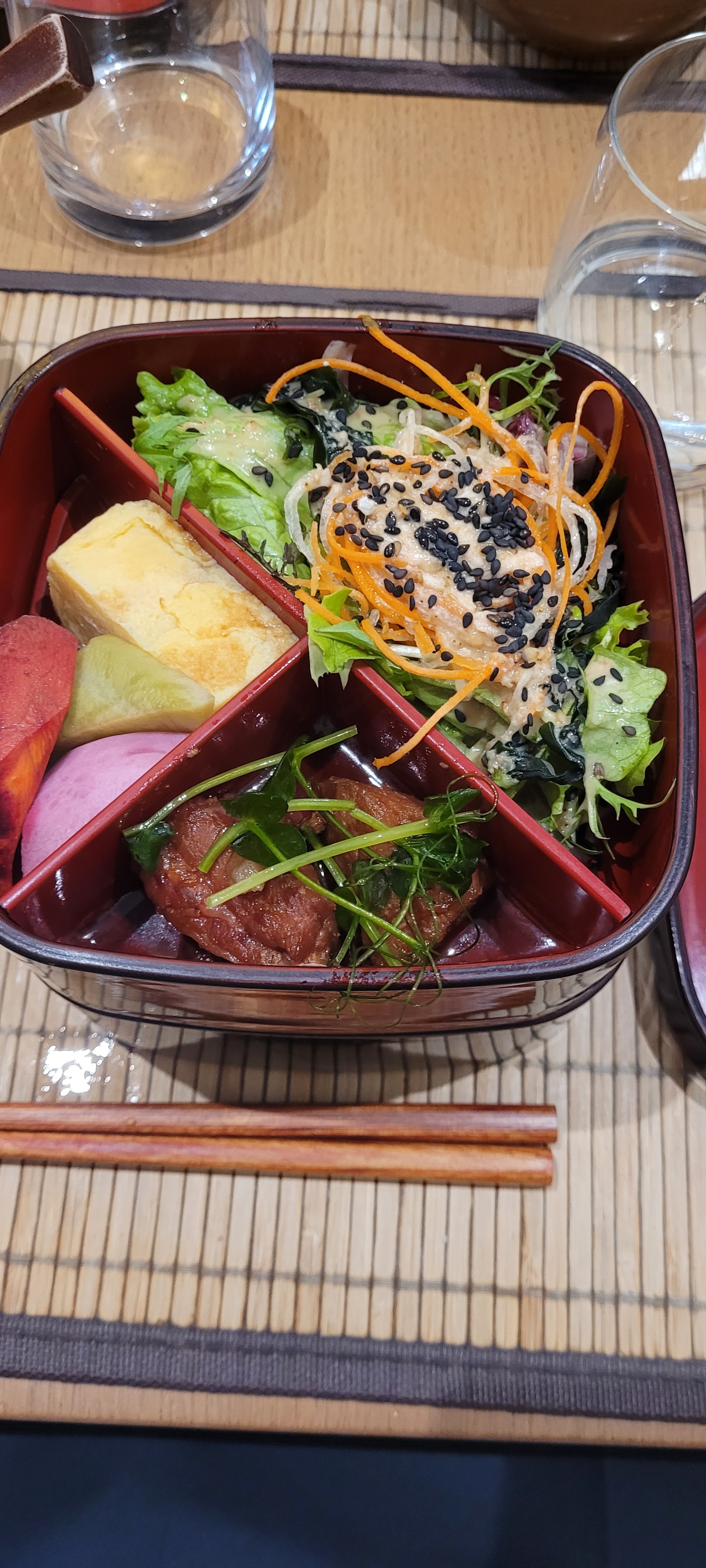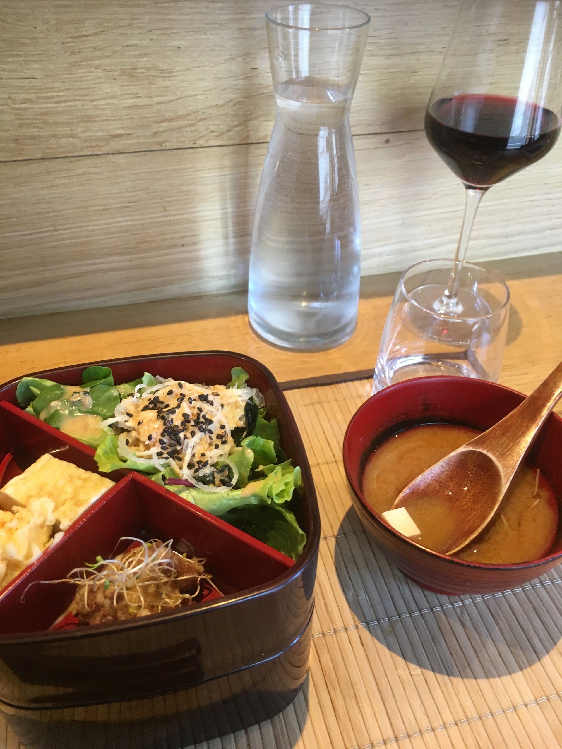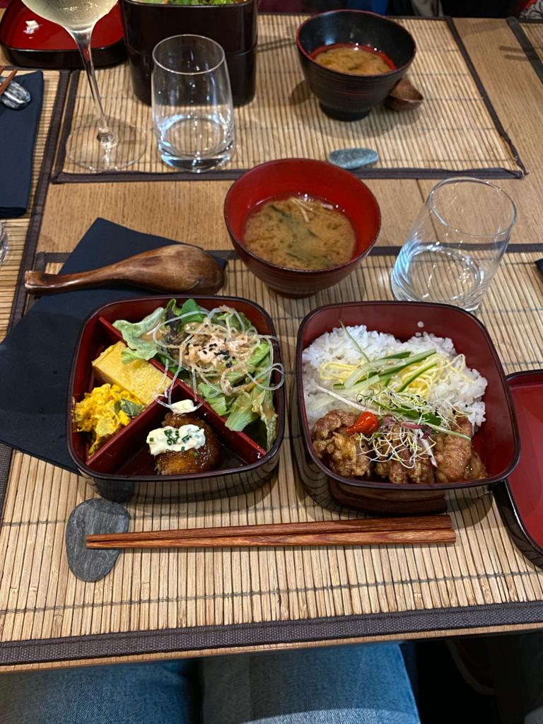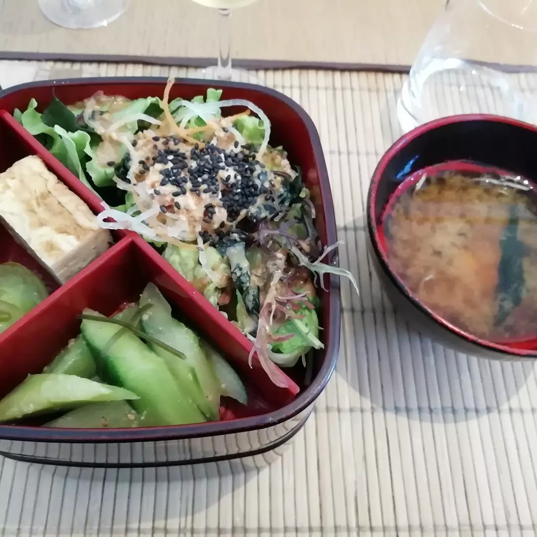 Si je pouvais, je mettrais 6 étoiles. Nous avons pris à emporter le bento végétarien et le chirashi, chacun accompagné d’une salade et d’une soupe miso. C’était certes cher, mais ça les vaut. C’était vraiment délicieux, fin et savoureux. Accueil au top pour parfaire le tout !