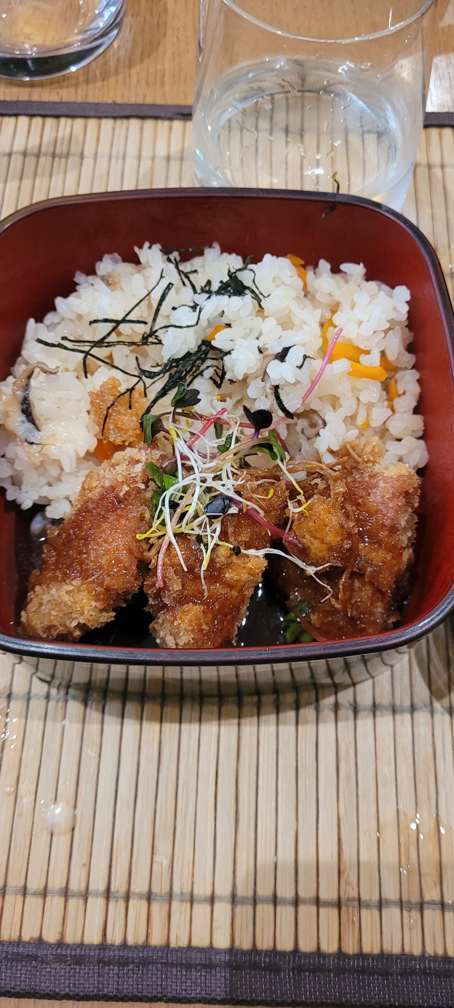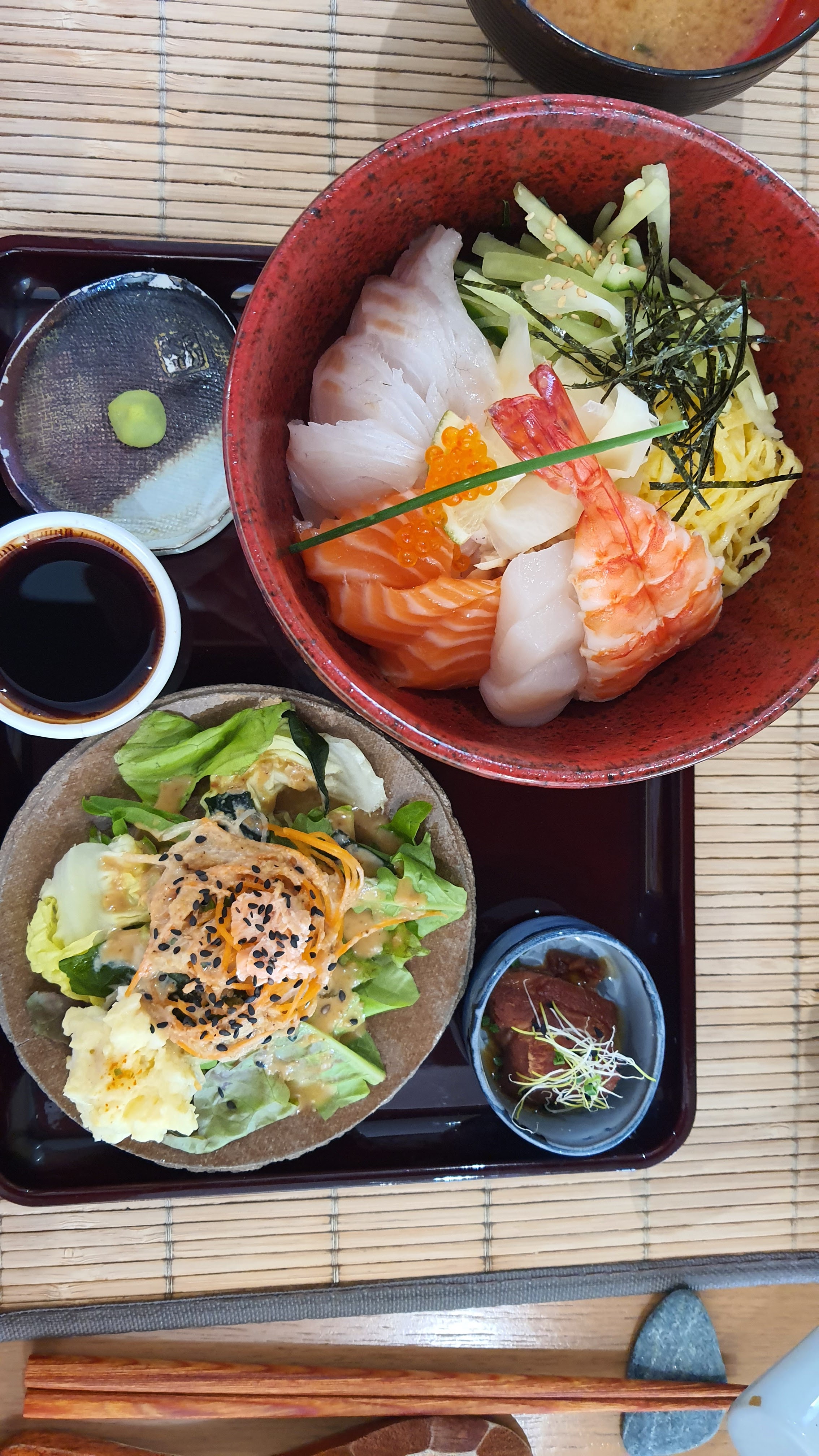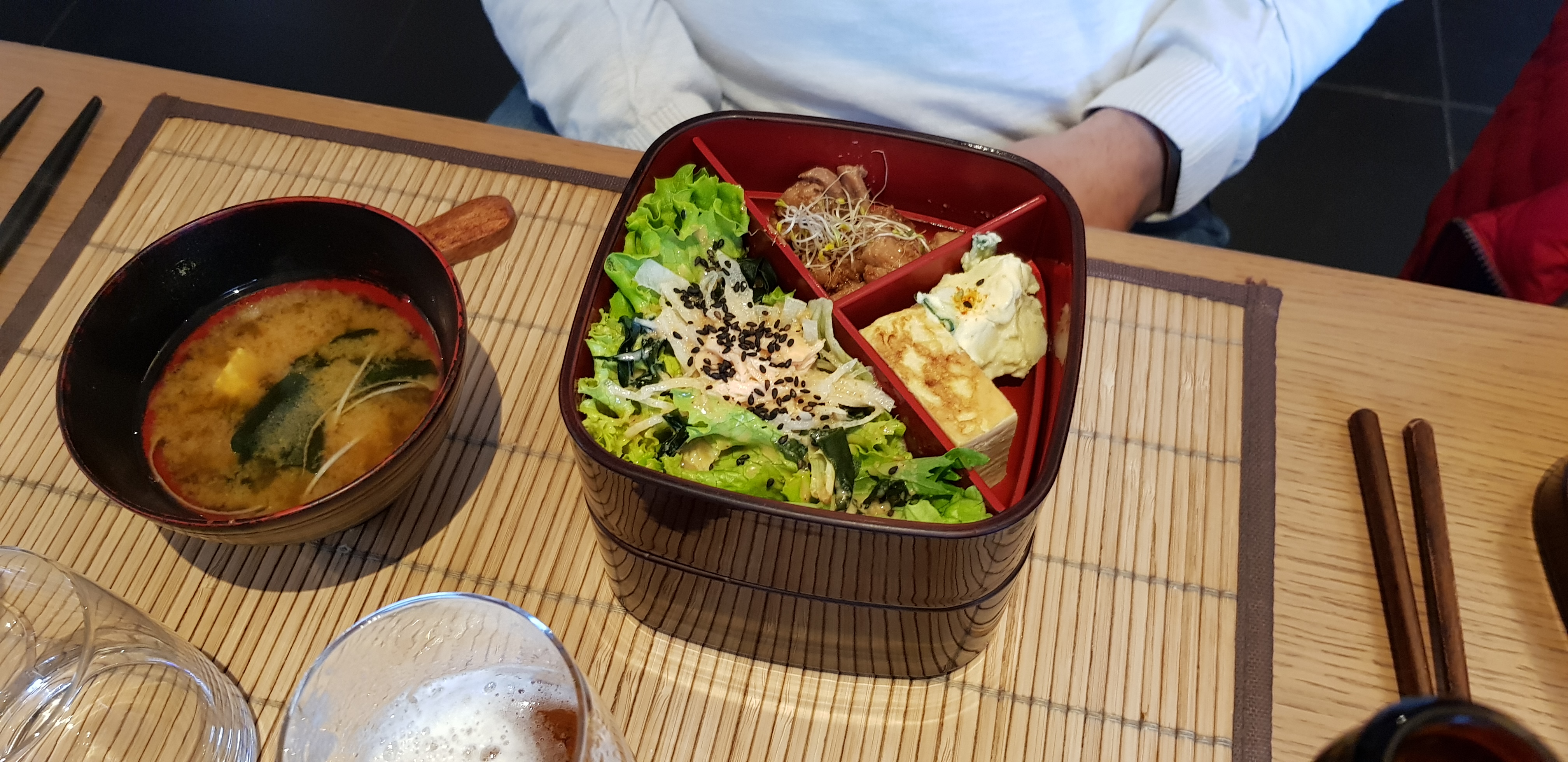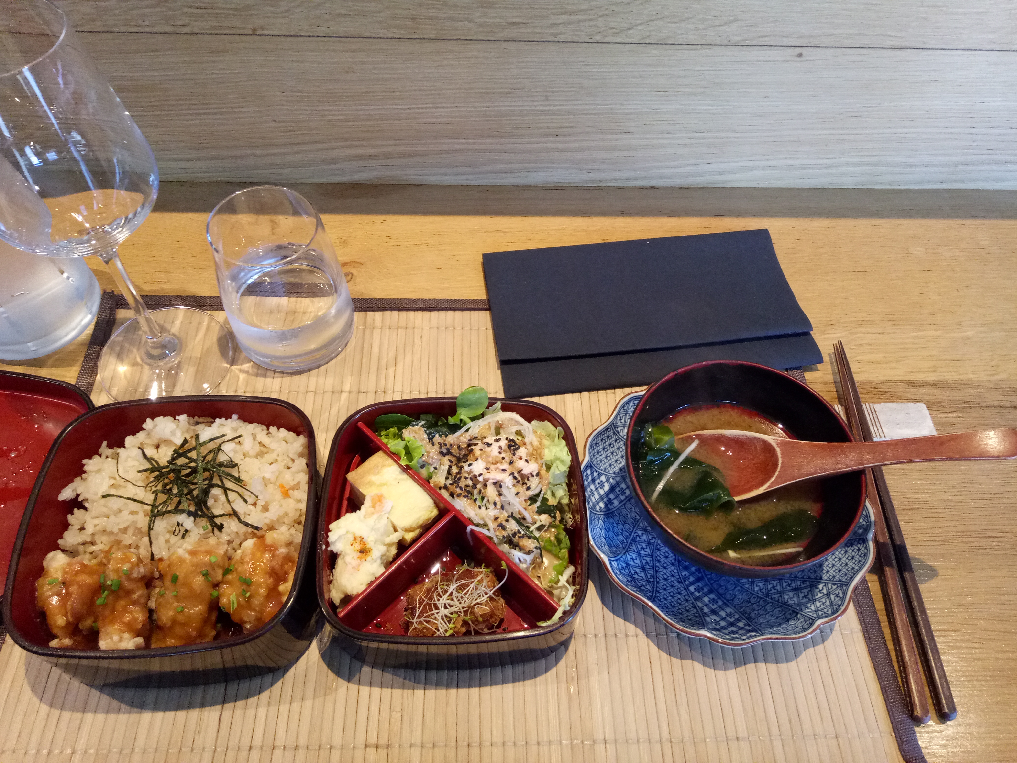 Si je pouvais, je mettrais 6 étoiles. Nous avons pris à emporter le bento végétarien et le chirashi, chacun accompagné d’une salade et d’une soupe miso. C’était certes cher, mais ça les vaut. C’était vraiment délicieux, fin et savoureux. Accueil au top pour parfaire le tout !