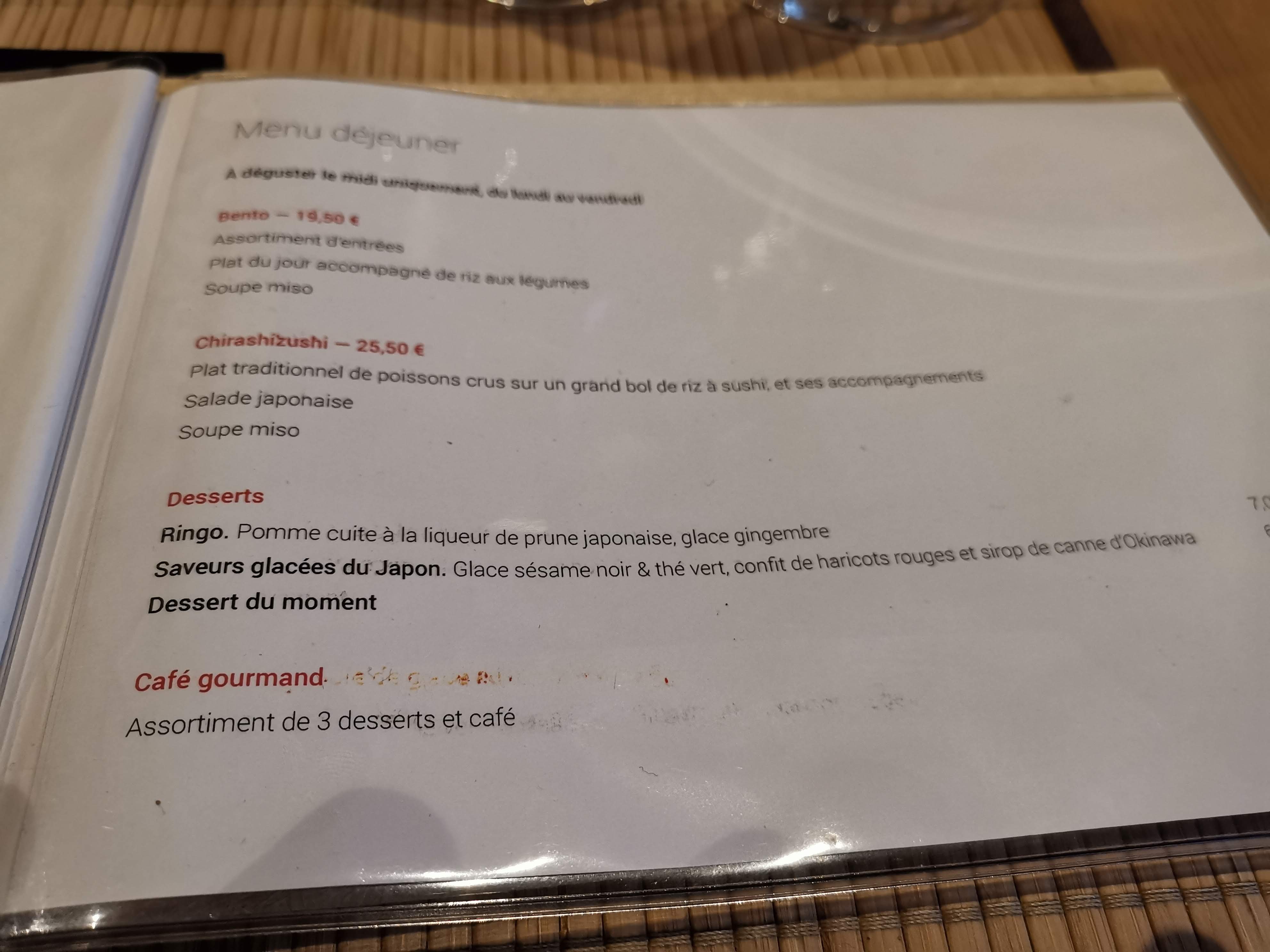 Accueil agréable et prévenant . Choix restreint , authentique cuisine japonaise de grande fraîcheur et de tres bonne qualité. Service efficace et rapide si besoin pour le déjeuner