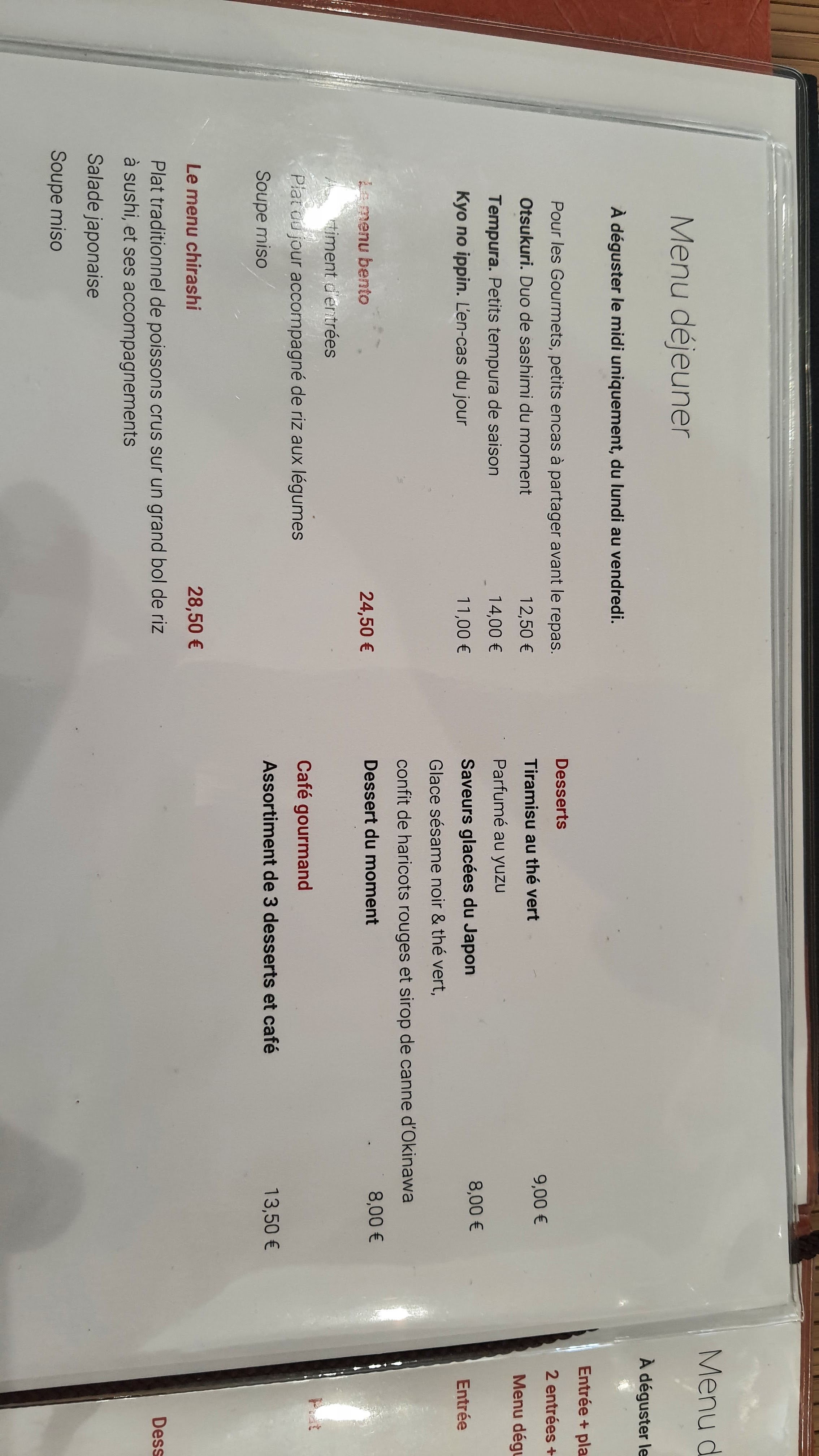 Posté le 01/07/2024 à 12:00"Un endroit simple et élégant. Des personnes d'une grande gentillesse, Un service de qualité, avec description des plats et conseils avisée pour accorder nourriture et boisson. La cuisine est une pure merveille pour les sens, Finesse et délicatesse sont au rendez-vous. La présentation est sobre et raffiné Et bien évidemment dans le style Japonais Réservation fortement recommandée Mais à essayer sans hésitation car c'est un pure bonheur pour les sens, et la sérénité du lieu est très agréable"