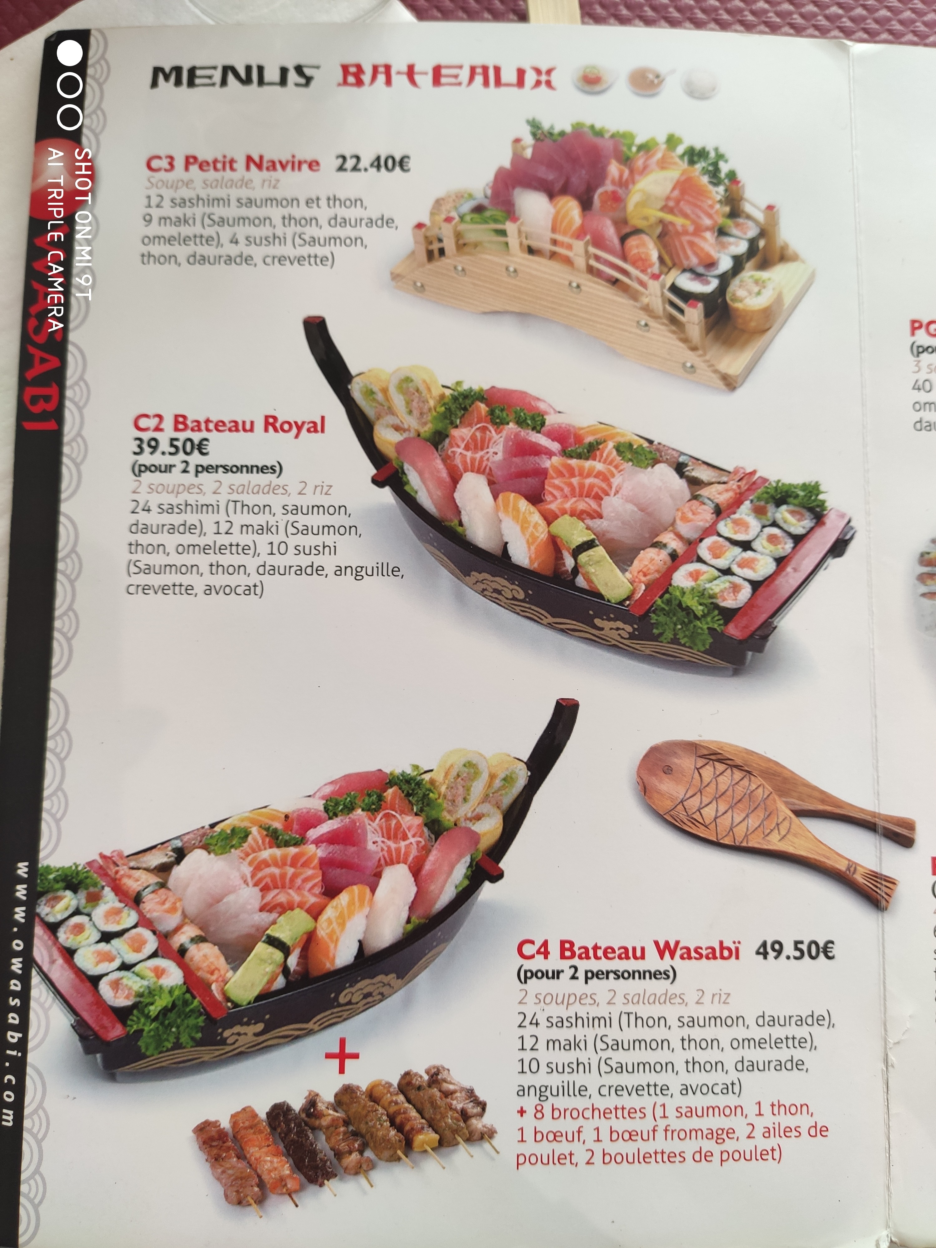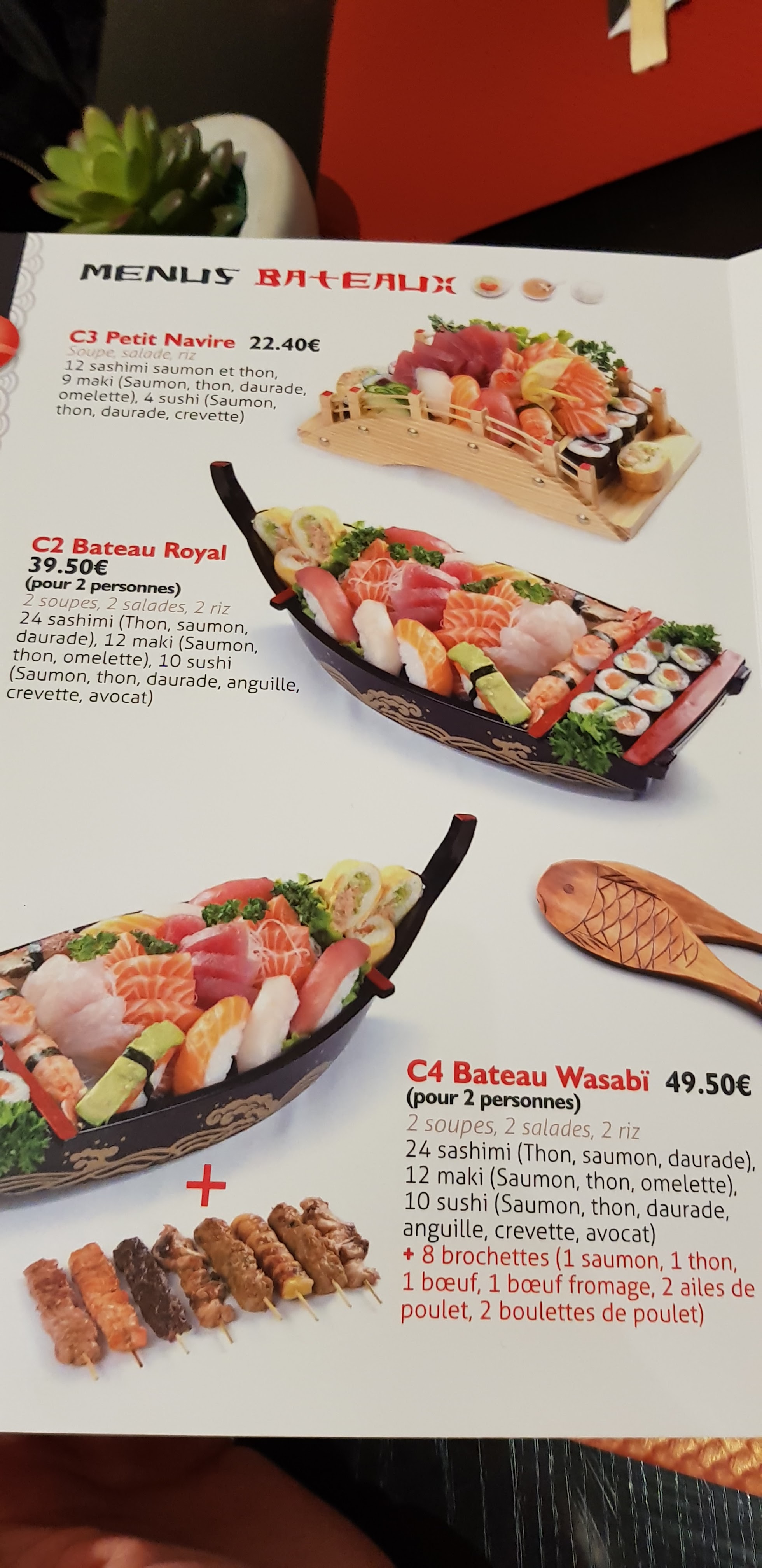 ON à passé notre première commande auprès de ce restaurant on à du retard de livraison car le livreur à eu un soucis. Mais pas déçu très copieux on à pris le bateau wasabi avec les brochettes et il y avait 2 soupe, 2 riz, 2 salade de choux plus des shashimi, des maki et des sushis pour 2 personnes c'était tellement copieux qu'on à pu y manger avec notre fille. Produits très bon et frais. Je recommande ce restaurant.