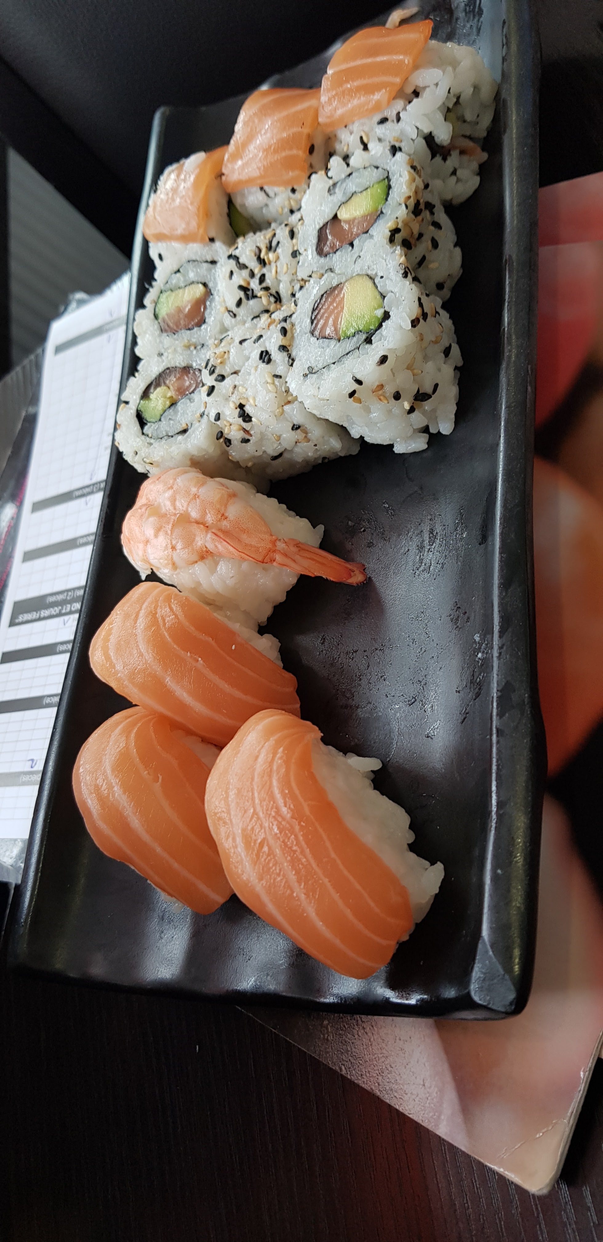 On est arrivé à 12h30 (resto à 2),la prise de commande à été faite à 12h34 ,une erreur à été faite de la part de la serveuse elle est partis avec la feuille de commande du coup on à pas pu vérifier ce que l'on avait prit (elle est censé prendre note et nous laisser la feuille pour les autres service car le service est à table.On c'est fait servir qu'un bol de nouille sur tout notre commande à 12h43, très mal servis par la serveuse presque jeté sur la table(voir photo). Riz au crevette servis à 12h47 avec 5 petits morceaux de crevettes mi-cuite sinon le riz et ces autres accompagnemments sont bon, sushi makis et futomaki servis à 12h50 avec une belle présentation. Saumon dans les makis et sushis assez fade sinon les makis aux avocats au concombre sont bons même si la plupart sont mal fermé. Rien à dire sur les futomaki il y a les même ingrédient que j'ai mentionné précédemment. Fin de la 1ere commande à 13h10, prise de la 2ème commande à 13h14. Arrivé de la 2ème commande à 13h19.pas grand chose à dire sur les Californias à part qu'ils sont assez bon, yakitori boeuf fromage délicieux rien à dire. Un peu d'eau en dessous des Toillettes propre mais papier mal desservie. On a eu pour un total de 27€80 je trouve que c'est chère pour ce que c'est avec un choix limité et des dessert de 2cm cube à 3€ comparé au dragon d'or à sept sort ou il y a + de choix et ou les saveurs sont + fréquente, les desserts la bas sont gratuit. Seul les clients sont polis jusqu'au moment de payer ou il vous dise au revoir et merci