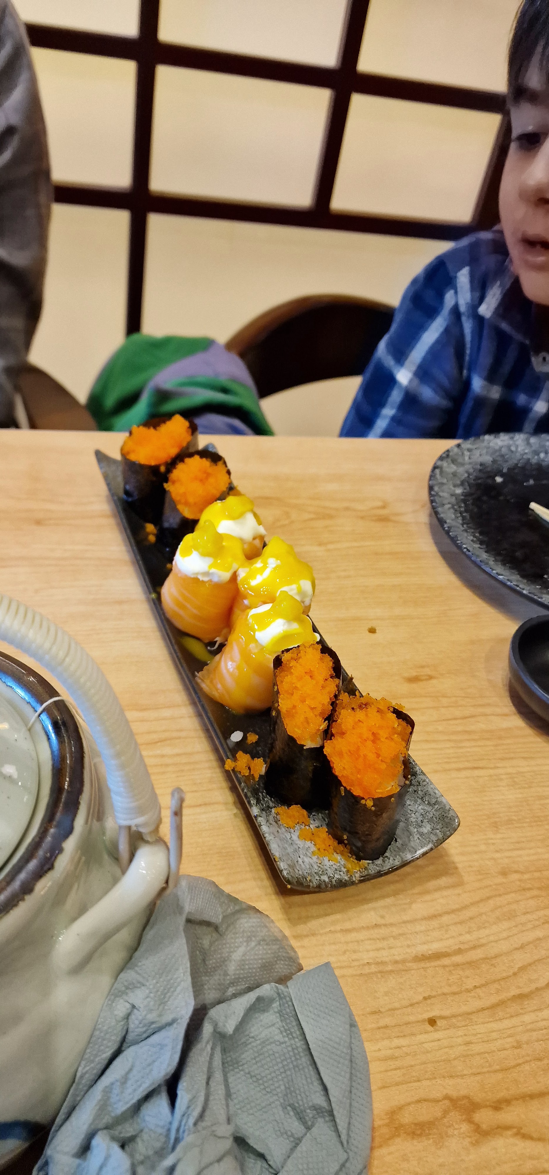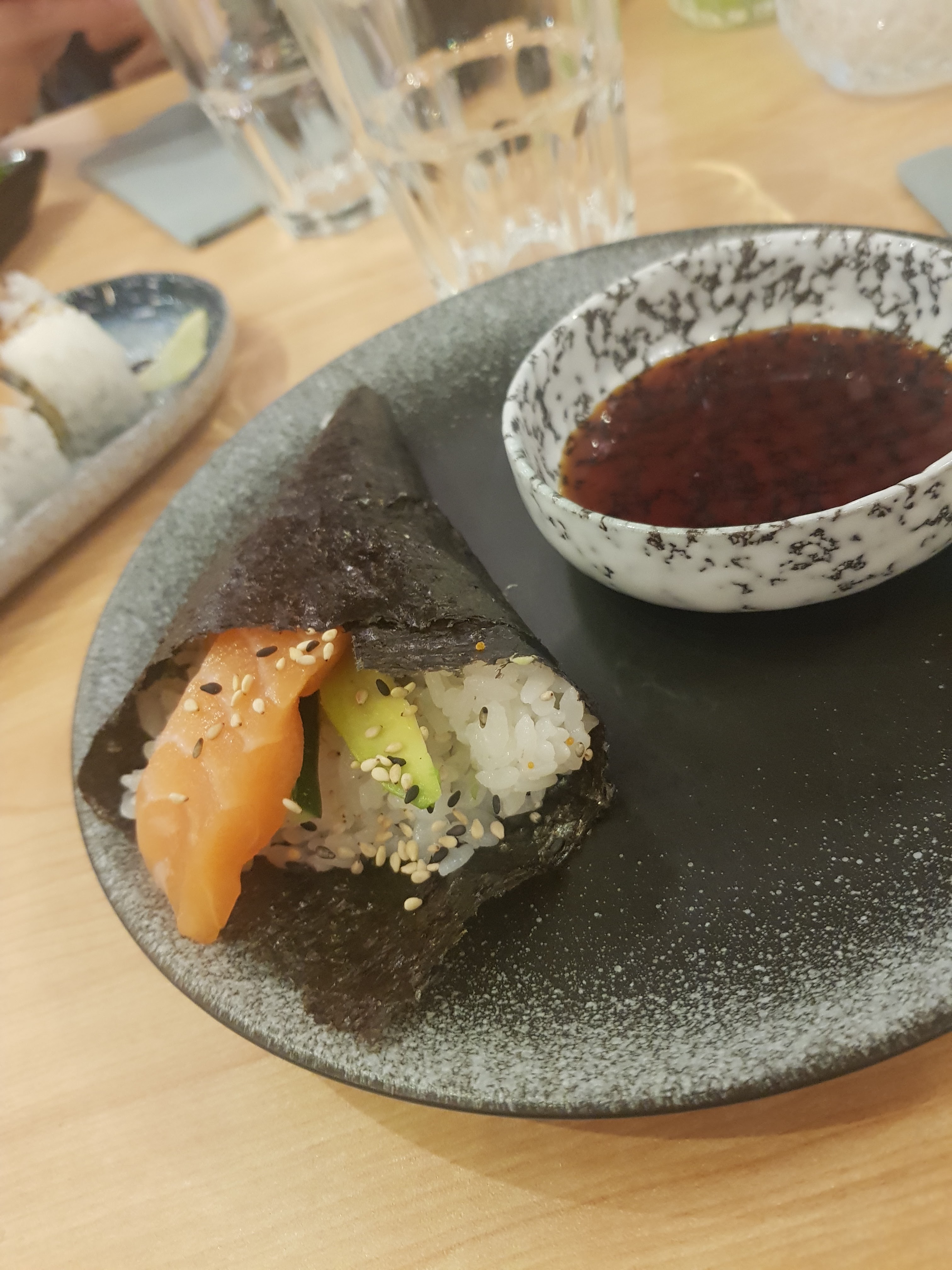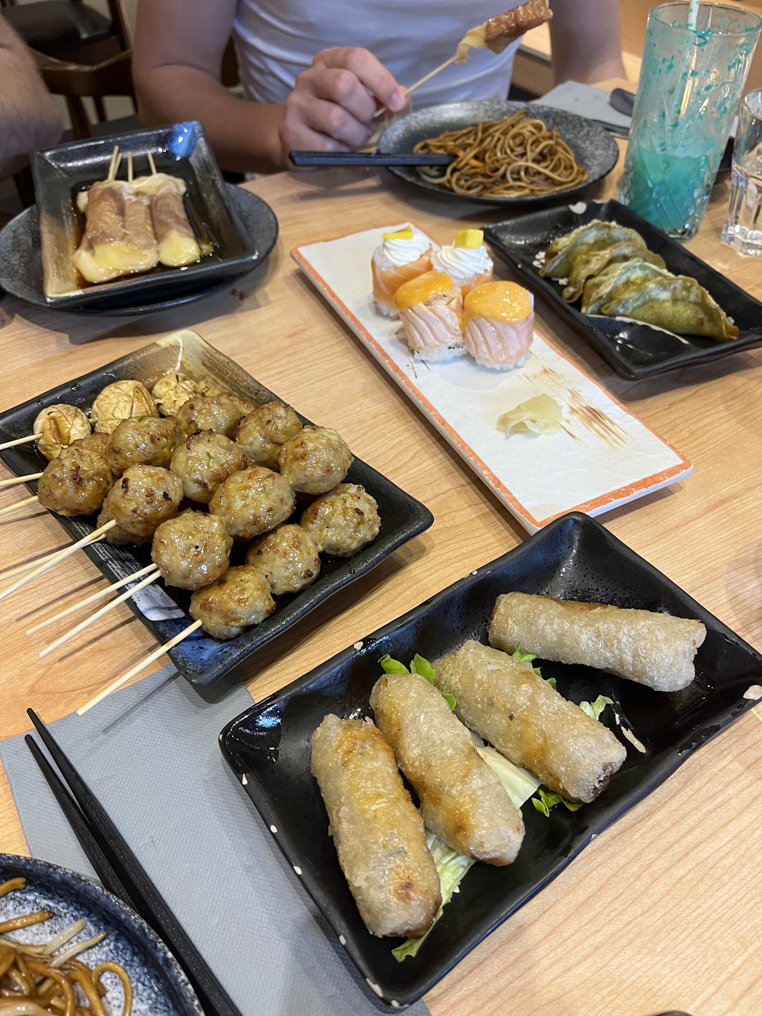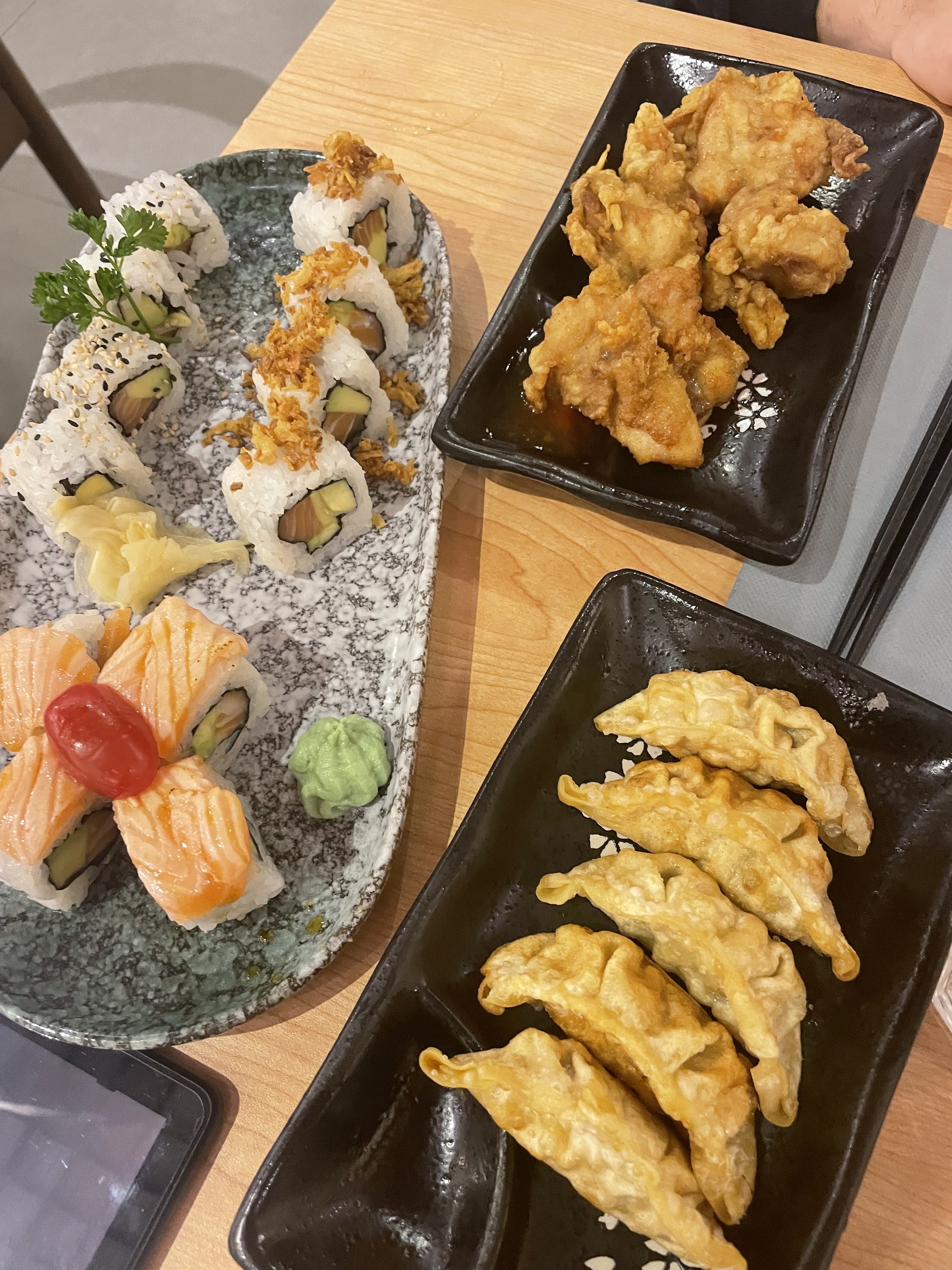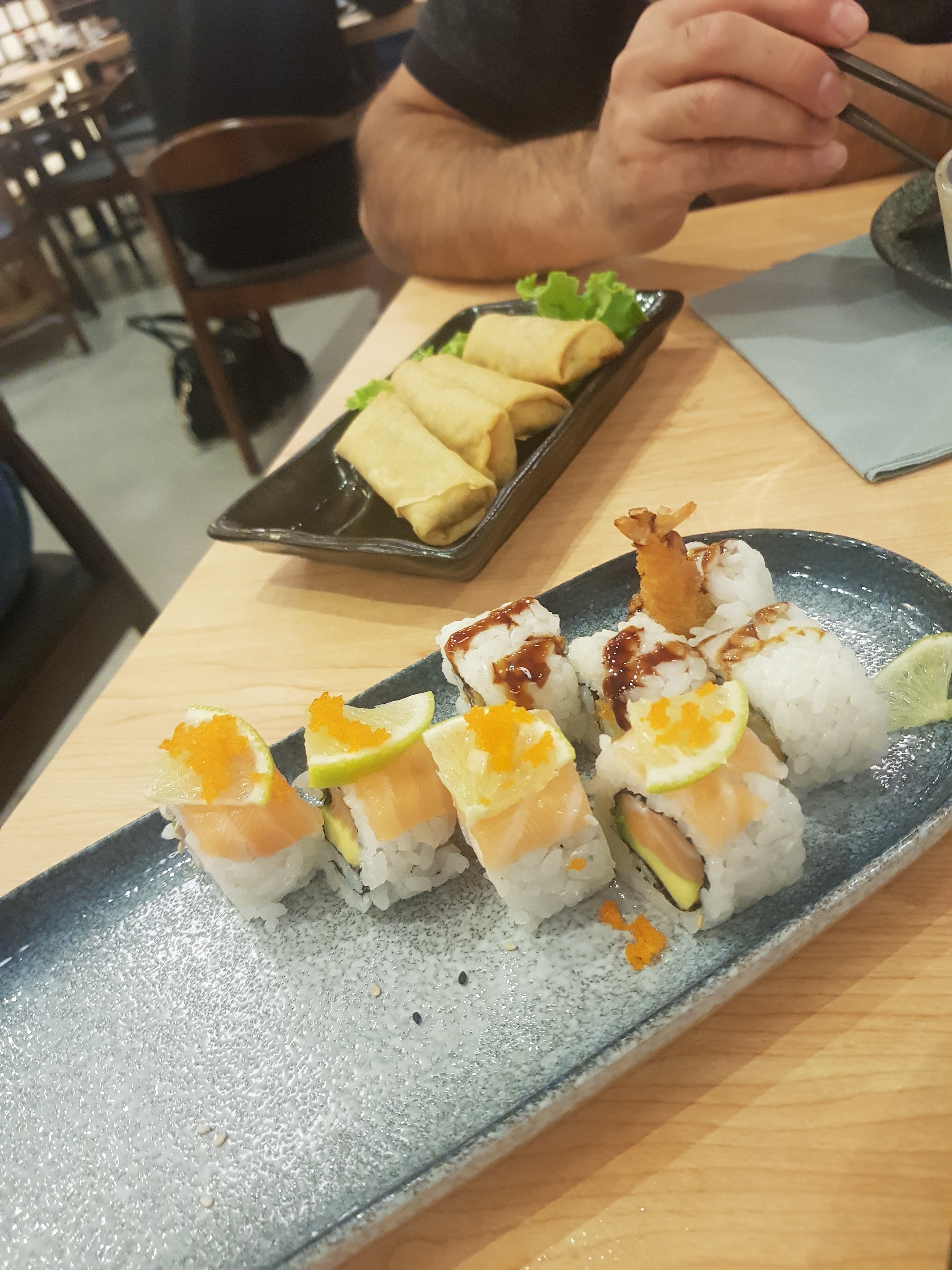 Une première pour ma fille et moi dans ce restaurant, le cadre est très joli, l'accueil un peu froid . Qualité prix correct. Un peu déçu par les mochis glacé, le prix est excessif pour des tout petits mochis. ( Et qui n'est pas inclus dans le menu) Déçu aussi par la présentation des plat ( cf photos) . On a attendu un peu pour chaque plat. Je ne recommande pas les brochettes teriyaki au bœuf. Pas top Je recommande ce restaurant, tout de même car nous avons passé un très bon moment et nous nous sommes régalés sur les différents sushis. Les nems sont bien préparés. Et les nouilles au crevettes, très bon .