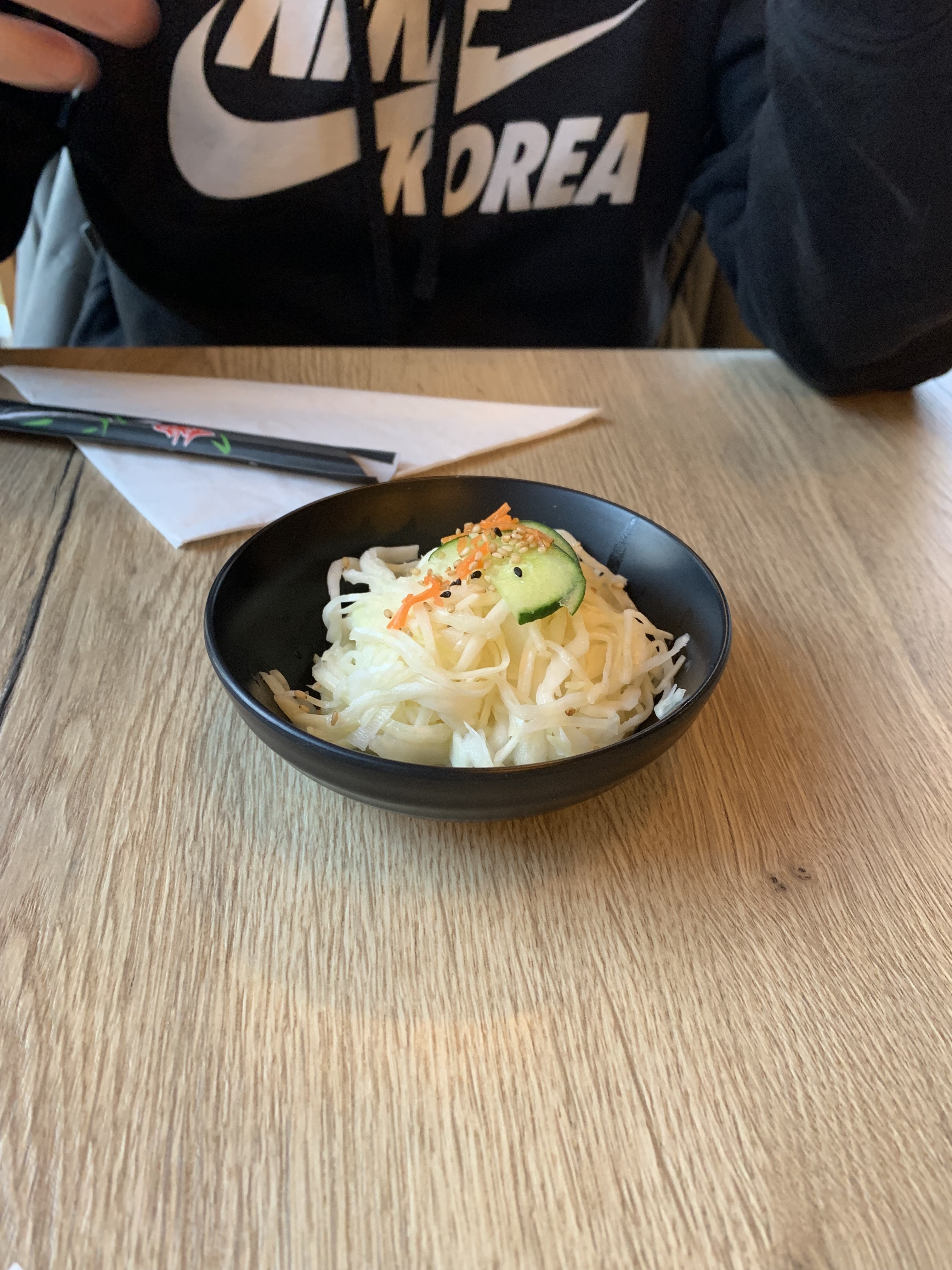 Nous sommes arrivé à 19h15 au restaurant soit 15 min après l'ouverture pour eviter le monde... 40 min d'attente sans un mot avant de venir prendre notre commande.... le serveur, pas aimable, nous dit qu'il y a trop de commande à emporter et qu'il faut attendre avant de passer commande. Une fois la commande passée, 30 min encore d'attente pour nos plats... nous avons mangé rapidement afin de partir au plus vite. D'ailleurs d'autres tables arrivées apres nous sont partis sans meme commander. Serveurs pas très aimables et patronne qui ne daigne meme pas croiser notre regard. Sinon les makis et guyozas commandés etaient bons mais rien d'extraordianire. Une premiere dans ce restaurant qui sera egalement la dernière.