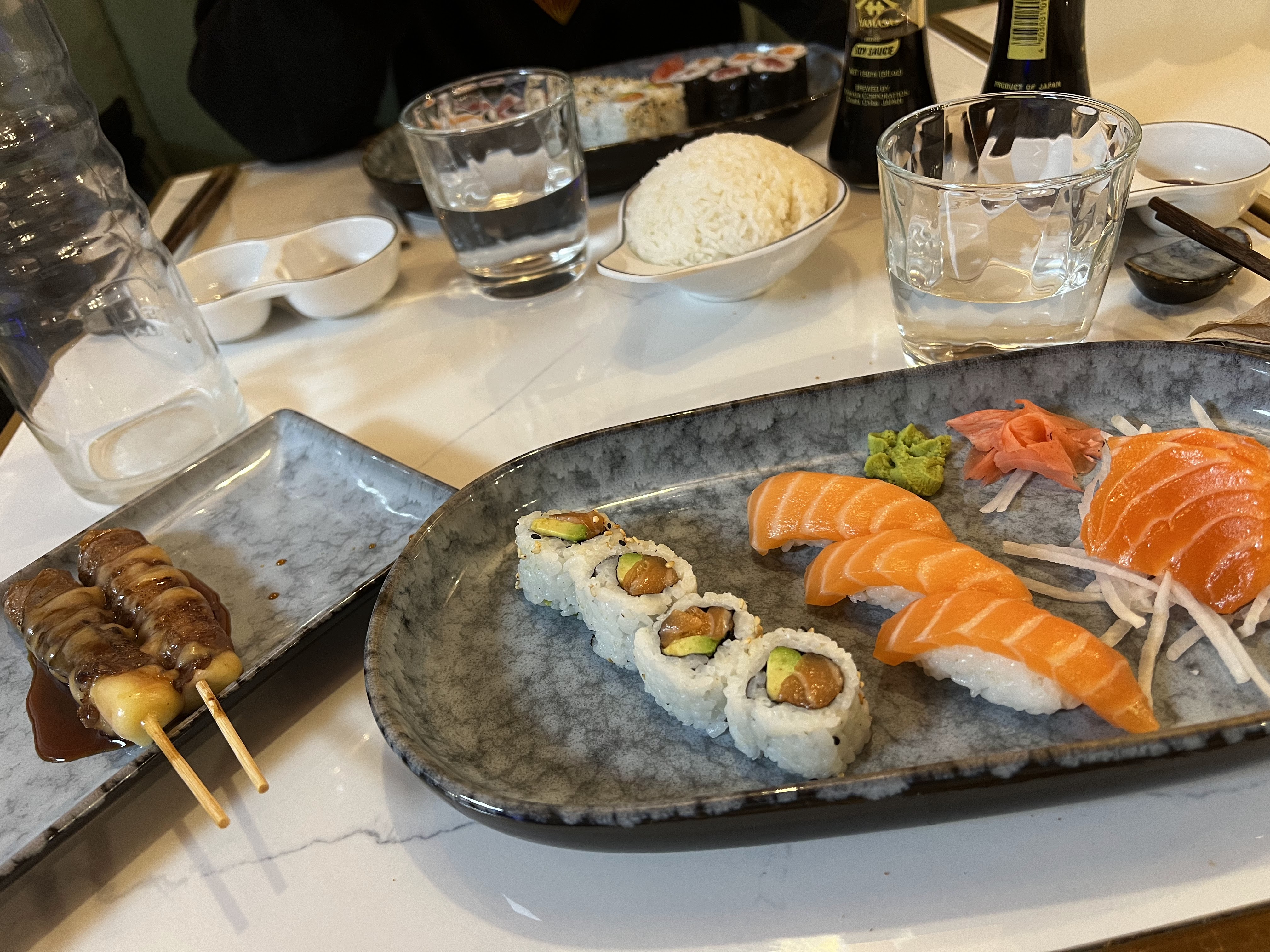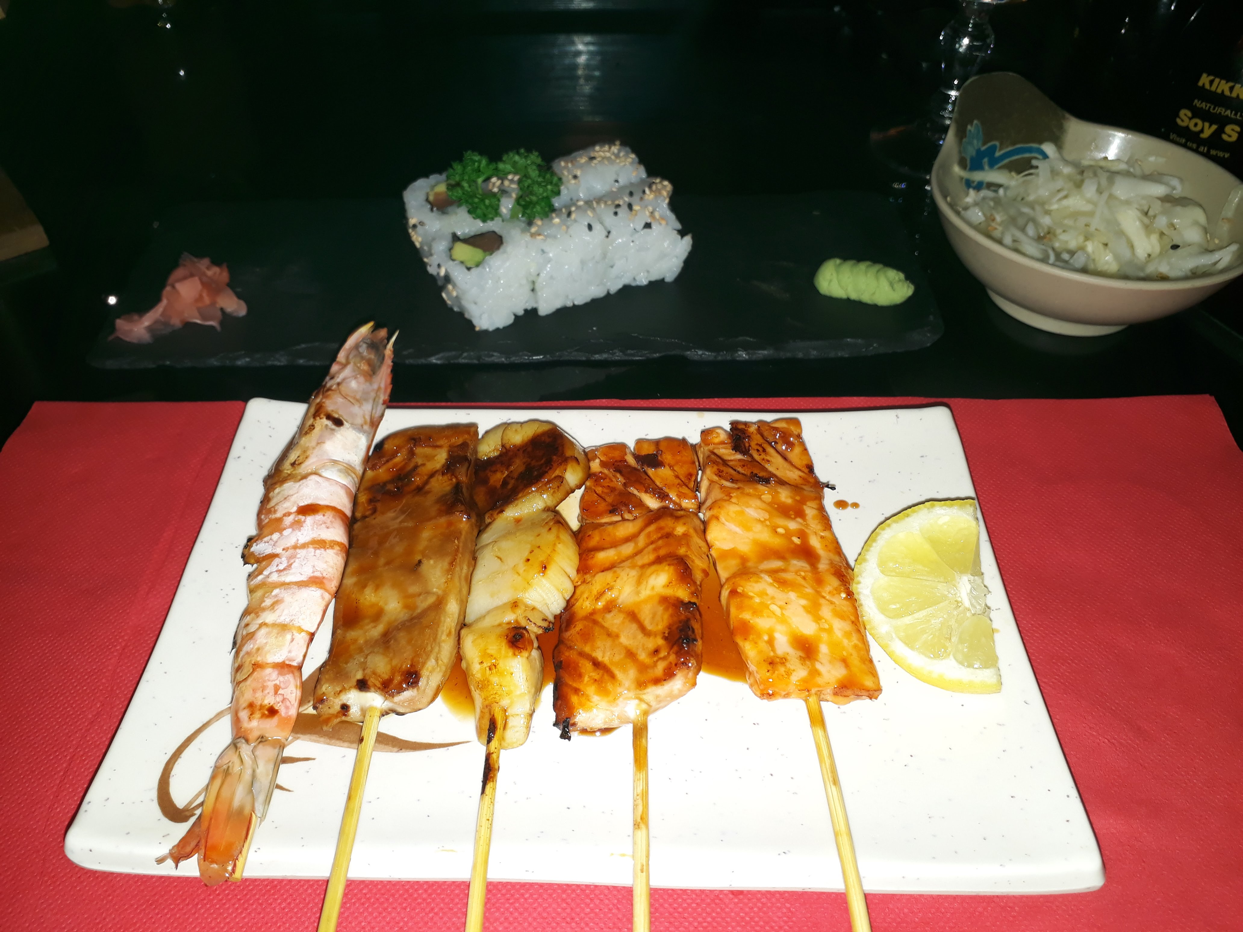 Je ne sais pas quoi penser, le riz des sushi était sec, comme si ils avaient préparé bien avant d’être servi. Les brochettes étaient moyens, on dirait qu’ils ont été passé au micro onde, la texture du poulet on dirait du plastique.