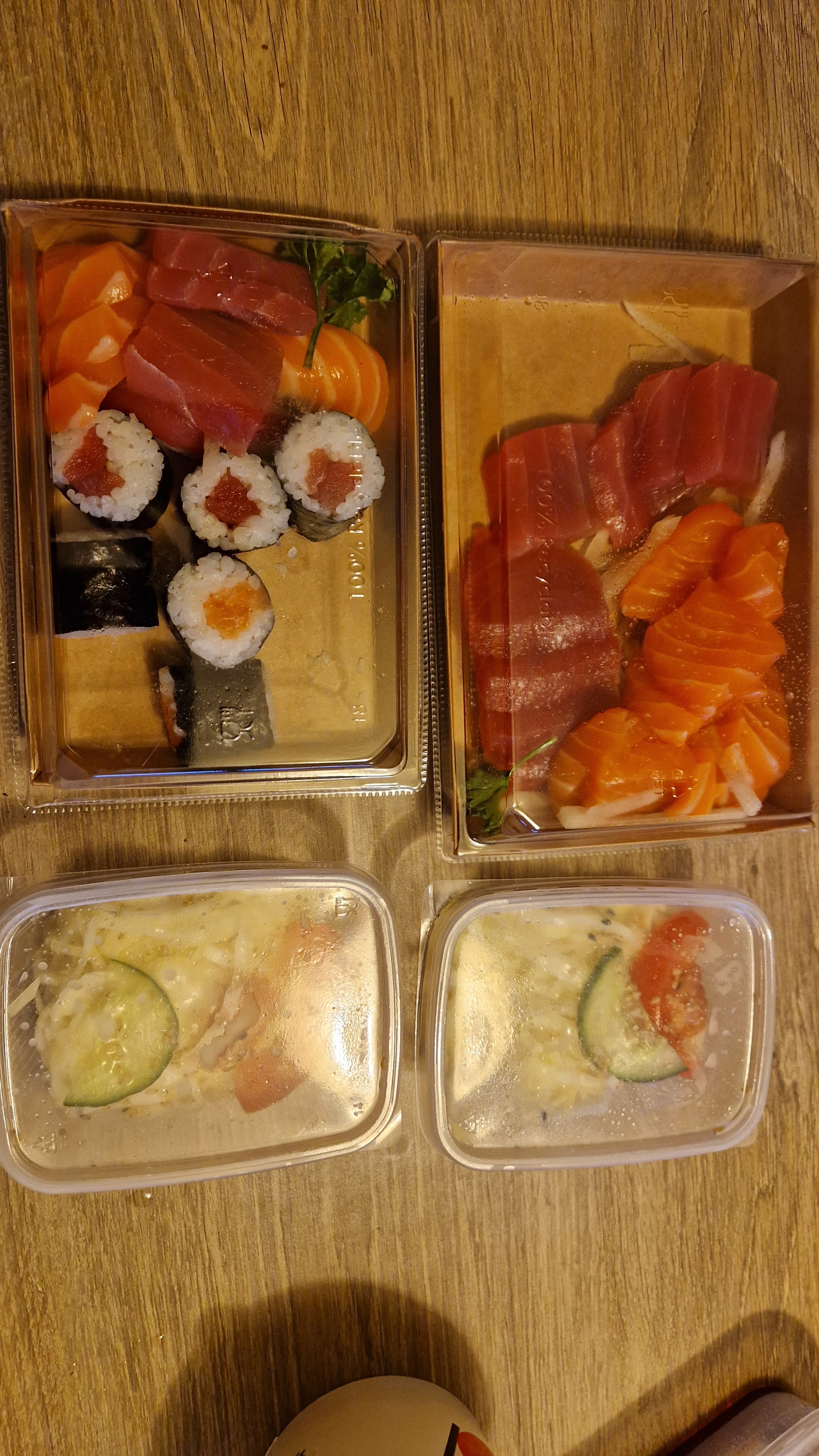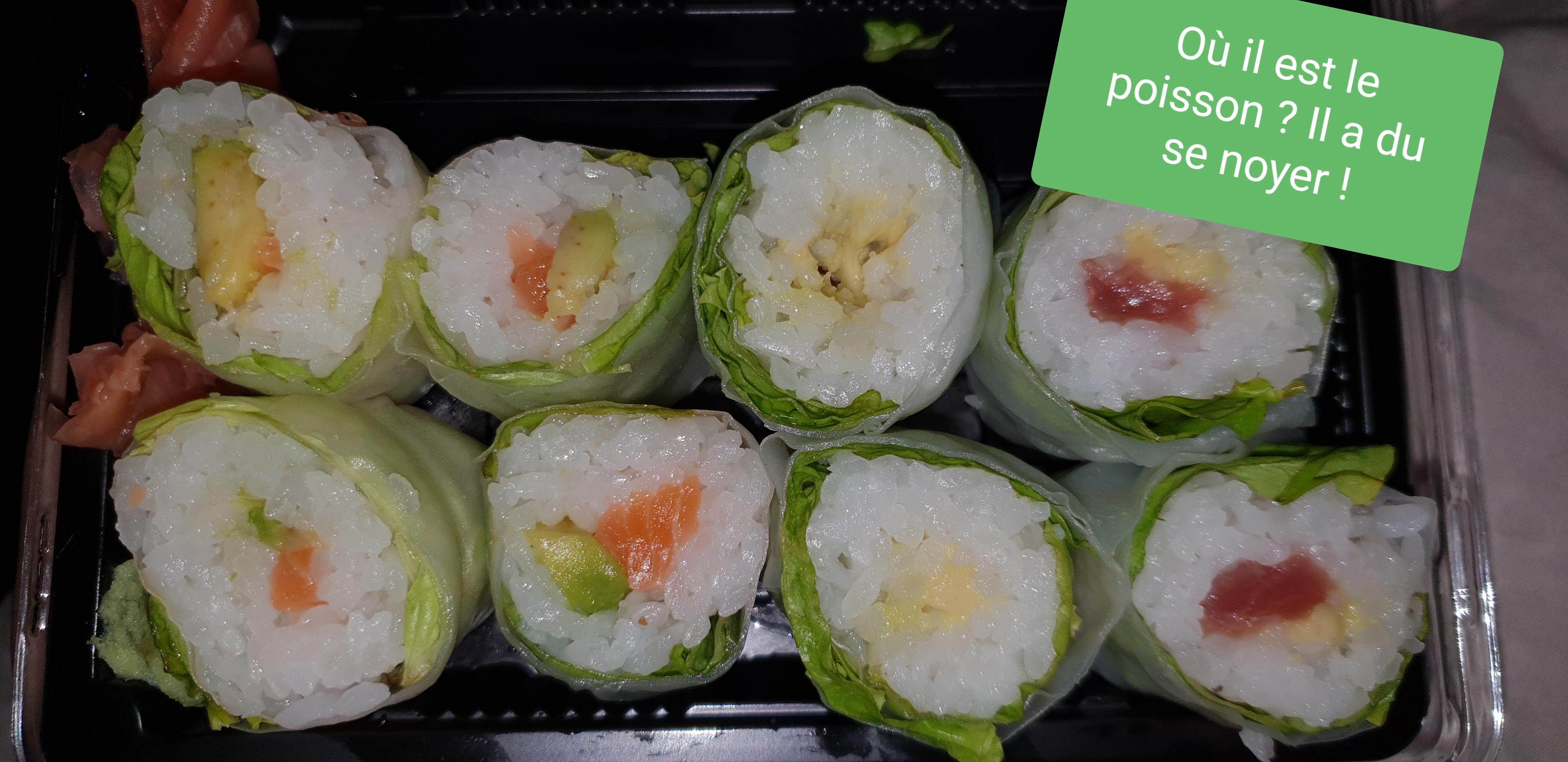 En livraison : la branche de verdure ne cache pas tout ! Sur une boîte de 6 maki, les 4 extérieur sont beau mais les deux du milieu sont écrasés , presque sans poisson... de plus les sushis sont petit pour le prix ! Si non, le goût est presque là.