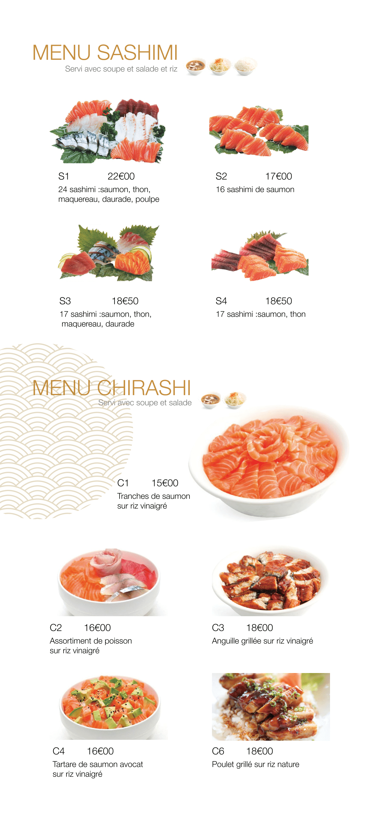 Commande par livraison Menu sashimi saumon Soupe de l'eau aromatisée sans rien pas d'algues pas de tofu rien... Salade de chou tellement de vinaigre immangeable Riz dur commende la pierre Portions de poissons petite équivaut à la moitié de la portion. Fraîcheur douteuse. A fuir .....