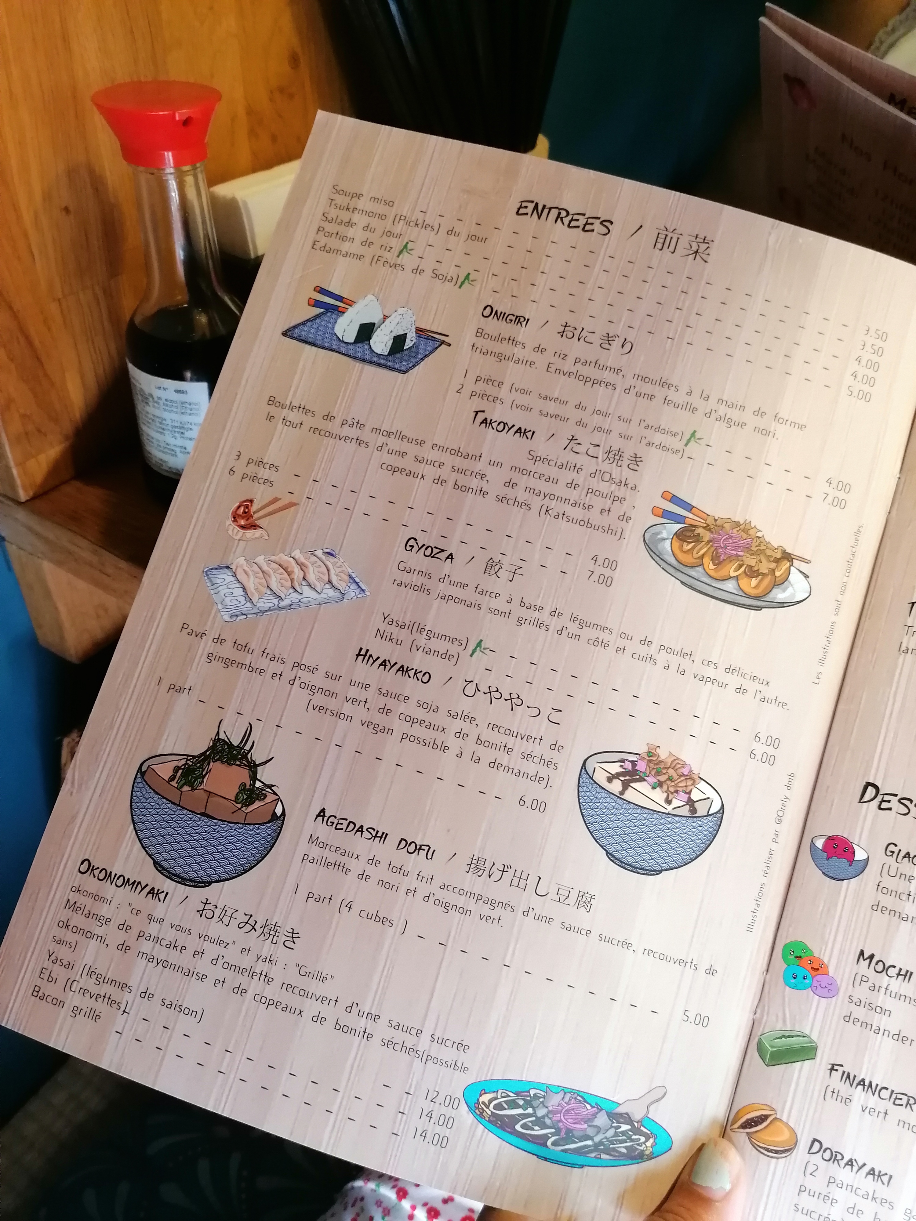 Posté le 30/06/2018 à 09:55"Restaurant japonais avec des spécialités qui sortent de l'ordinaire dont le fameux okonomiaki (sorte de galette avec du bacon, des oignons, des oeufs, du choux, de la ciboule, du gimgembre, .... et la sauce) à 12€. Pour les desserts, glaces à 3€ et moshis à 3,5€. Accueil agréable et belle décoration. Pensez à réserver !"