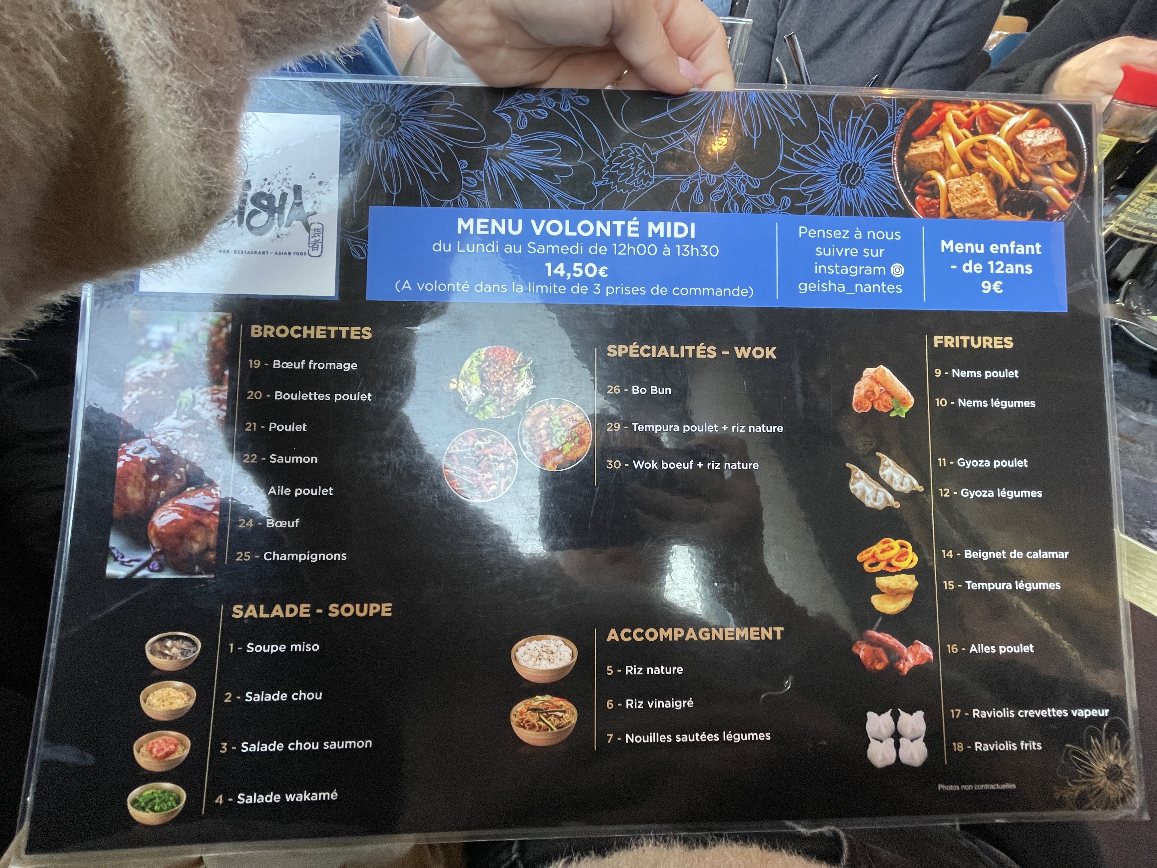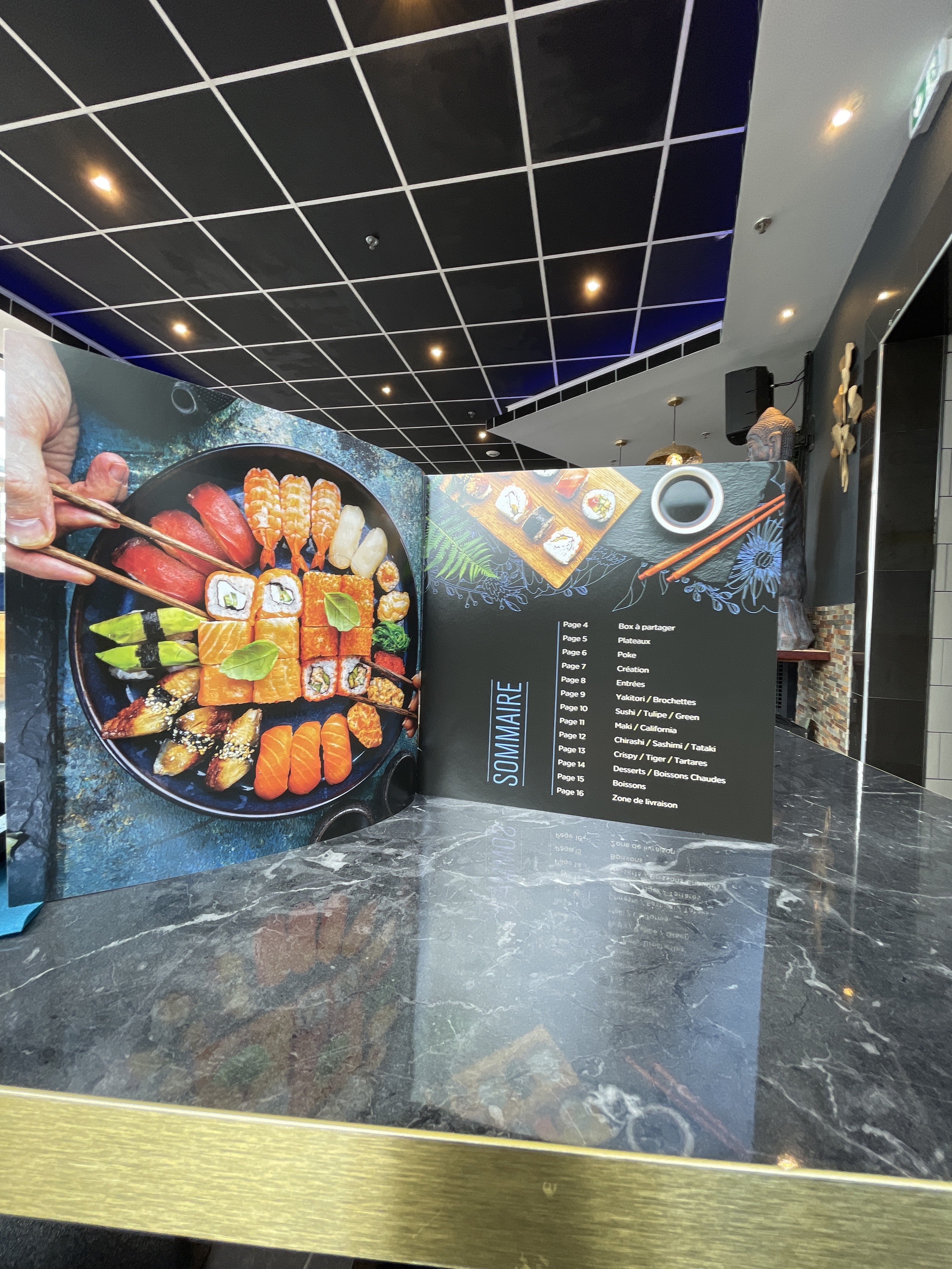 C’est idéal pour le déjeuner avec une formule à volonté Vous pouvez commander des sushis, maki, des brochettes des plats des soupes… Les quantités sont plus petites mais ça permet de goûter a pas mal de choses. C’est plutôt correct en qualité au vu du prix de la formule (15€90 le midi et 21€90 le soir)