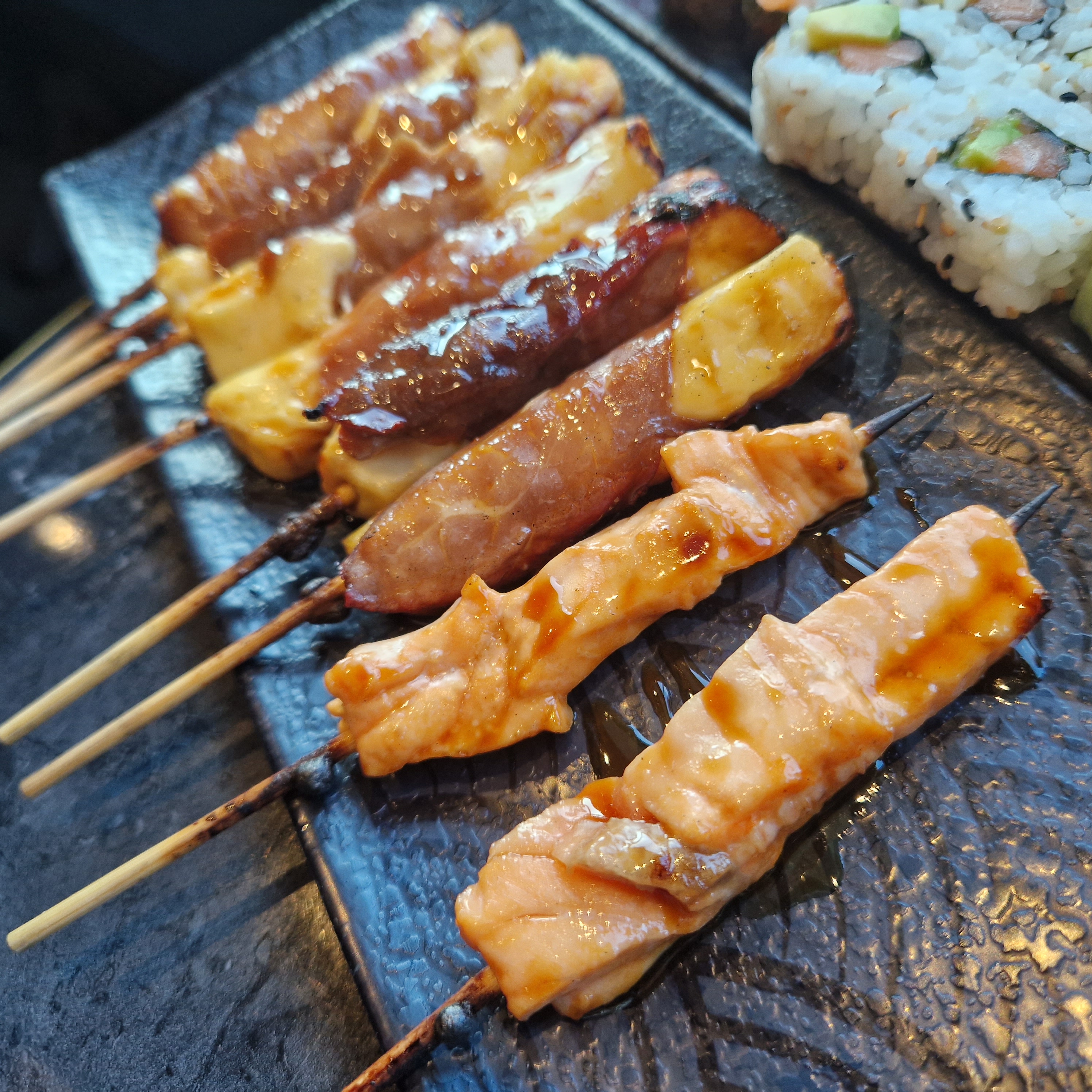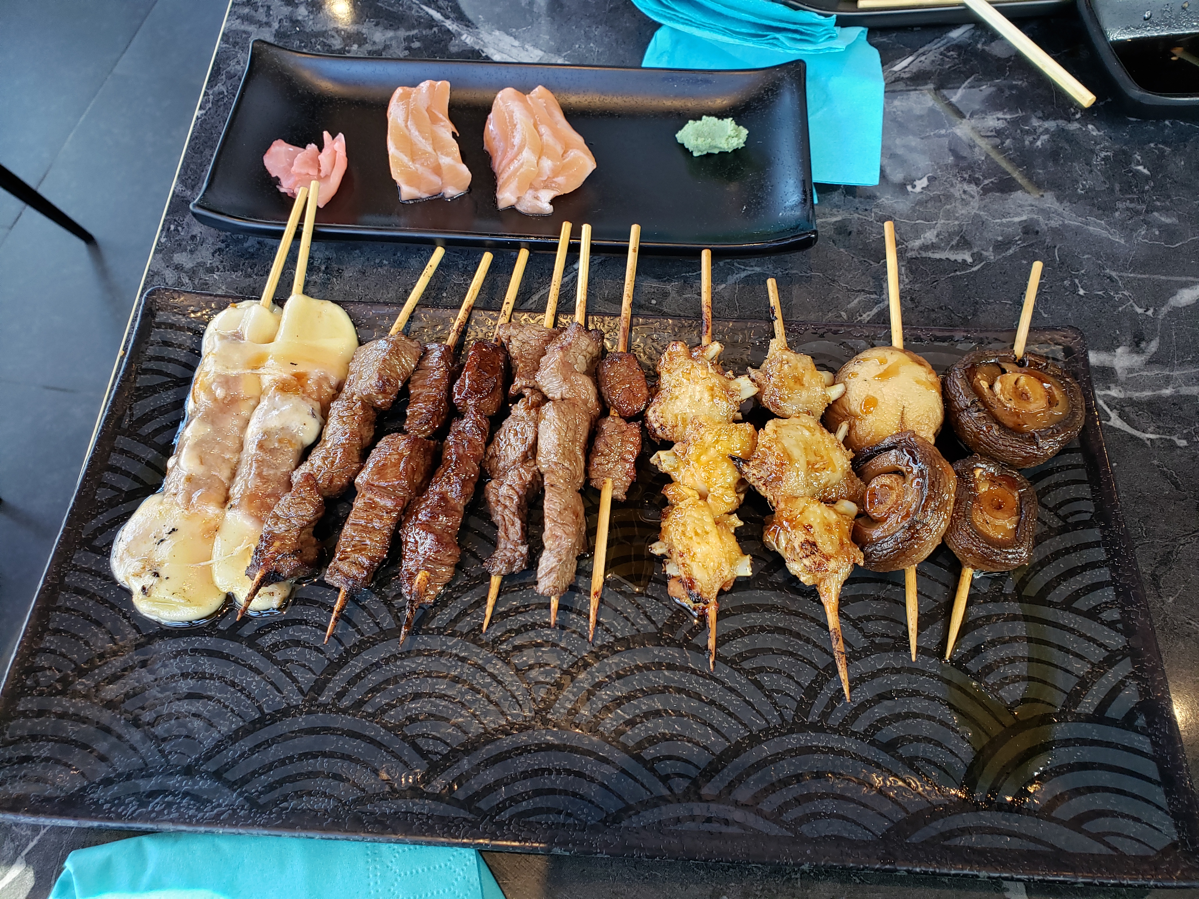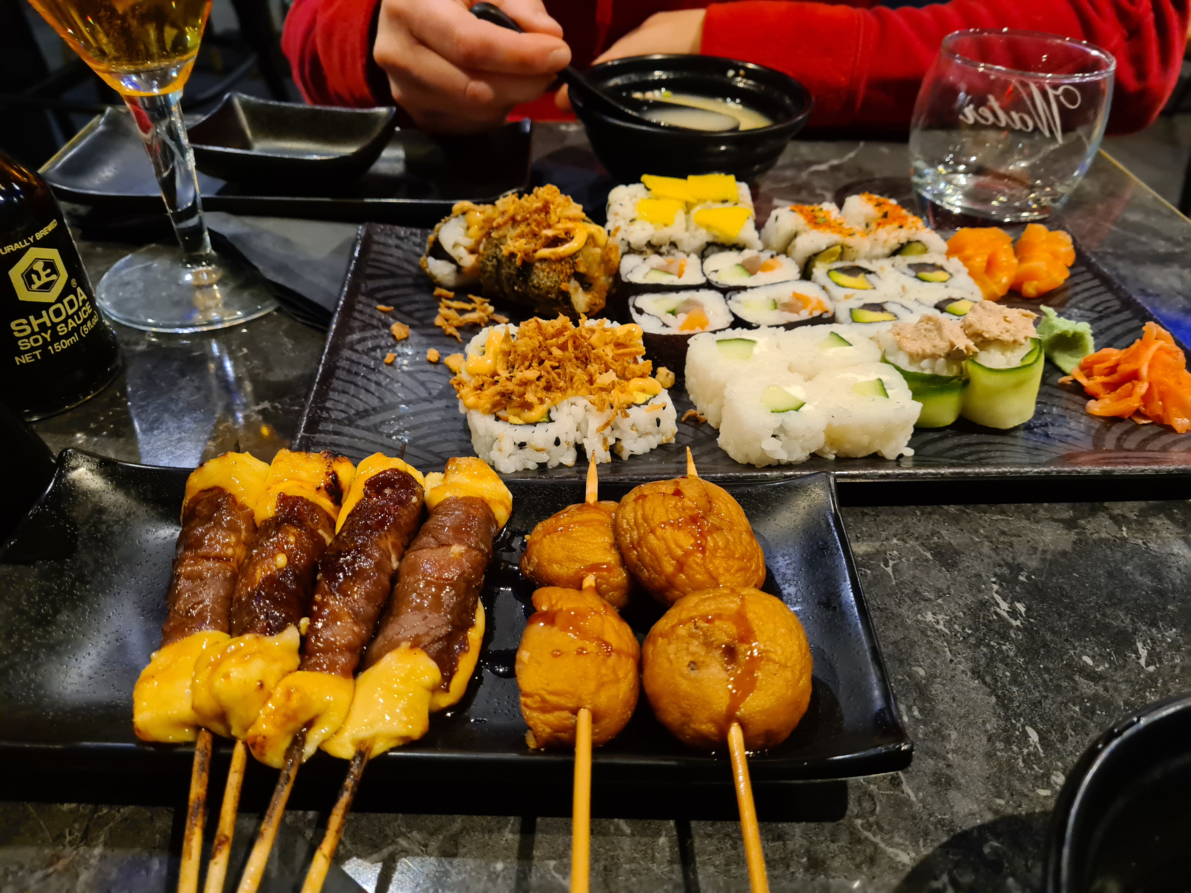 Accueil froid, brochettes boeuf fromage pas assez cuites, brochettes servies tièdes, sushis avec un riz pas assez vinaigré et pâteux. C’est basique peut mieux faire. Tout est servi en même temps du coup plus de place sur la table. C’était peut être un mauvais jour!!!!